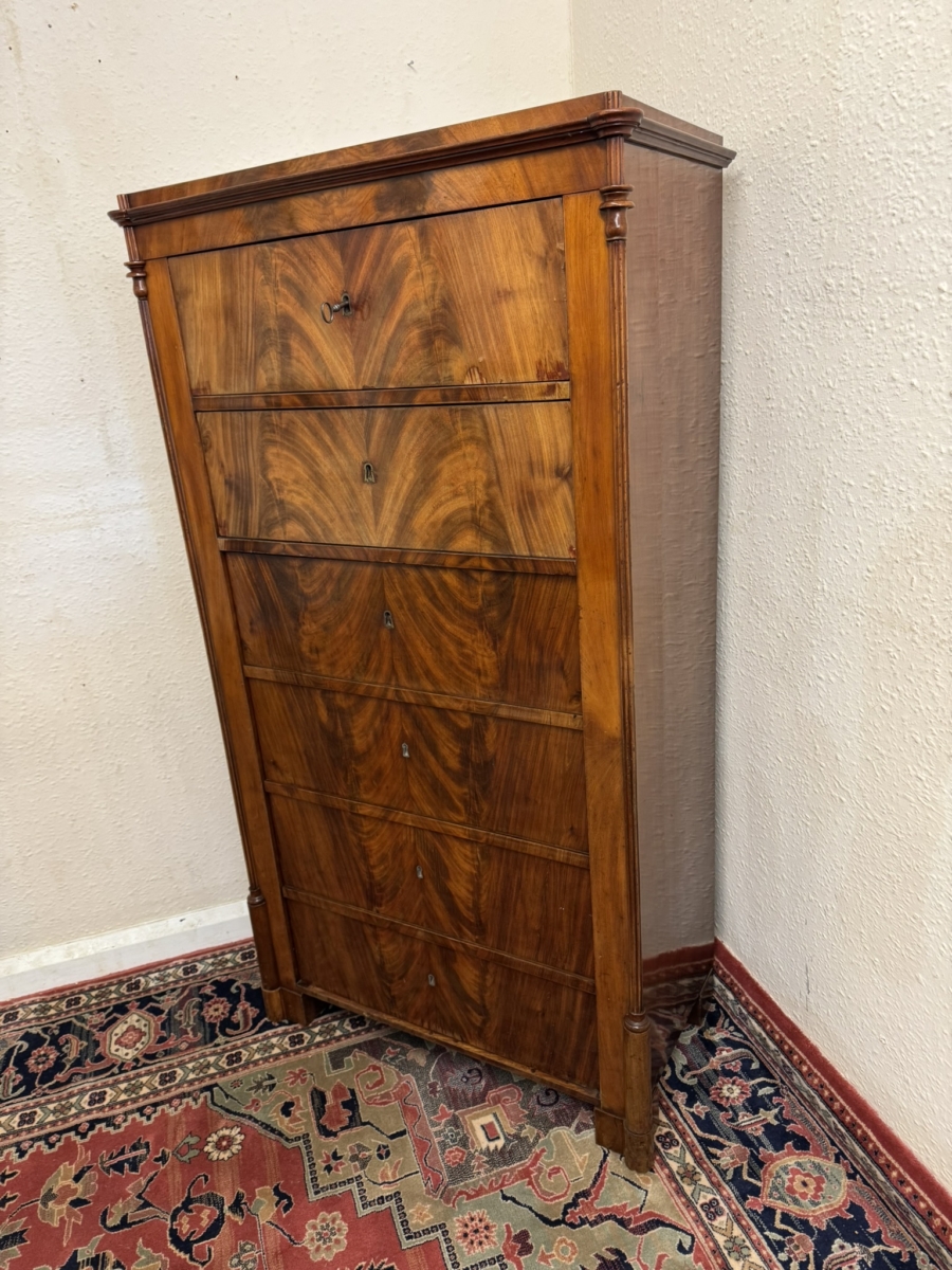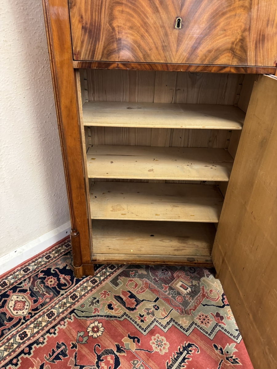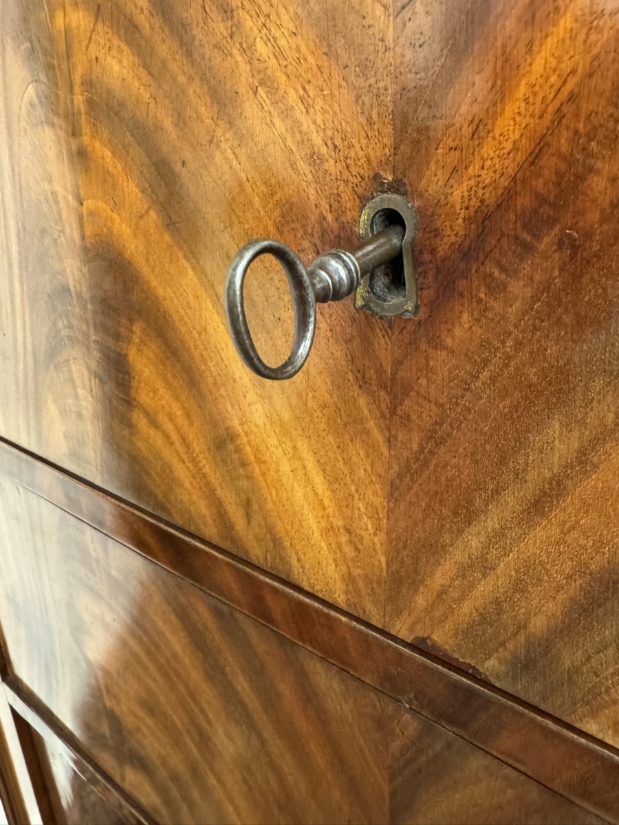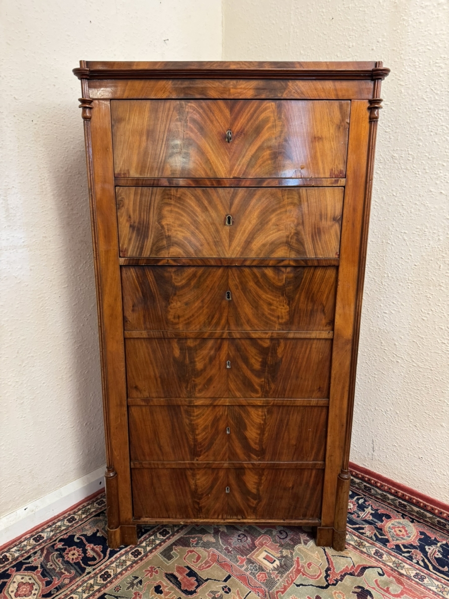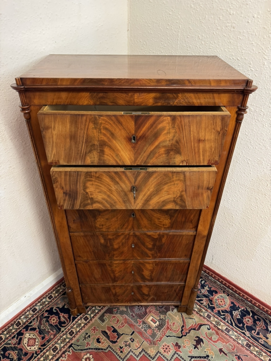 This super cabinet dates circa 1880. Two lockable top drawers sit above dummy drawers, the dummy drawer section is a lockable door, this door opens to reveal three removable shelves. Reeded columns to the sides and standing on traditional block feet.