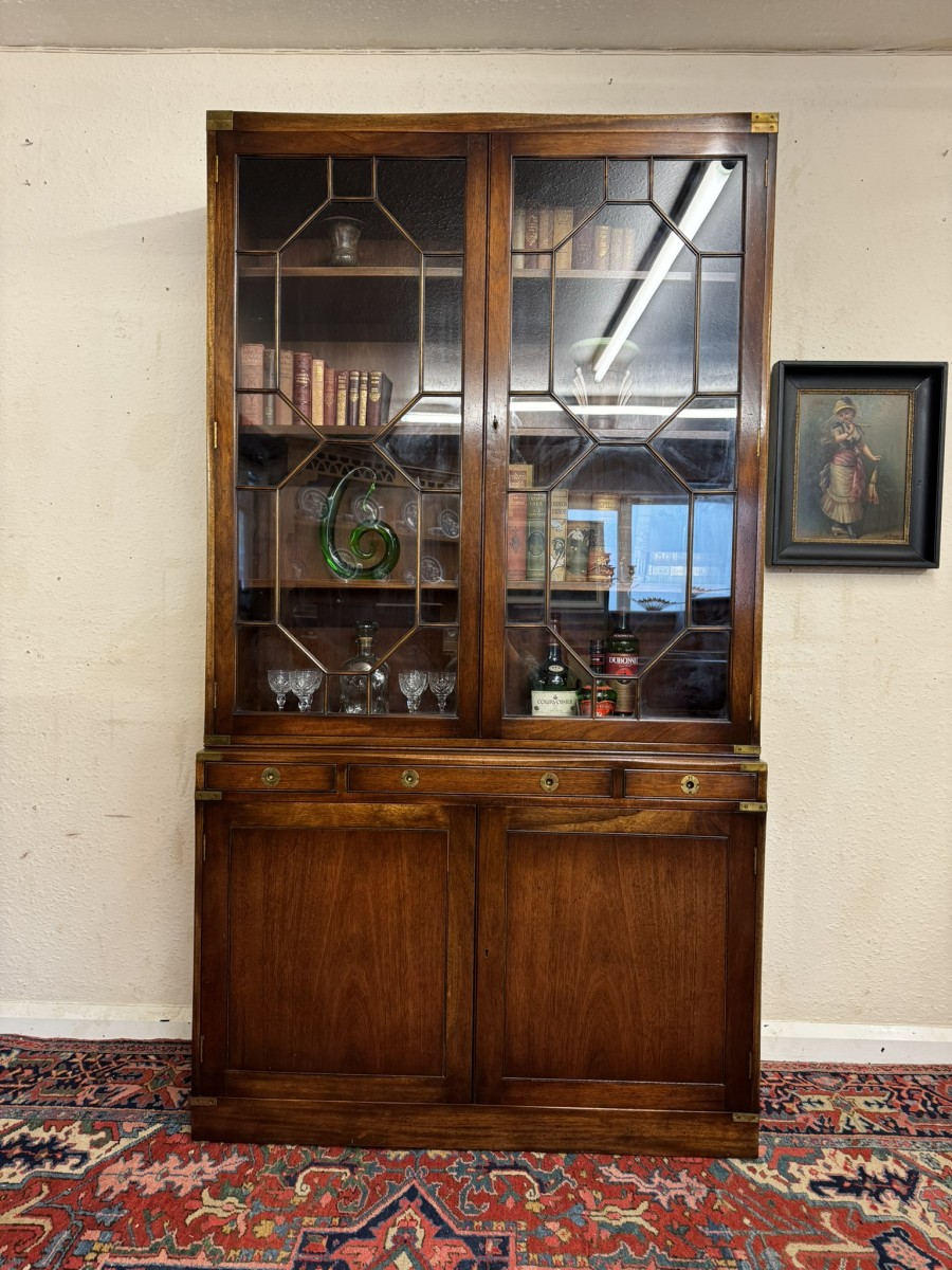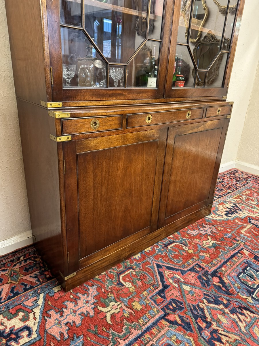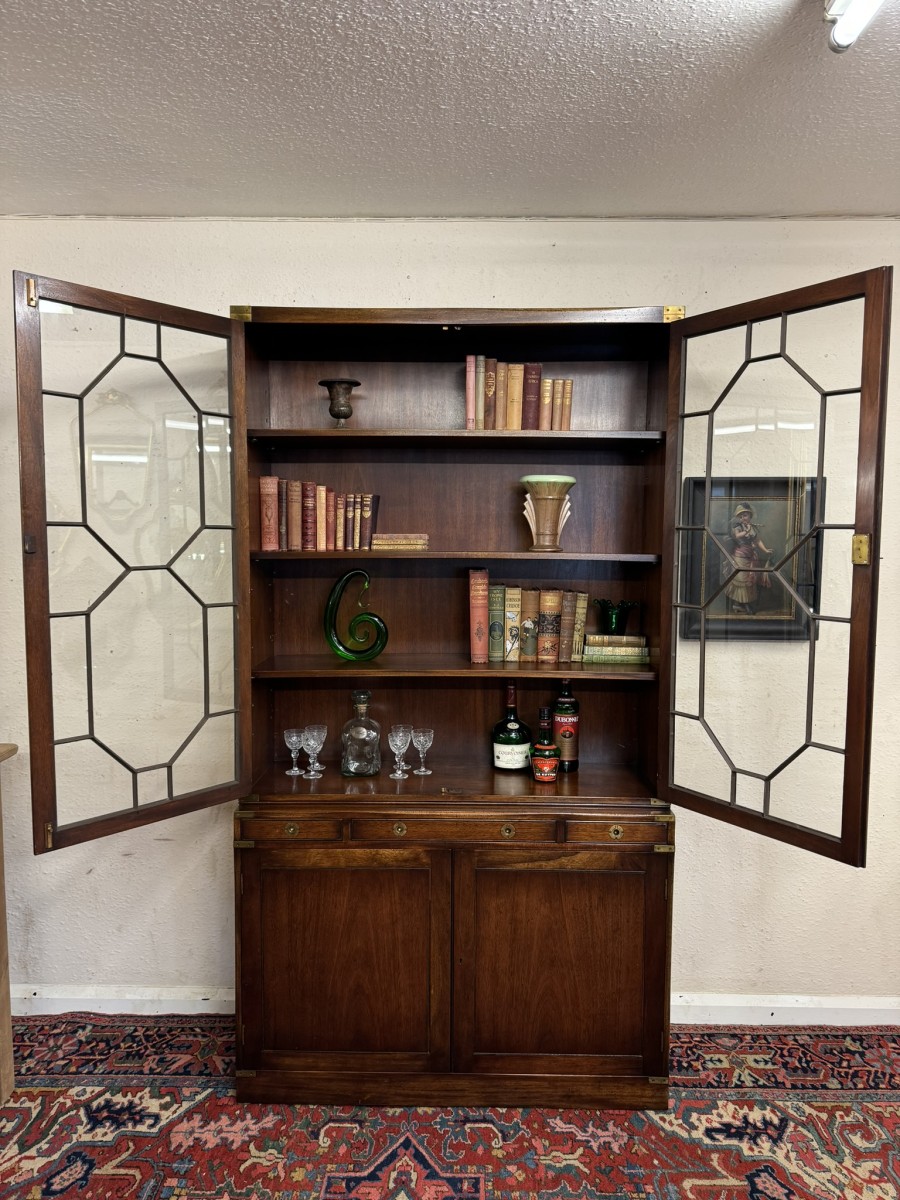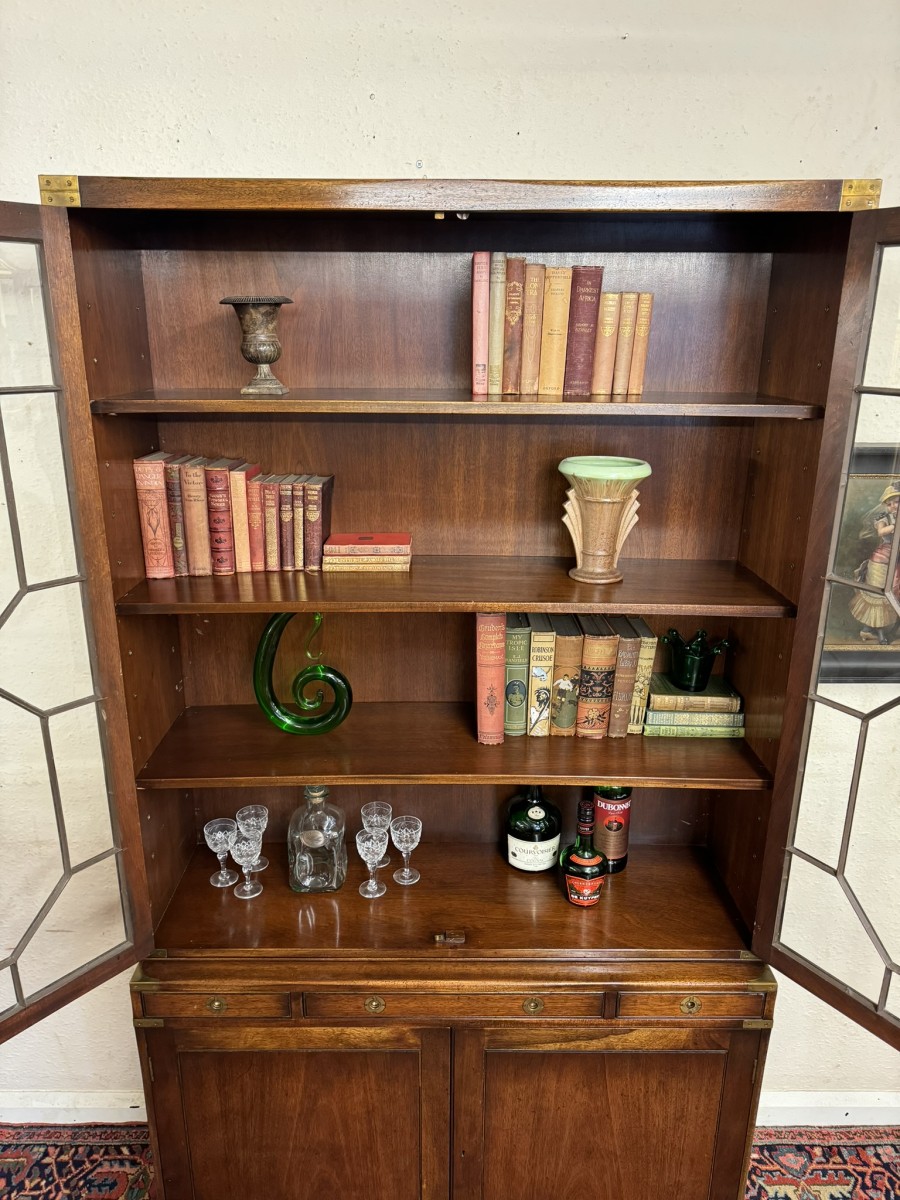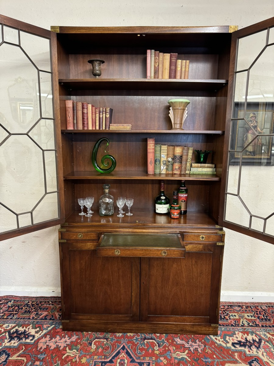 This fabulous bookcase is in excellent condition. The pair of lockable glazed doors have wood barring decoration, they open to reveal three adjustable and removable shelves. The base section has a central leather topped slide which is flanked by a pair of drawers. Below are a pair of cupboard doors, the doors open to reveal a shelf. The bookcase has high quality brass fittings to the corners and handles. A fabulous item of military campaign furniture.