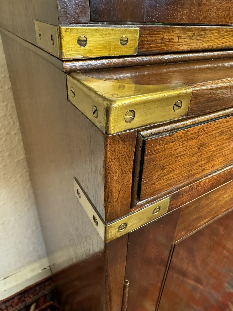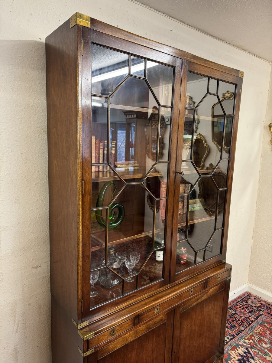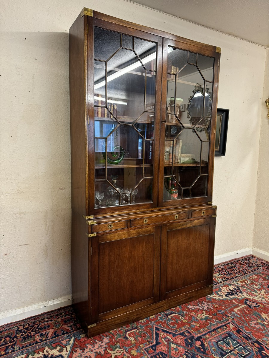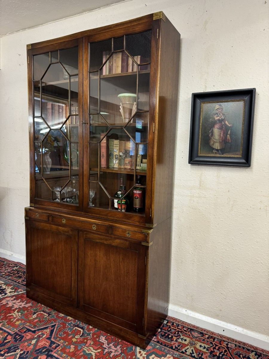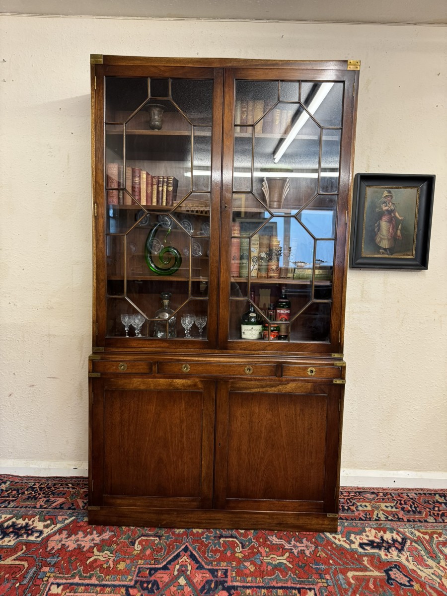 This fabulous bookcase is in excellent condition. The pair of lockable glazed doors have wood barring decoration, they open to reveal three adjustable and removable shelves. The base section has a central leather topped slide which is flanked by a pair of drawers. Below are a pair of cupboard doors, the doors open to reveal a shelf. The bookcase has high quality brass fittings to the corners and handles. A fabulous item of military campaign furniture.