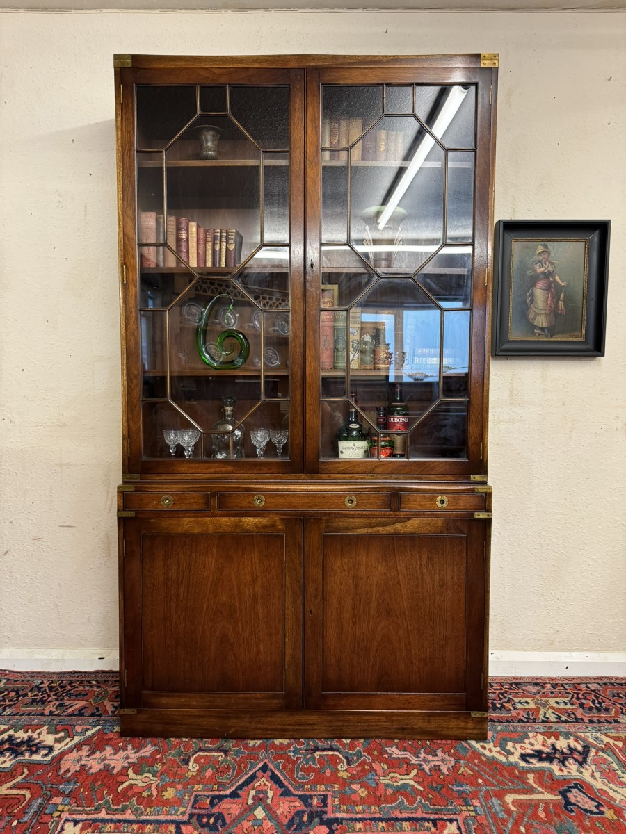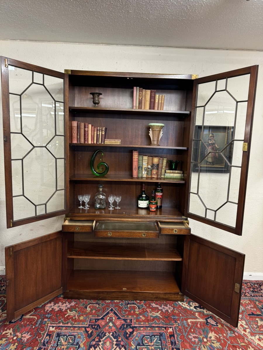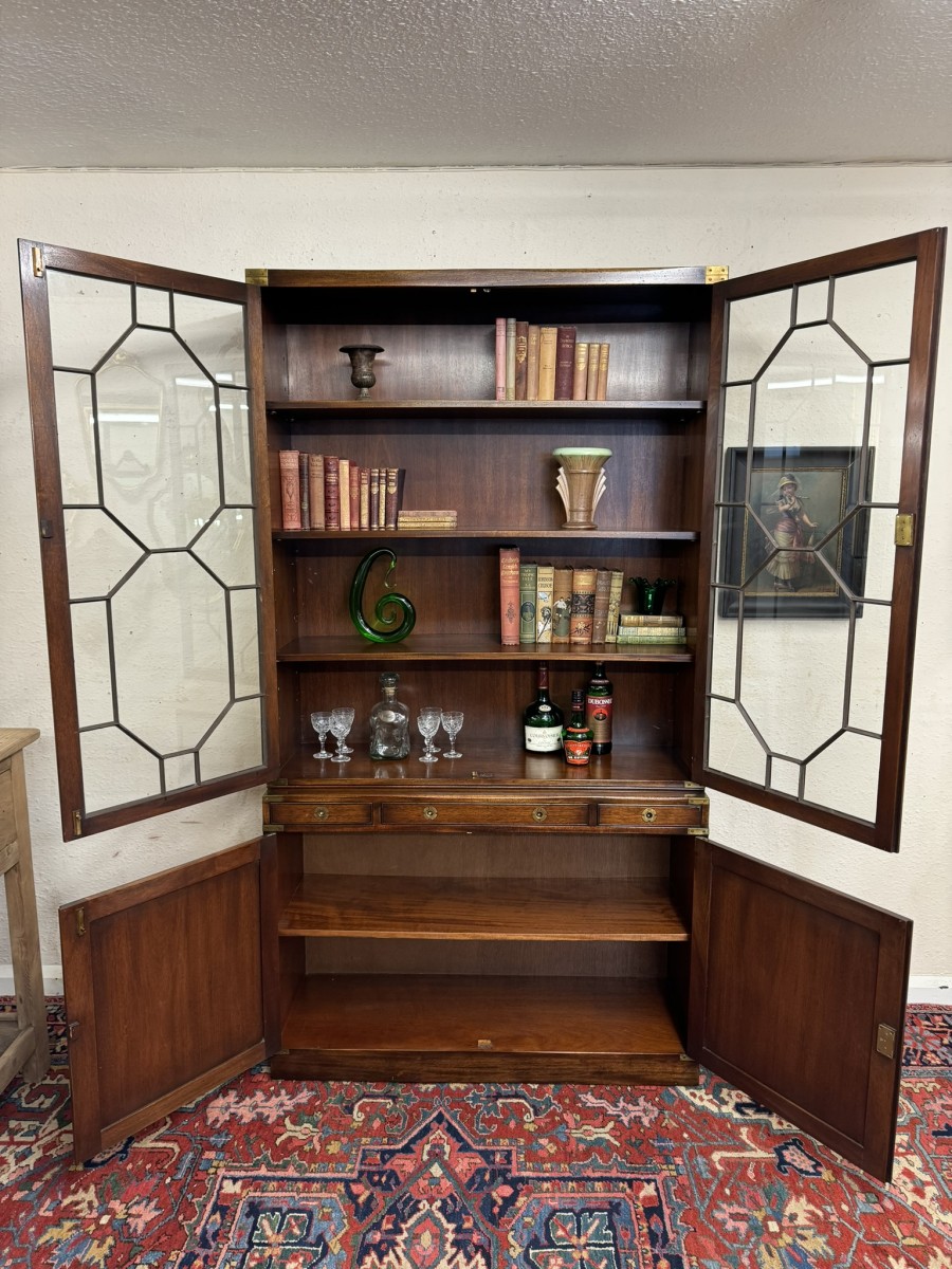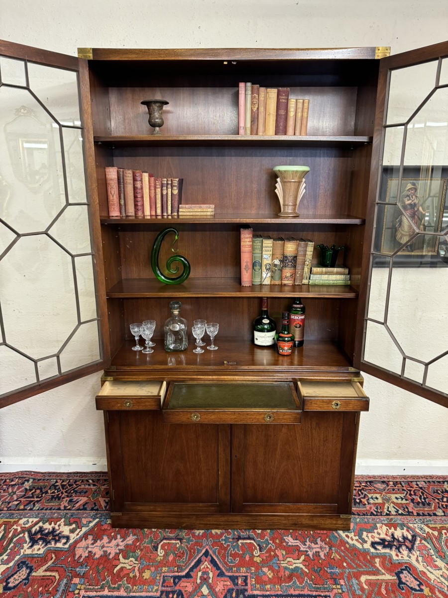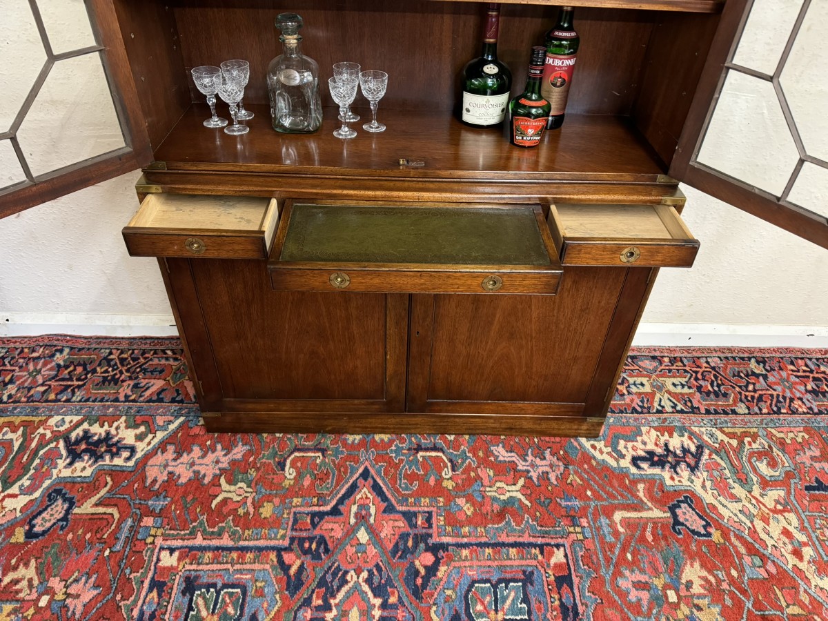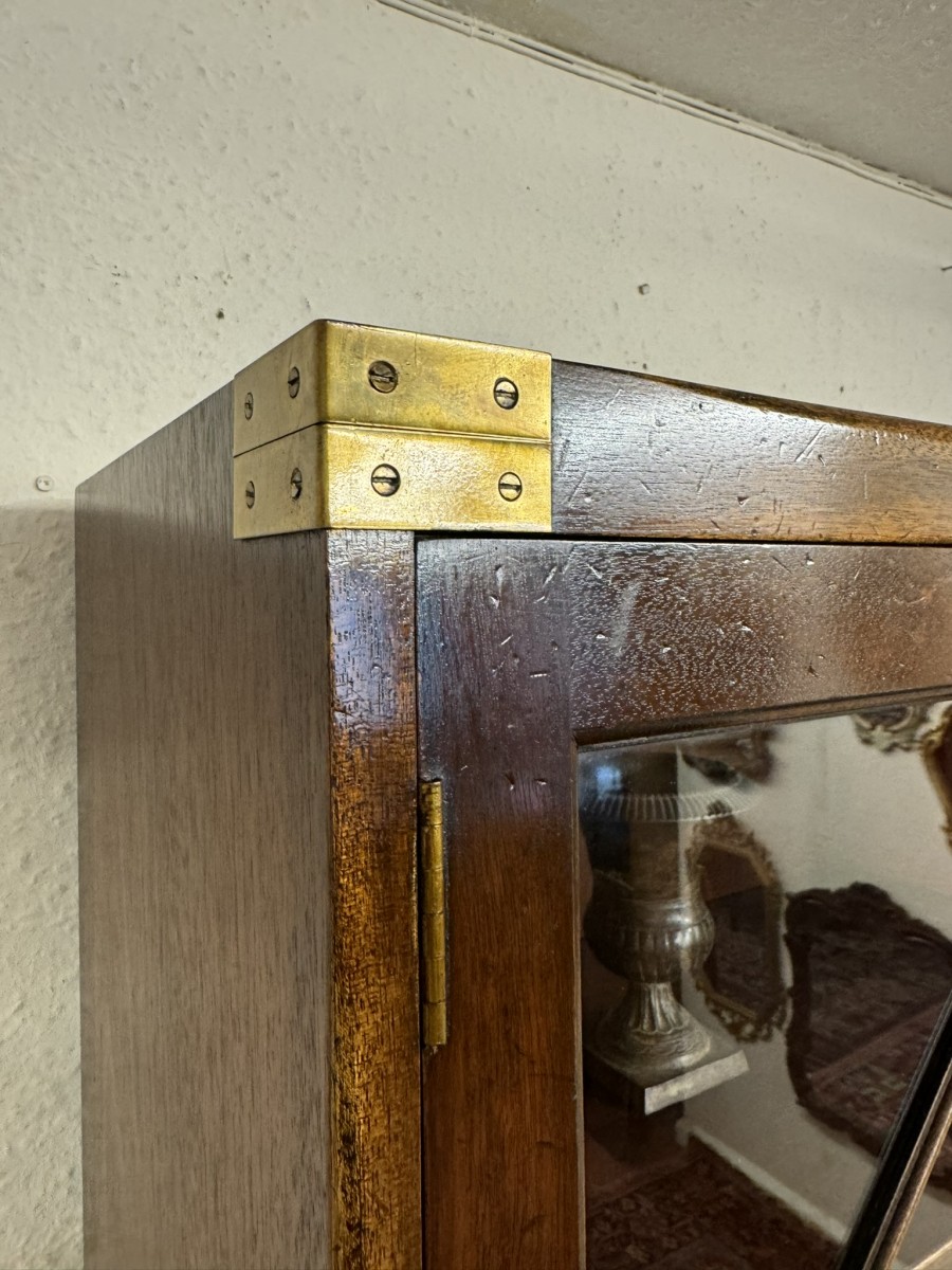 This fabulous bookcase is in excellent condition. The pair of lockable glazed doors have wood barring decoration, they open to reveal three adjustable and removable shelves. The base section has a central leather topped slide which is flanked by a pair of drawers. Below are a pair of cupboard doors, the doors open to reveal a shelf. The bookcase has high quality brass fittings to the corners and handles. A fabulous item of military campaign furniture.
