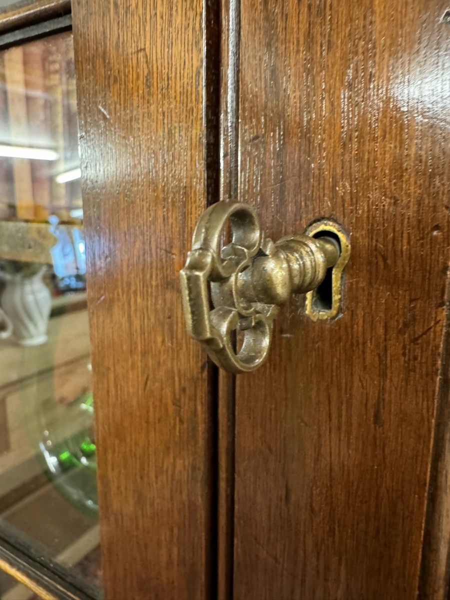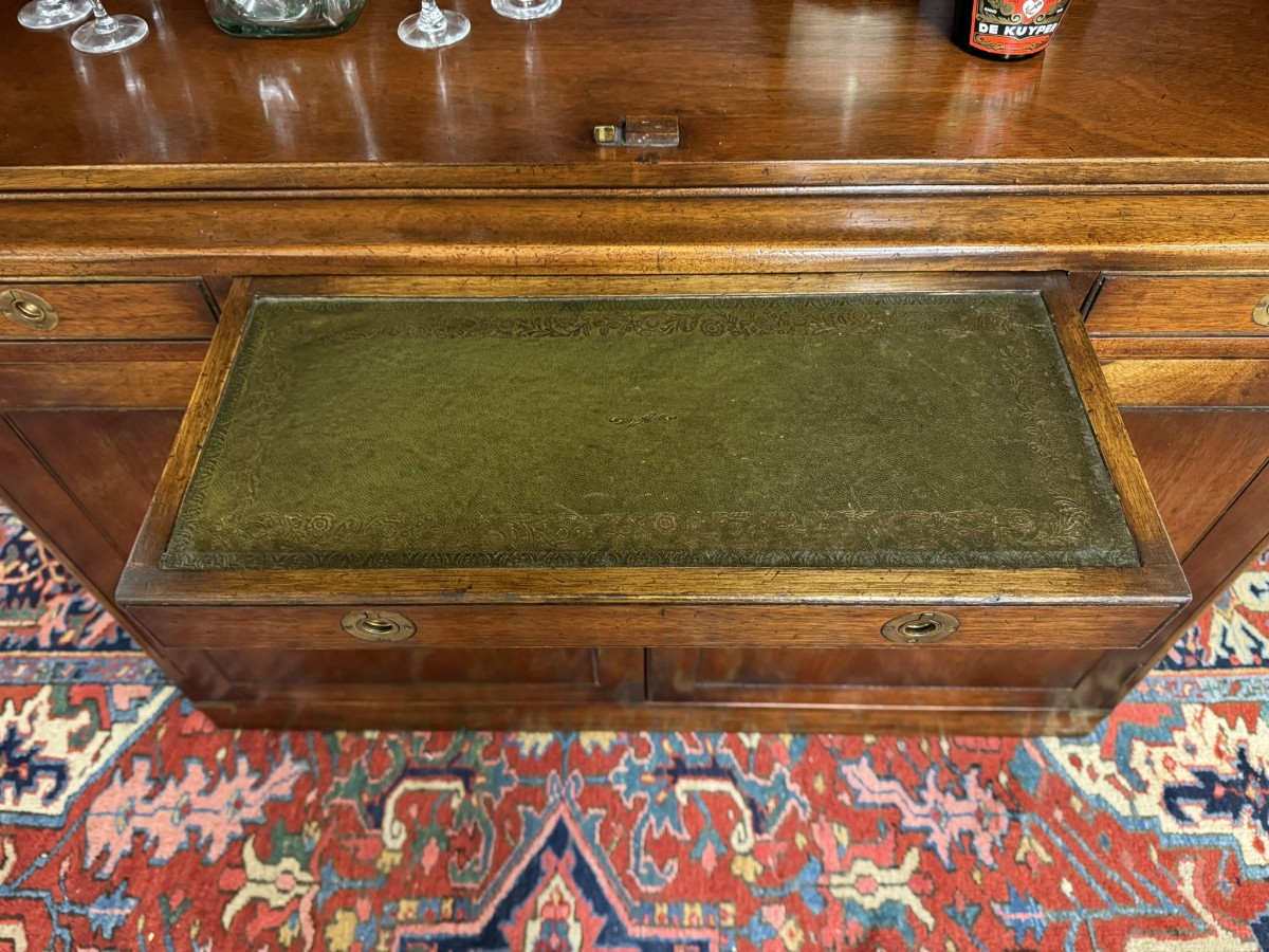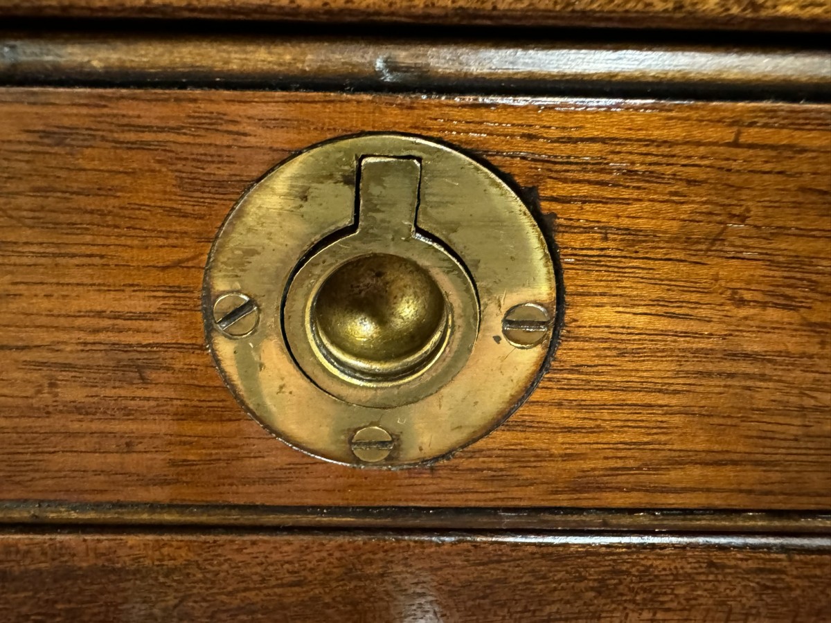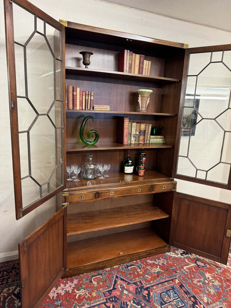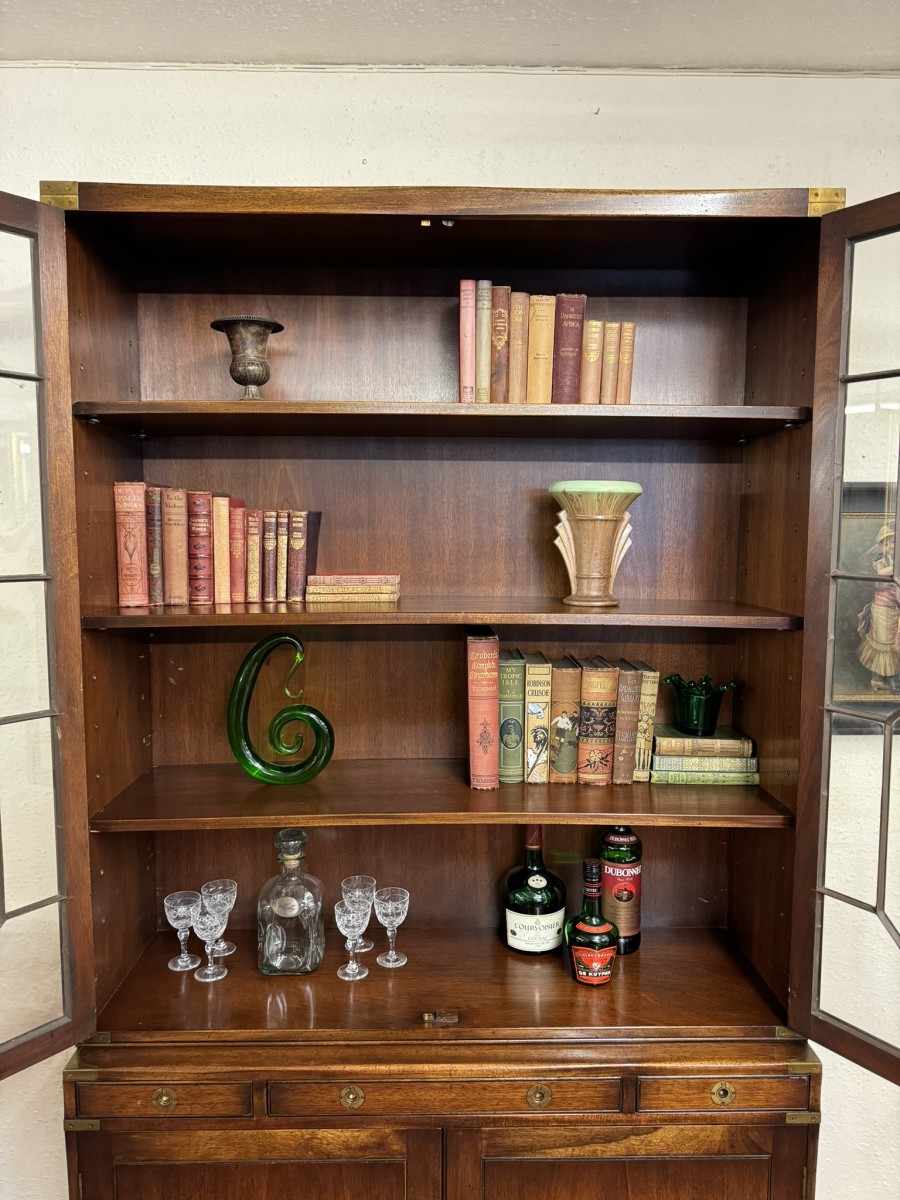 This fabulous bookcase is in excellent condition. The pair of lockable glazed doors have wood barring decoration, they open to reveal three adjustable and removable shelves. The base section has a central leather topped slide which is flanked by a pair of drawers. Below are a pair of cupboard doors, the doors open to reveal a shelf. The bookcase has high quality brass fittings to the corners and handles. A fabulous item of military campaign furniture.