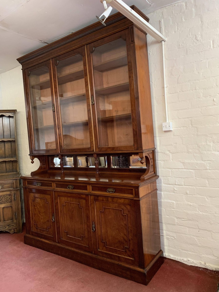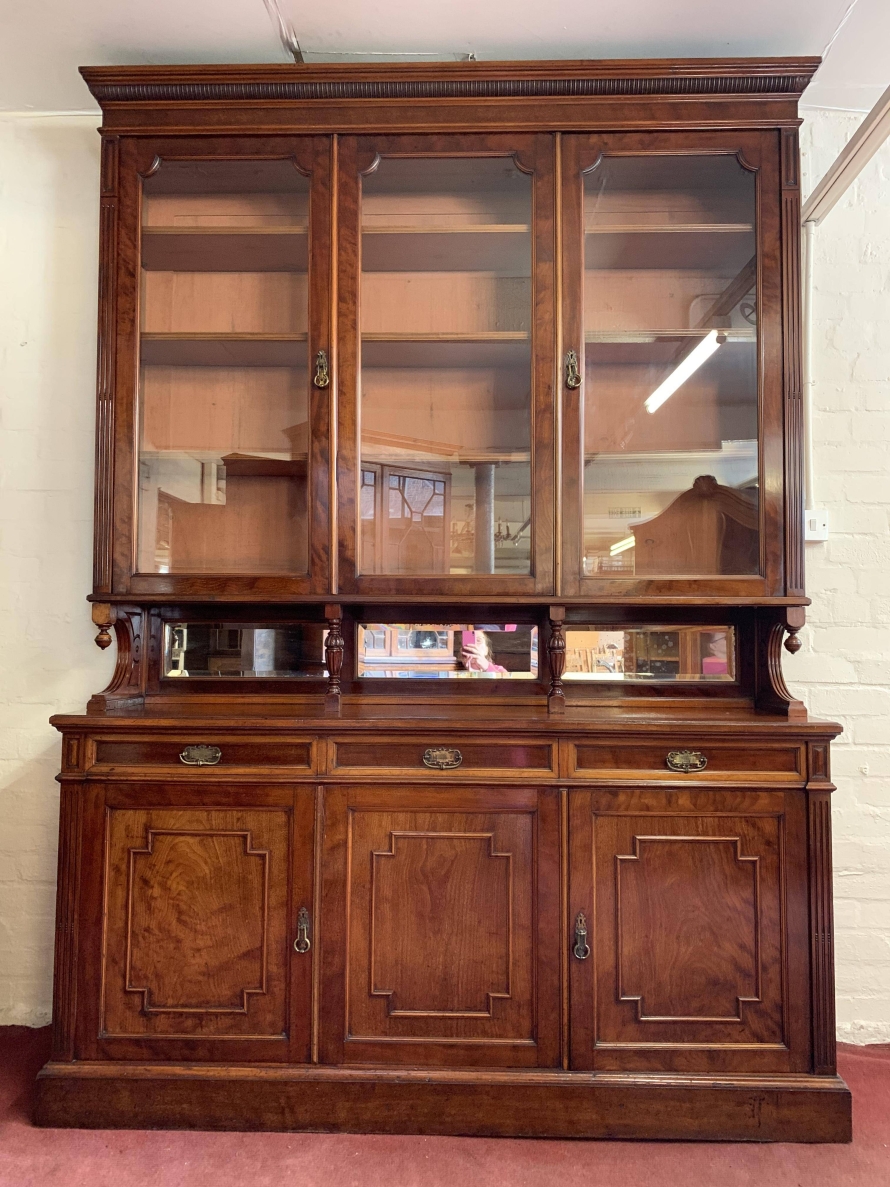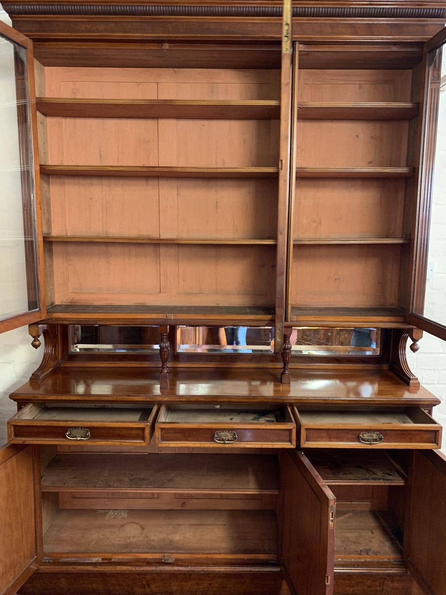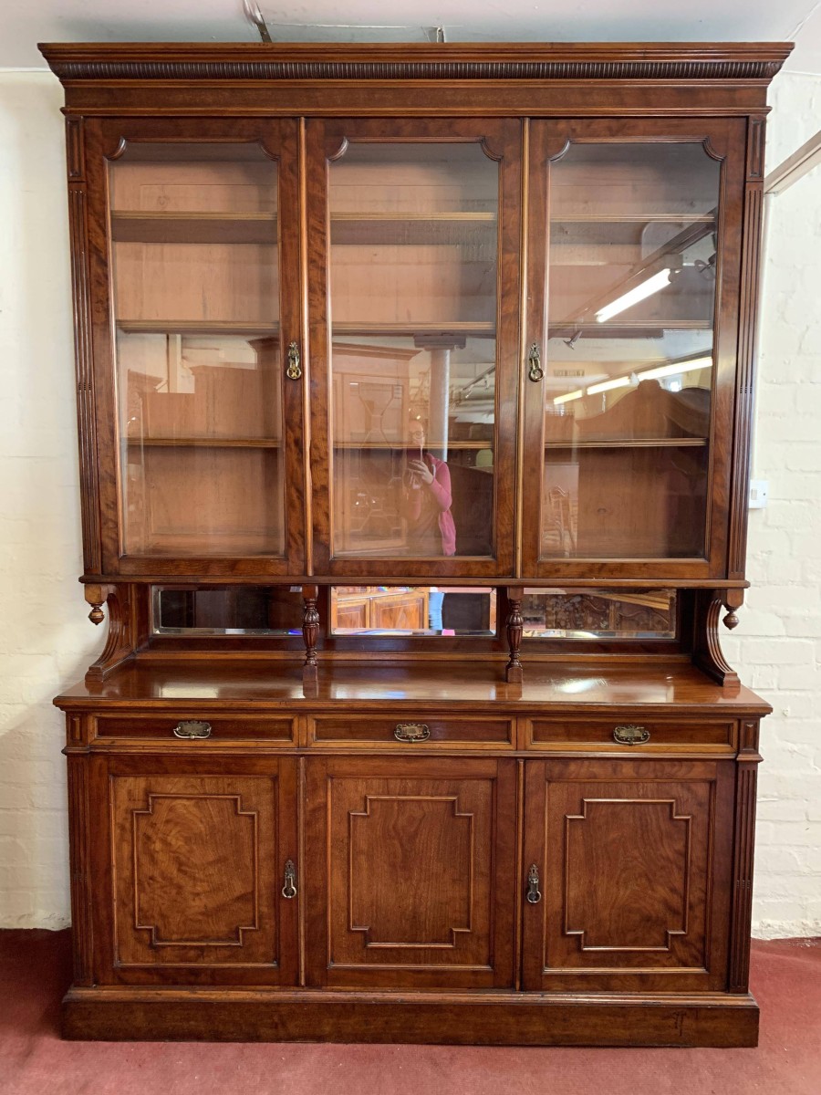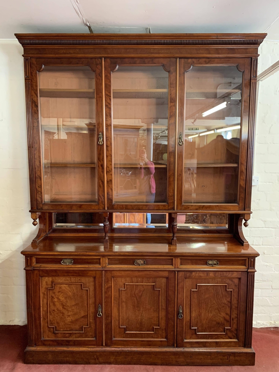 We are delighted to offer this wonderful Victorian library bookcase made from the finest mahogany which is in excellent condition. The removable stepped cornice has a central decorative carving, below are three lockable glazed doors. The glazed doors open to reveal three adjustable and removable shelves. The glazed doors sit above a bevel edged mirror back rail which has carved shaped sides with finials and a pair of fine turned central supports. Below are three drawers, each drawer having brass handle. These drawers sit above three cupboard doors, the cupboard doors open to reveal an adjustable and removable shelf. To the sides of the glazed doors and the bottom drawers is carved reeded decoration. This stunning Victorian library bookcase sits on a traditional plinth base. A fine example of English Victorian quality functional furniture.