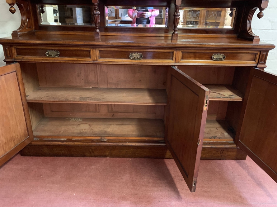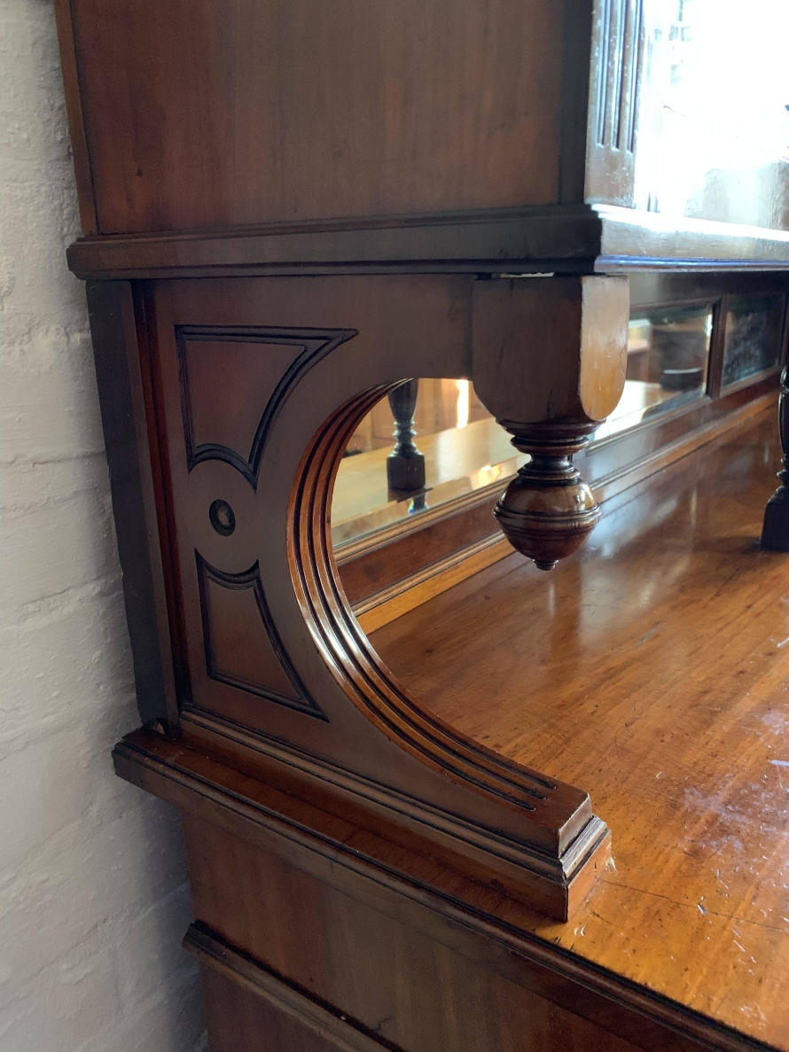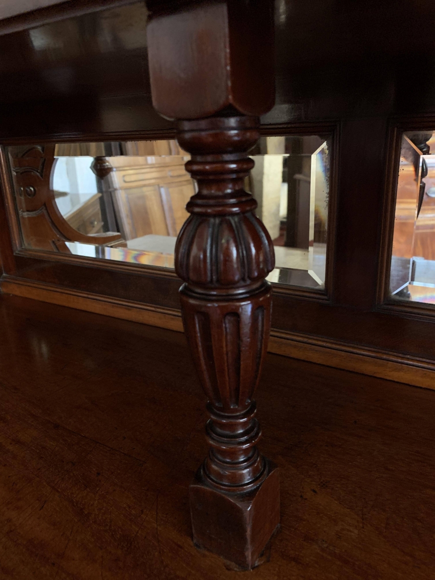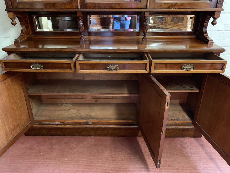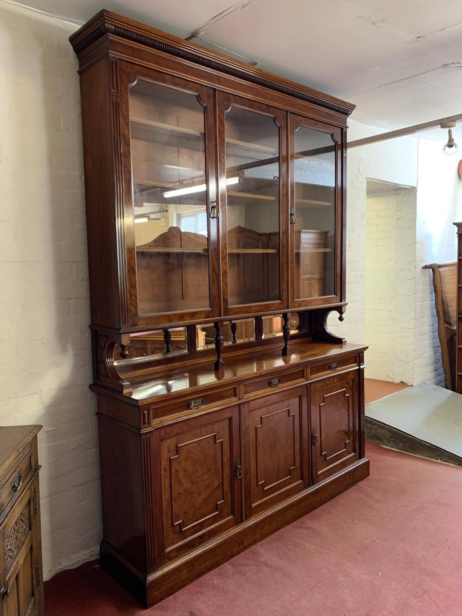 We are delighted to offer this wonderful Victorian library bookcase made from the finest mahogany which is in excellent condition. The removable stepped cornice has a central decorative carving, below are three lockable glazed doors. The glazed doors open to reveal three adjustable and removable shelves. The glazed doors sit above a bevel edged mirror back rail which has carved shaped sides with finials and a pair of fine turned central supports. Below are three drawers, each drawer having brass handle. These drawers sit above three cupboard doors, the cupboard doors open to reveal an adjustable and removable shelf. To the sides of the glazed doors and the bottom drawers is carved reeded decoration. This stunning Victorian library bookcase sits on a traditional plinth base. A fine example of English Victorian quality functional furniture.