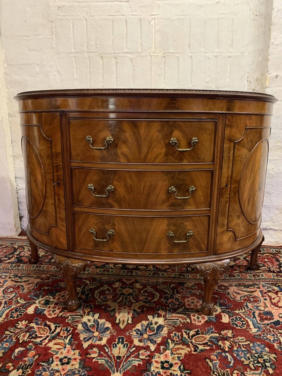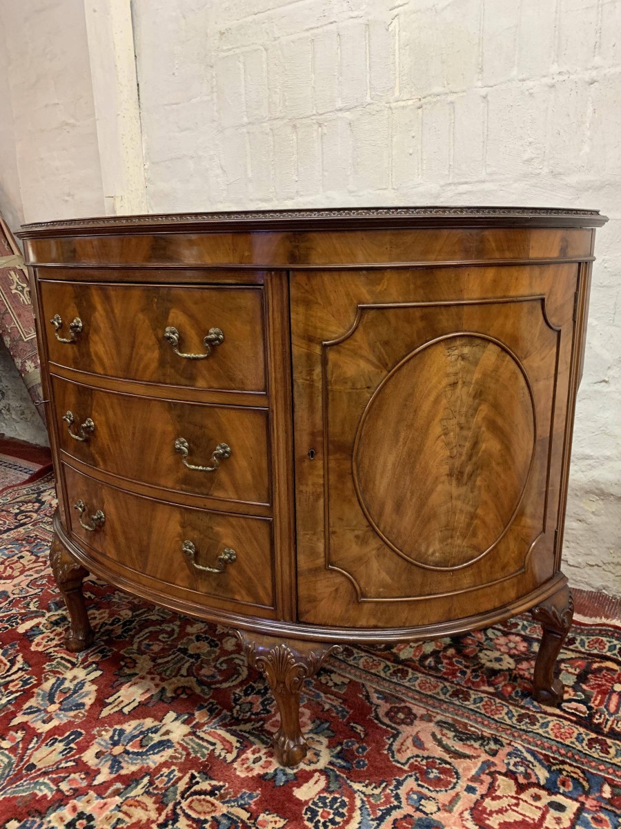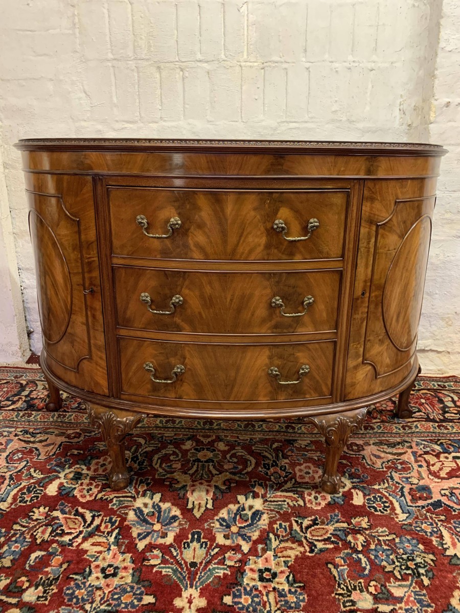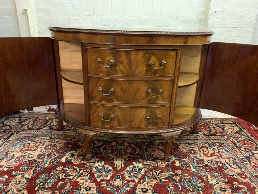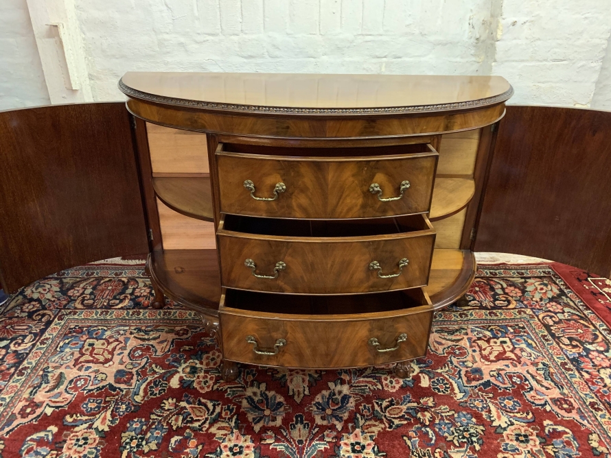 This fabulous quality mahogany demi-lune dresser was made by the renowned Waring & Gillow furniture company. Demi-lune in shape, the oversailing top has a fabulous carved edging. Below are three curved drawers, each drawer having a pair of brass handles. The drawers are flanked by a pair of curved lockable cupboard doors, the doors open to reveal a shelf. This stunning sideboard/dresser stands on four impressive carved cabriole legs on claw and ball feet.
