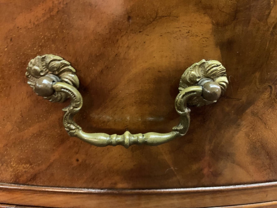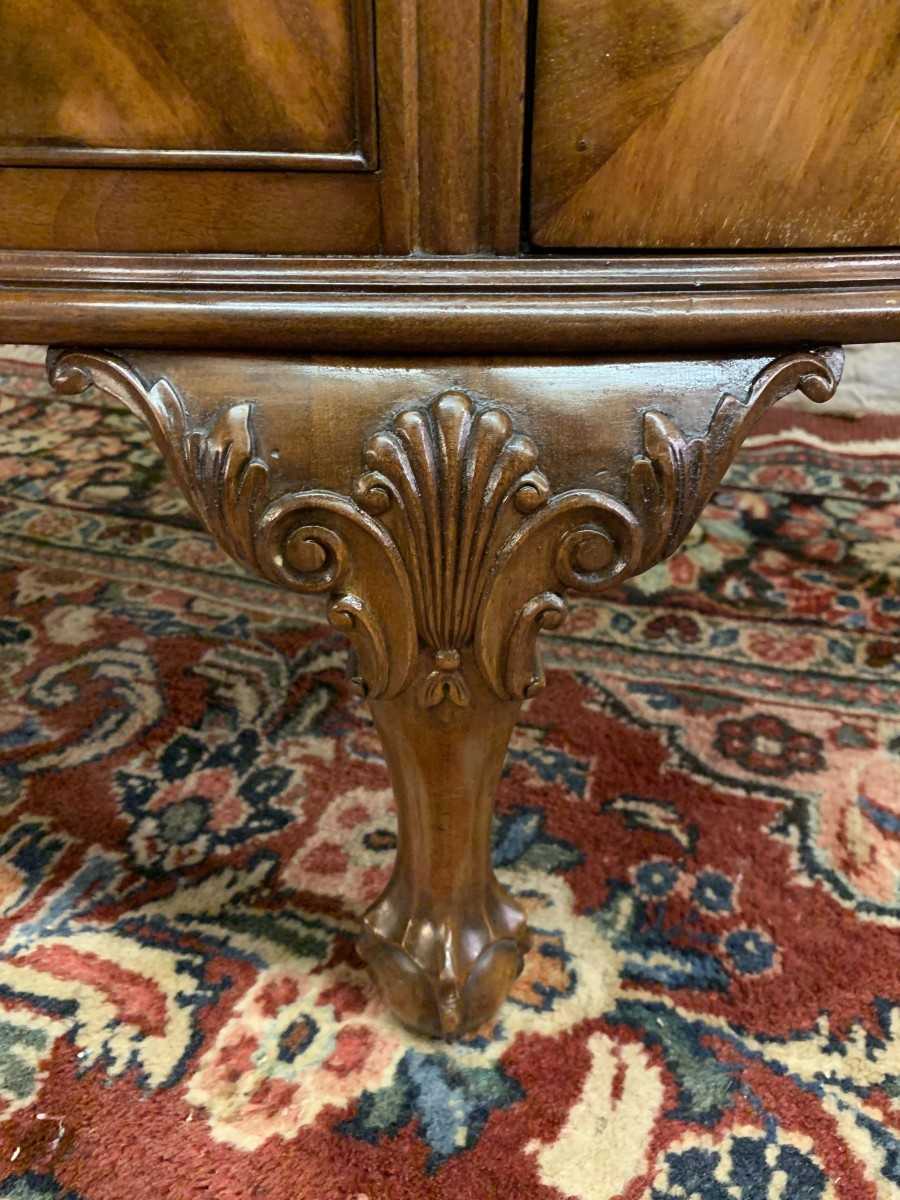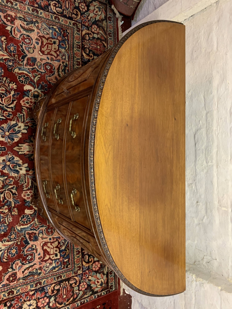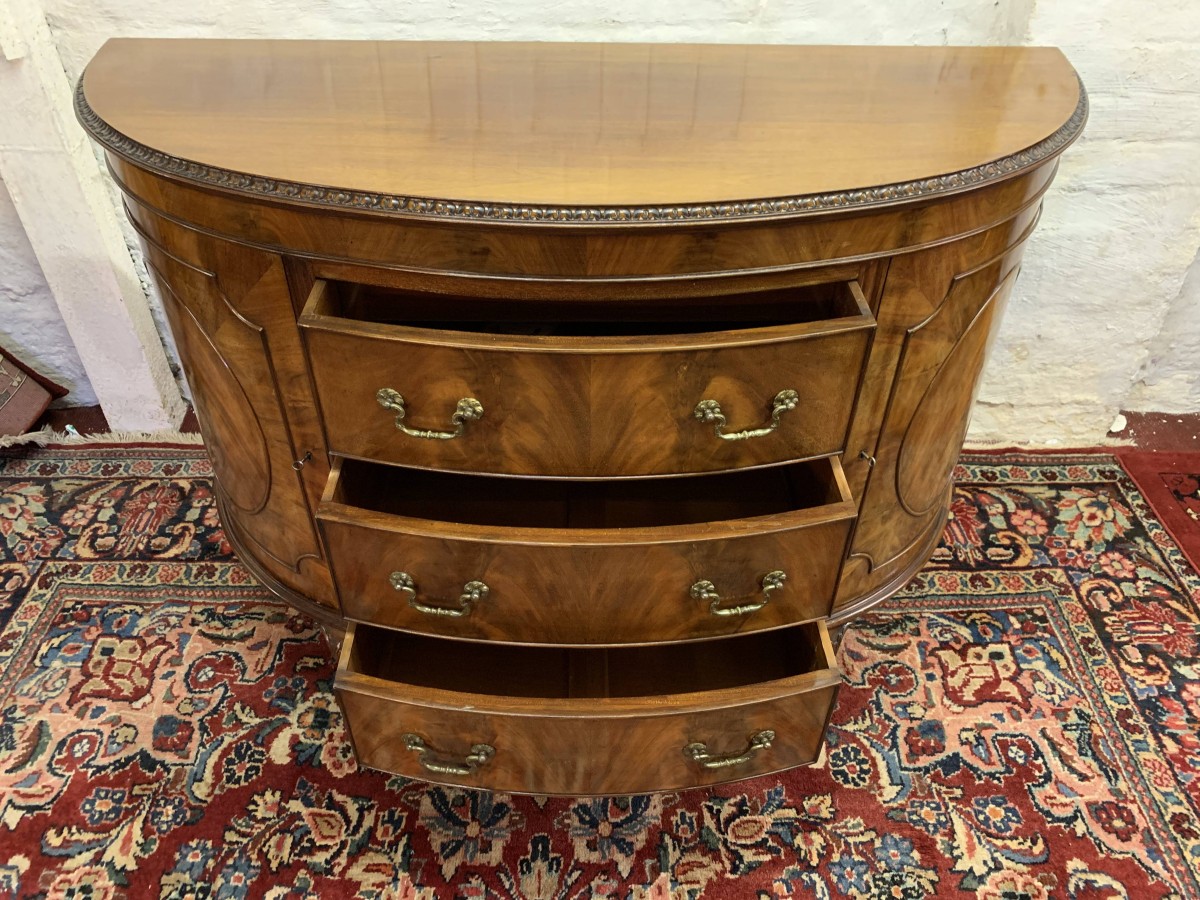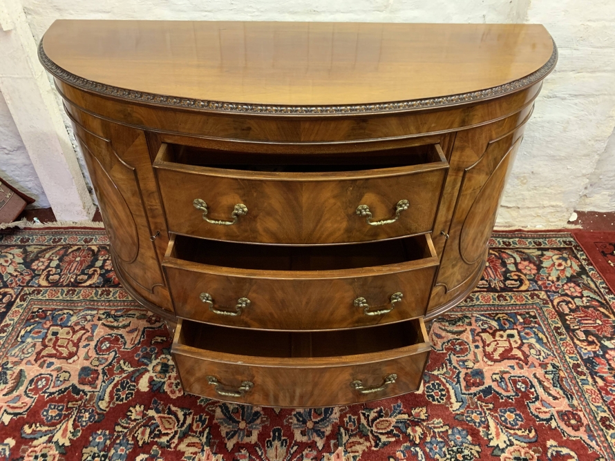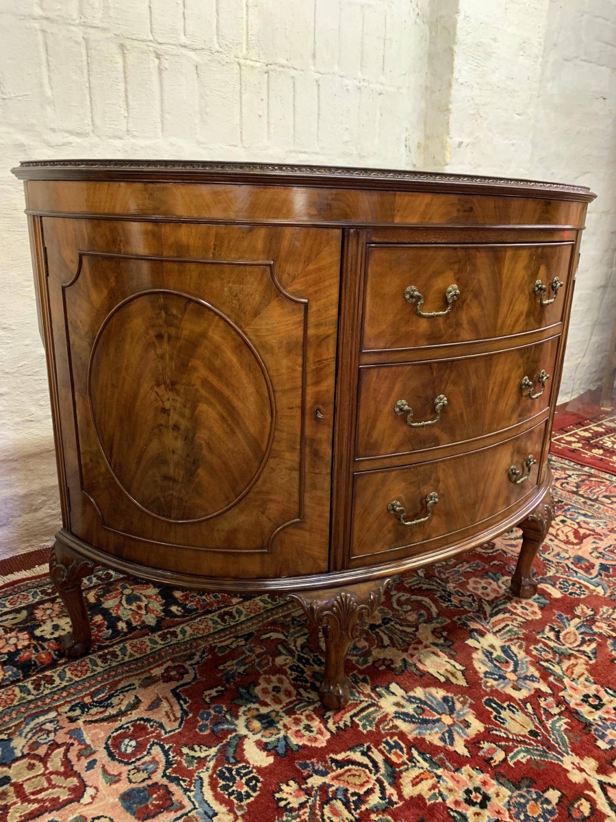 This fabulous quality mahogany demi-lune dresser was made by the renowned Waring & Gillow furniture company. Demi-lune in shape, the oversailing top has a fabulous carved edging. Below are three curved drawers, each drawer having a pair of brass handles. The drawers are flanked by a pair of curved lockable cupboard doors, the doors open to reveal a shelf. This stunning sideboard/dresser stands on four impressive carved cabriole legs on claw and ball feet.