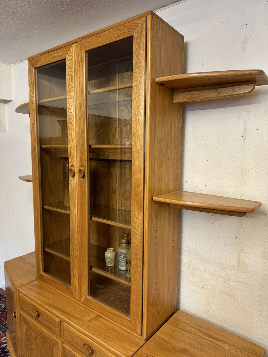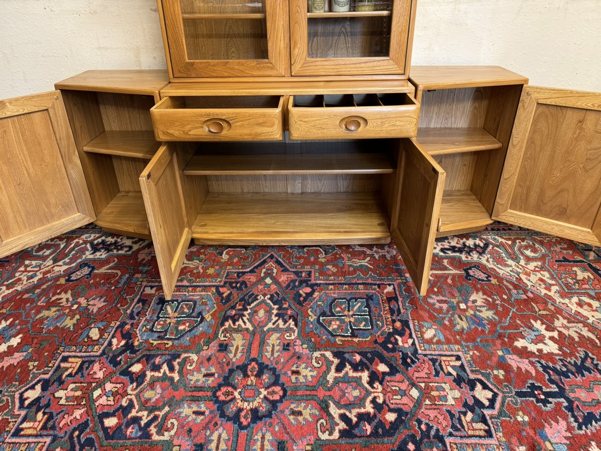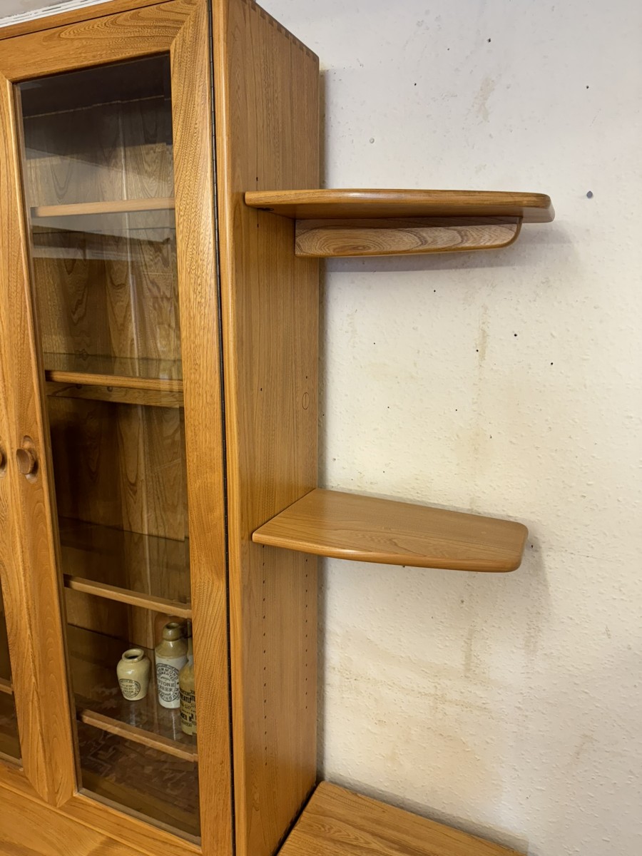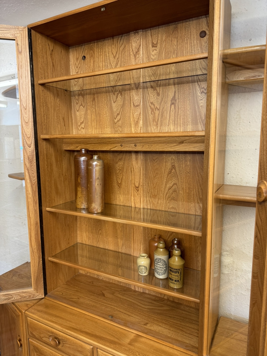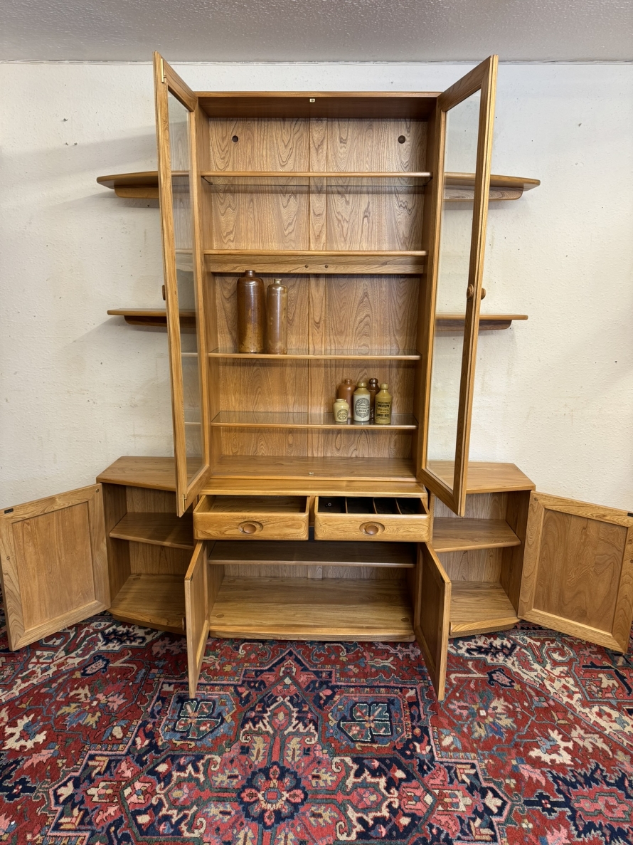 This fantastic quality blonde Ercol cabinet is in excellent condition. The glazed central section has four glass shelves, three of which are adjustable. To the sides are four floating display shelves. The central section base having two drawers above two cupboard doors, the doors open to reveal an adjustable shelf. The central section is flanked by a pair of canted side cupboards, each cupboard opens to reveal an adjustable shelf. A stunning item of furniture produced by the renowned Ercol furniture manufacturers.