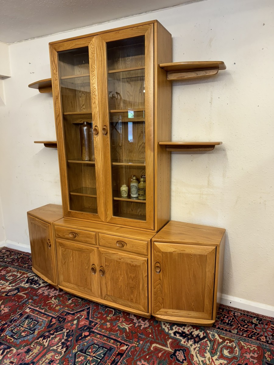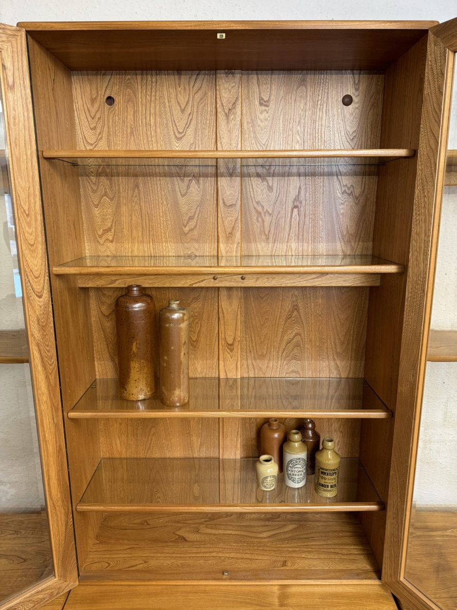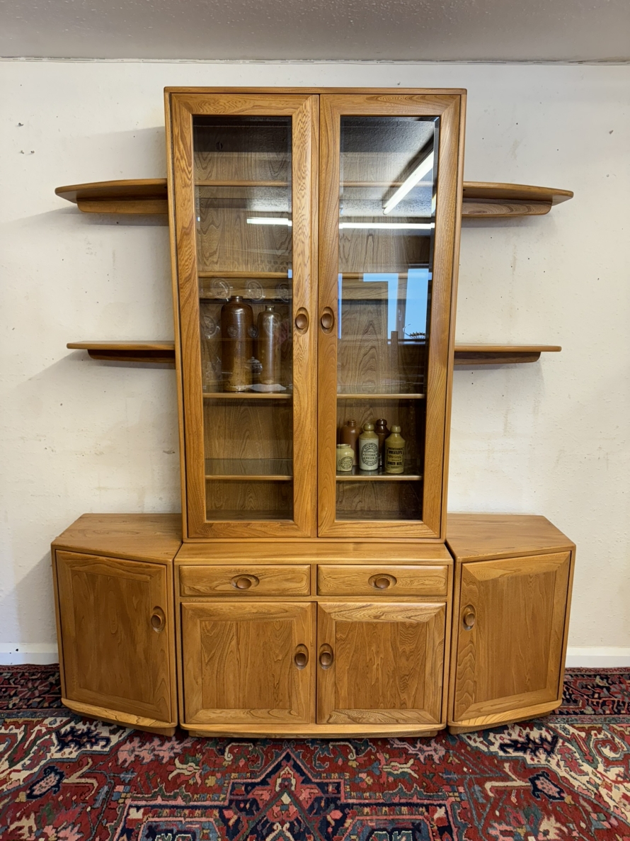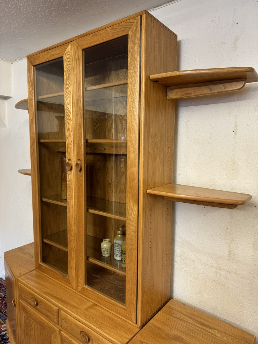 This fantastic quality blonde Ercol cabinet is in excellent condition. The glazed central section has four glass shelves, three of which are adjustable. To the sides are four floating display shelves. The central section base having two drawers above two cupboard doors, the doors open to reveal an adjustable shelf. The central section is flanked by a pair of canted side cupboards, each cupboard opens to reveal an adjustable shelf. A stunning item of furniture produced by the renowned Ercol furniture manufacturers.