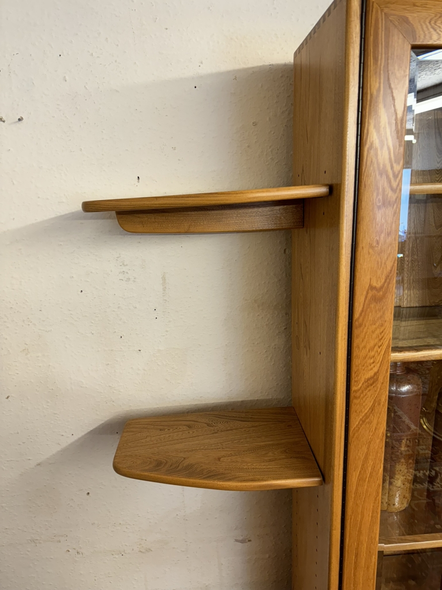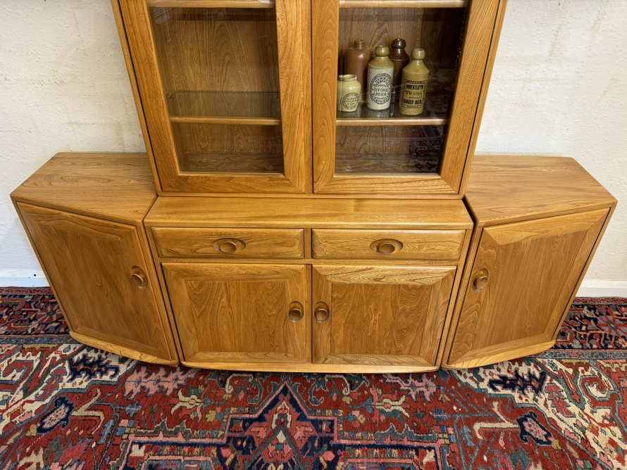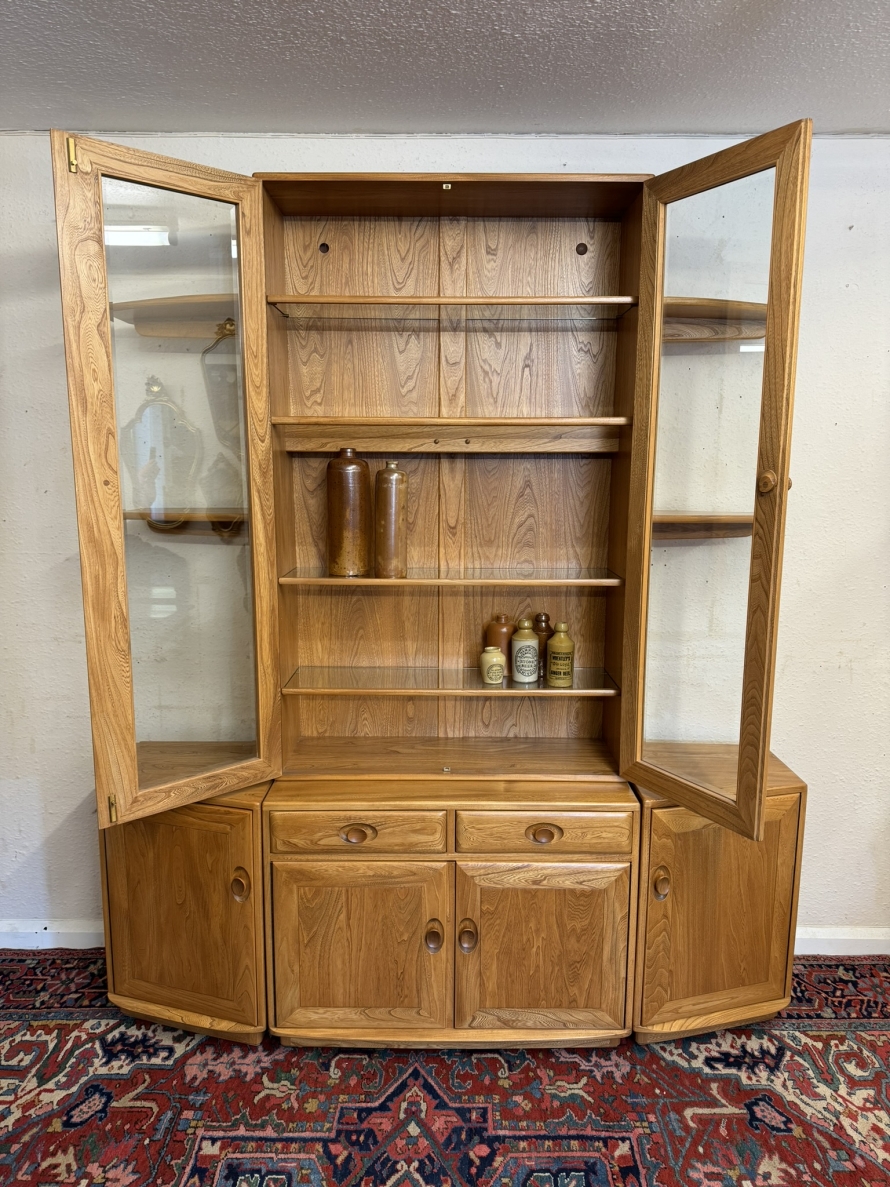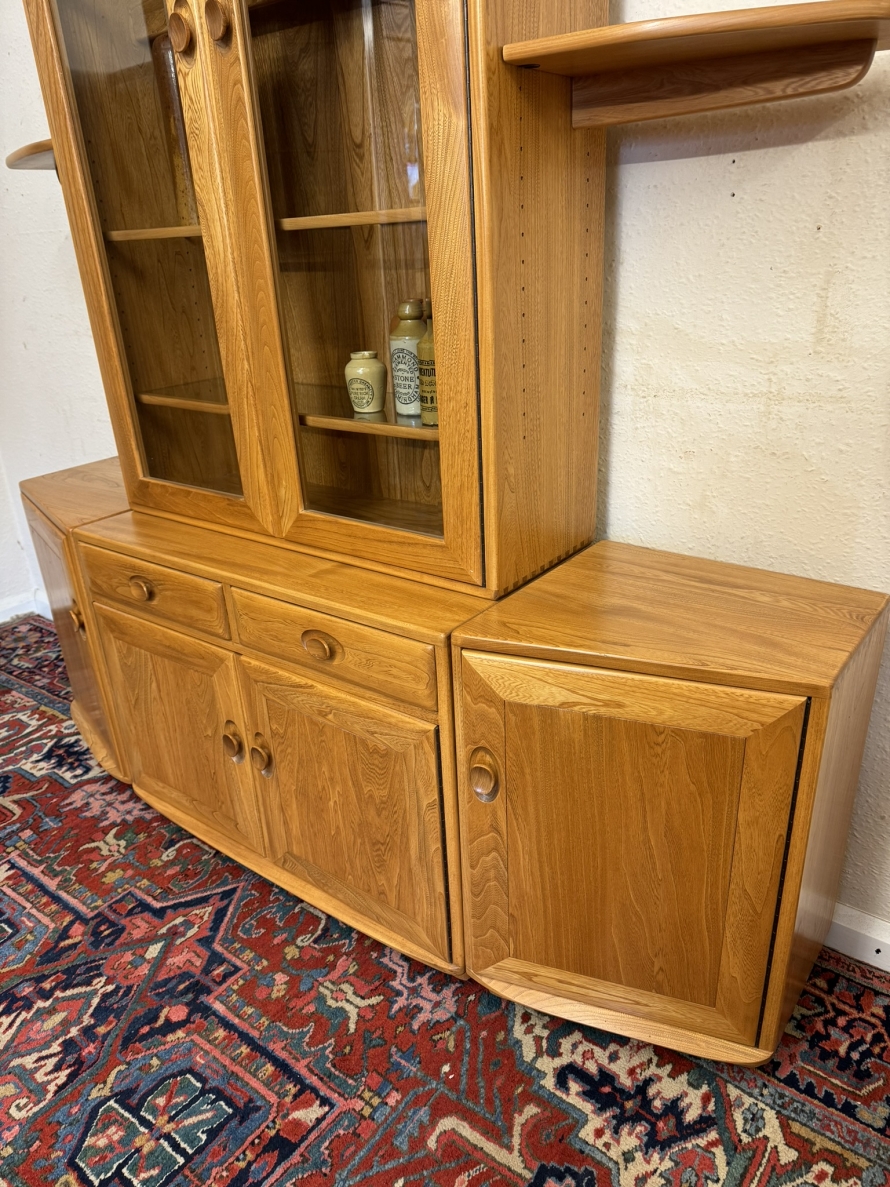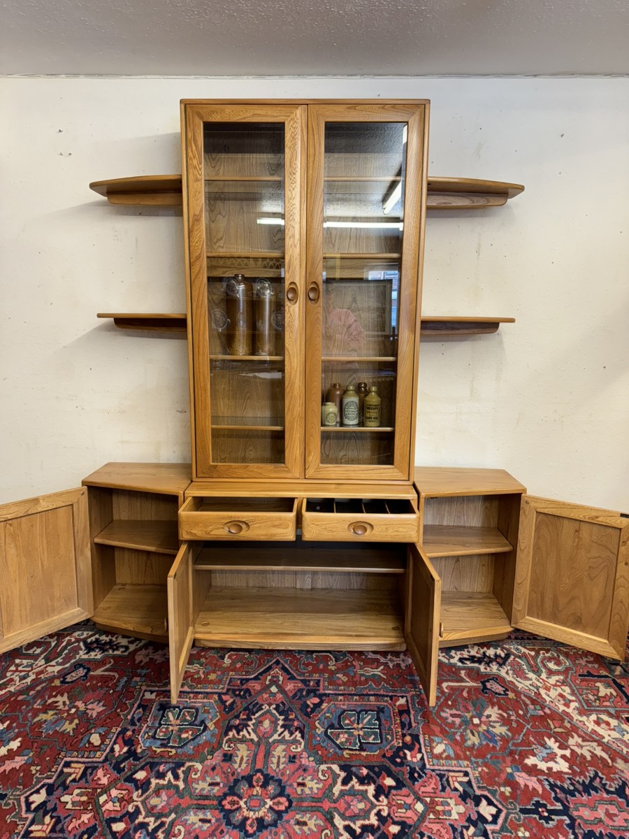 This fantastic quality blonde Ercol cabinet is in excellent condition. The glazed central section has four glass shelves, three of which are adjustable. To the sides are four floating display shelves. The central section base having two drawers above two cupboard doors, the doors open to reveal an adjustable shelf. The central section is flanked by a pair of canted side cupboards, each cupboard opens to reveal an adjustable shelf. A stunning item of furniture produced by the renowned Ercol furniture manufacturers.