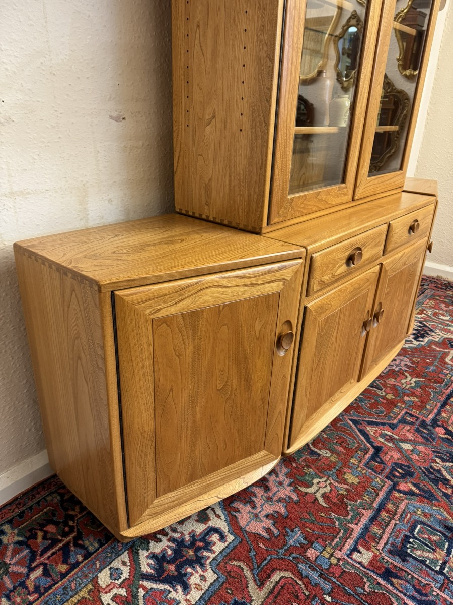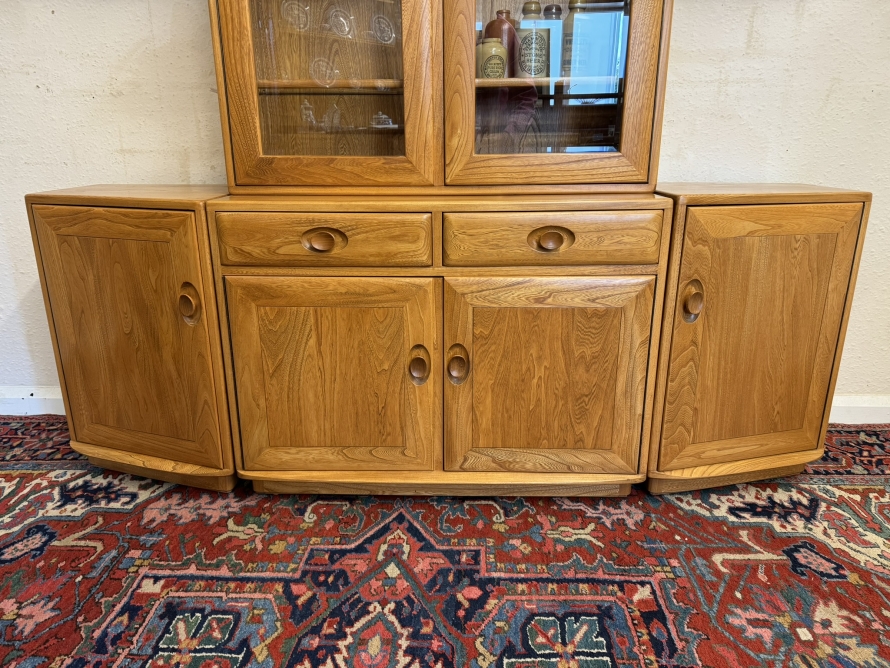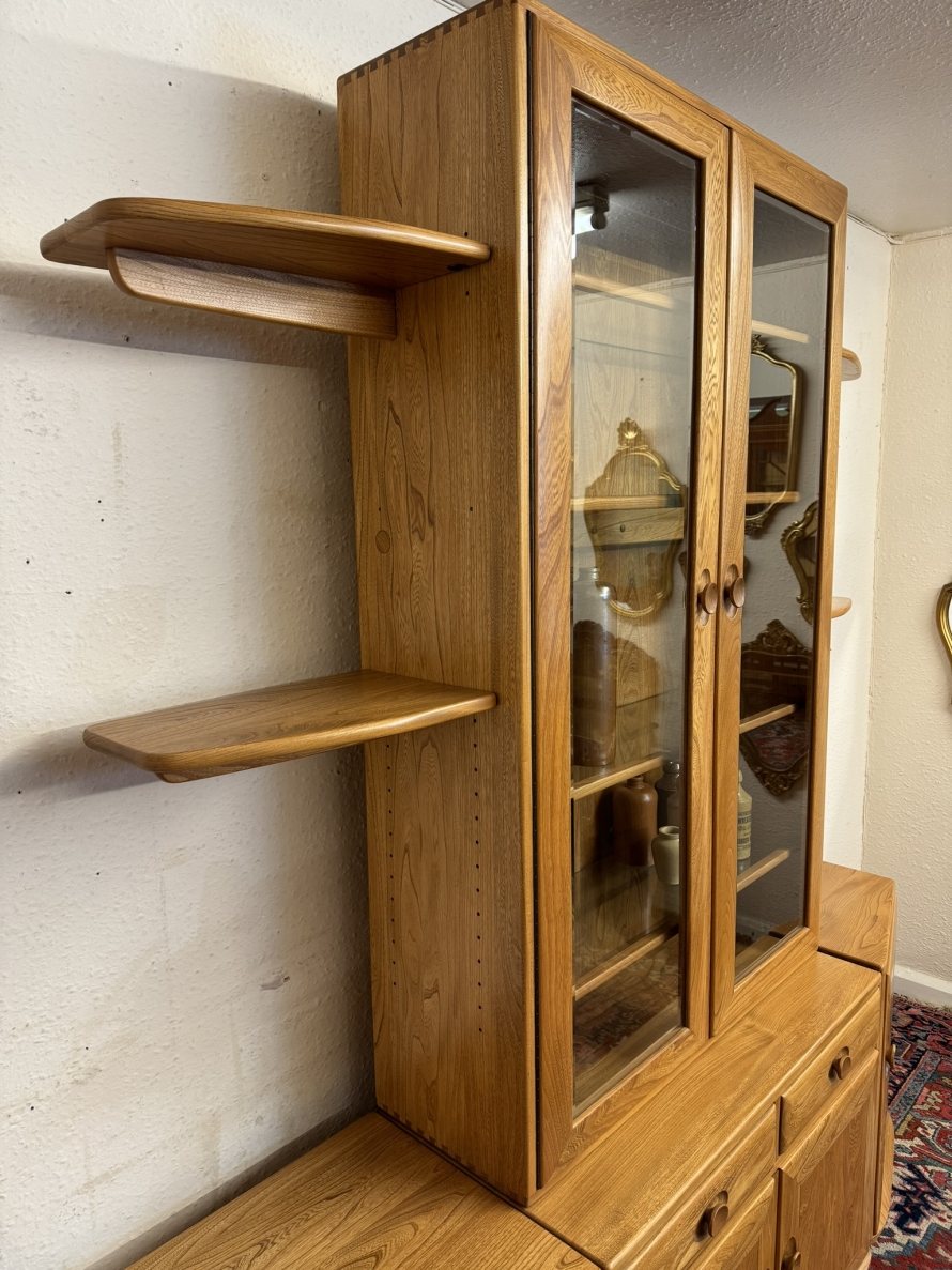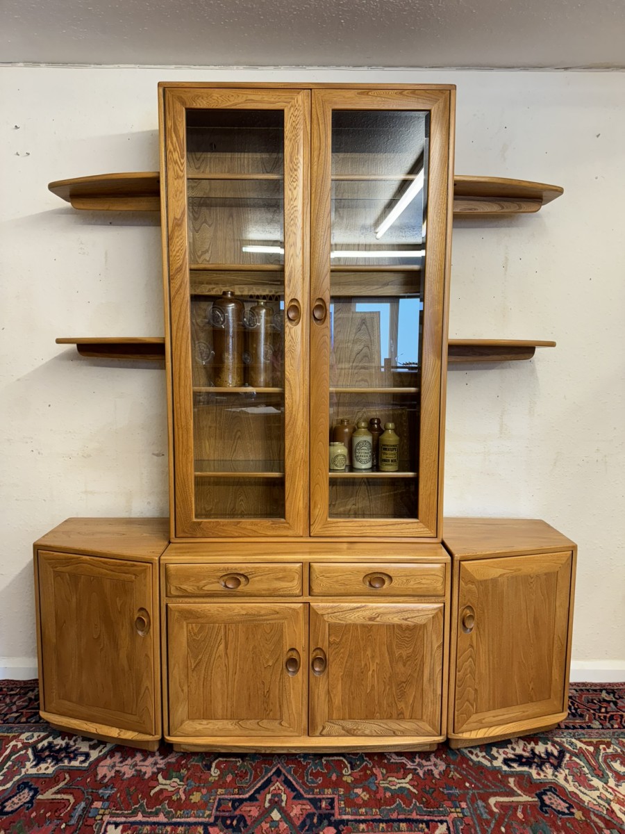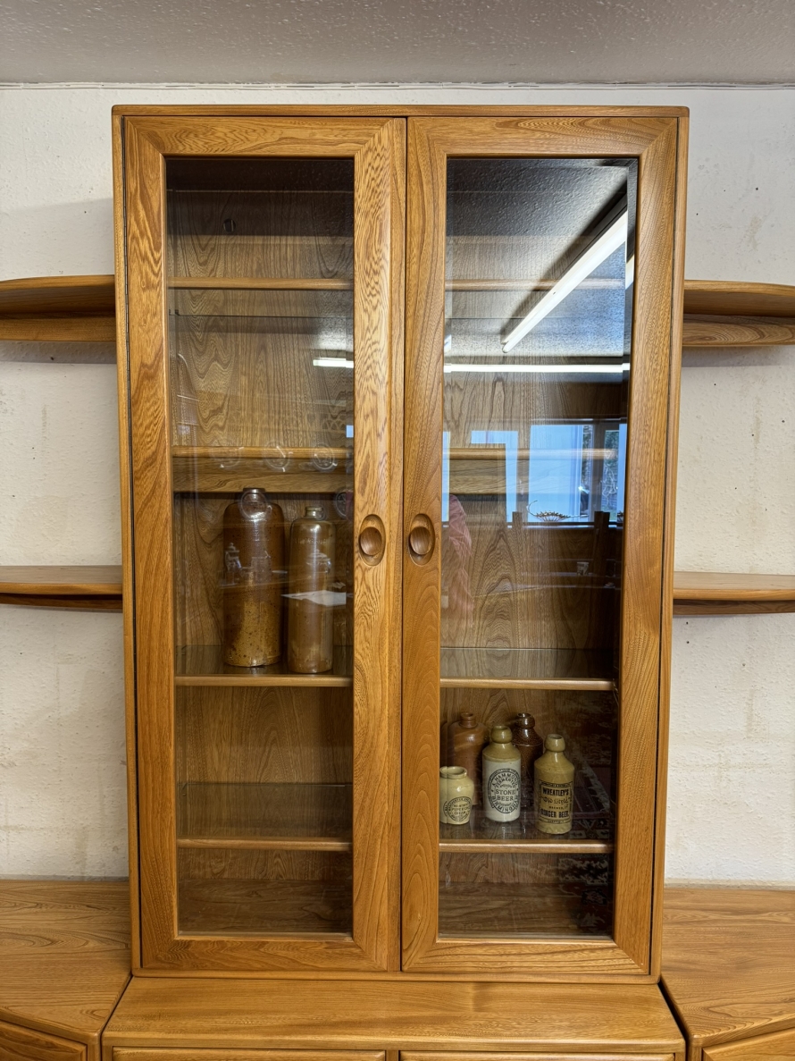 This fantastic quality blonde Ercol cabinet is in excellent condition. The glazed central section has four glass shelves, three of which are adjustable. To the sides are four floating display shelves. The central section base having two drawers above two cupboard doors, the doors open to reveal an adjustable shelf. The central section is flanked by a pair of canted side cupboards, each cupboard opens to reveal an adjustable shelf. A stunning item of furniture produced by the renowned Ercol furniture manufacturers.