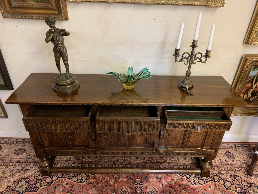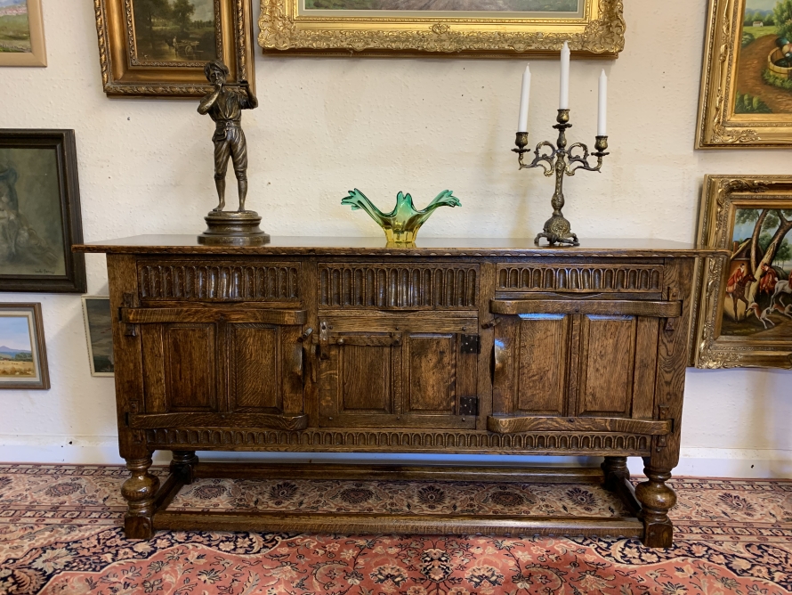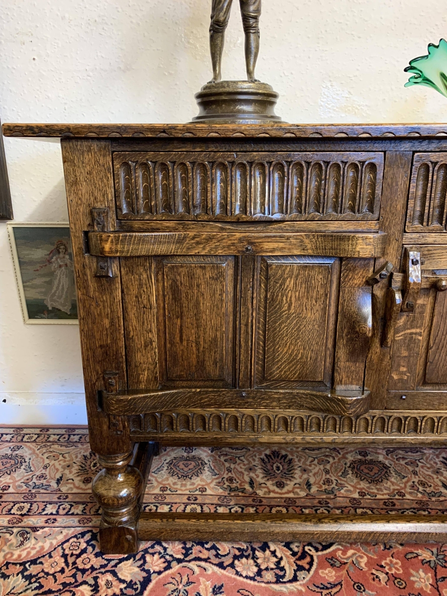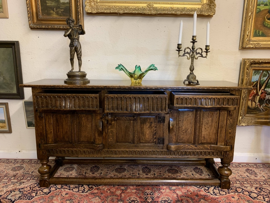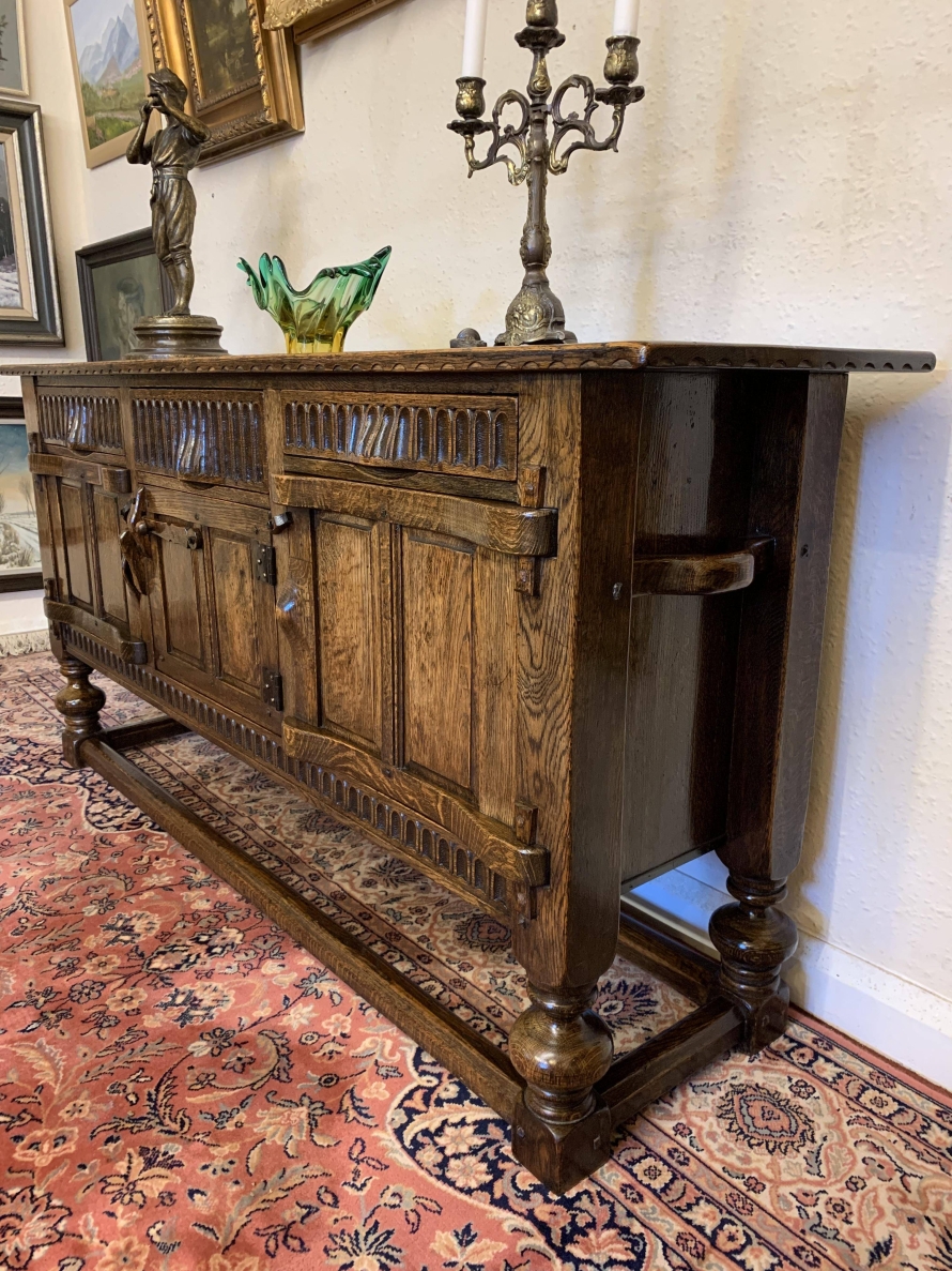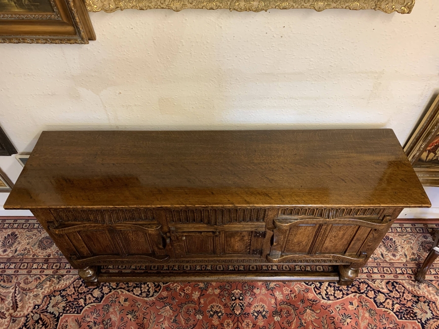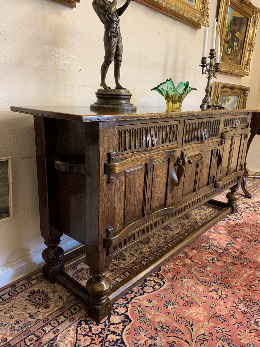 Made entirely of solid oak and in excellent condition this dresser was made by the renowned Nigel Rupert Griffiths furniture company. The oversailing top has a carved edge. Below are three carved drawers each drawer having the trade mark eyebrow handle of Nigel Rupert Griffiths. Below are three recessed panelled lockable doors with a carved skirt below. Carrying handles to the sides four bulbous legs on block feet with sturdy stretcher supports.