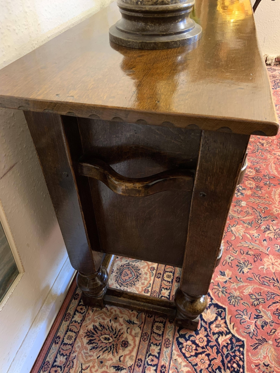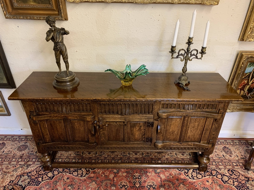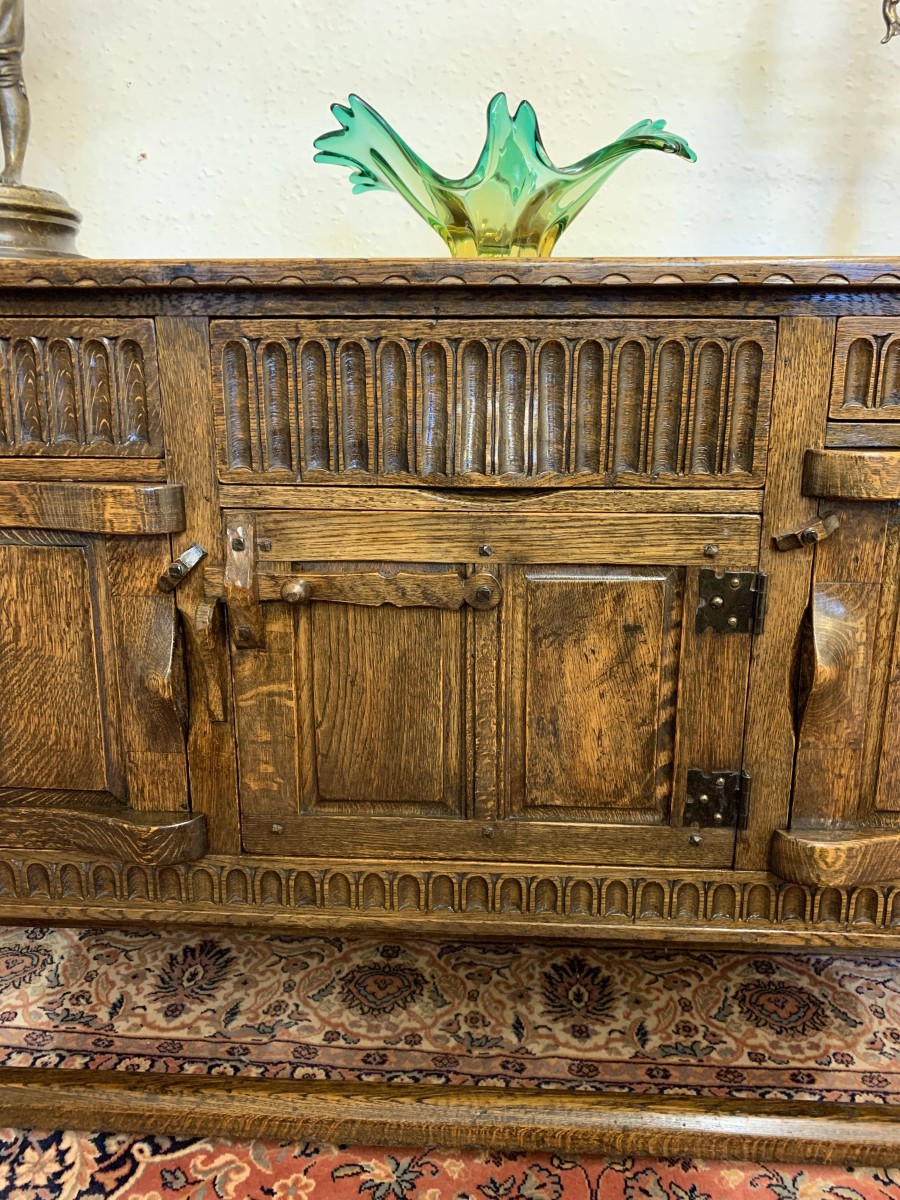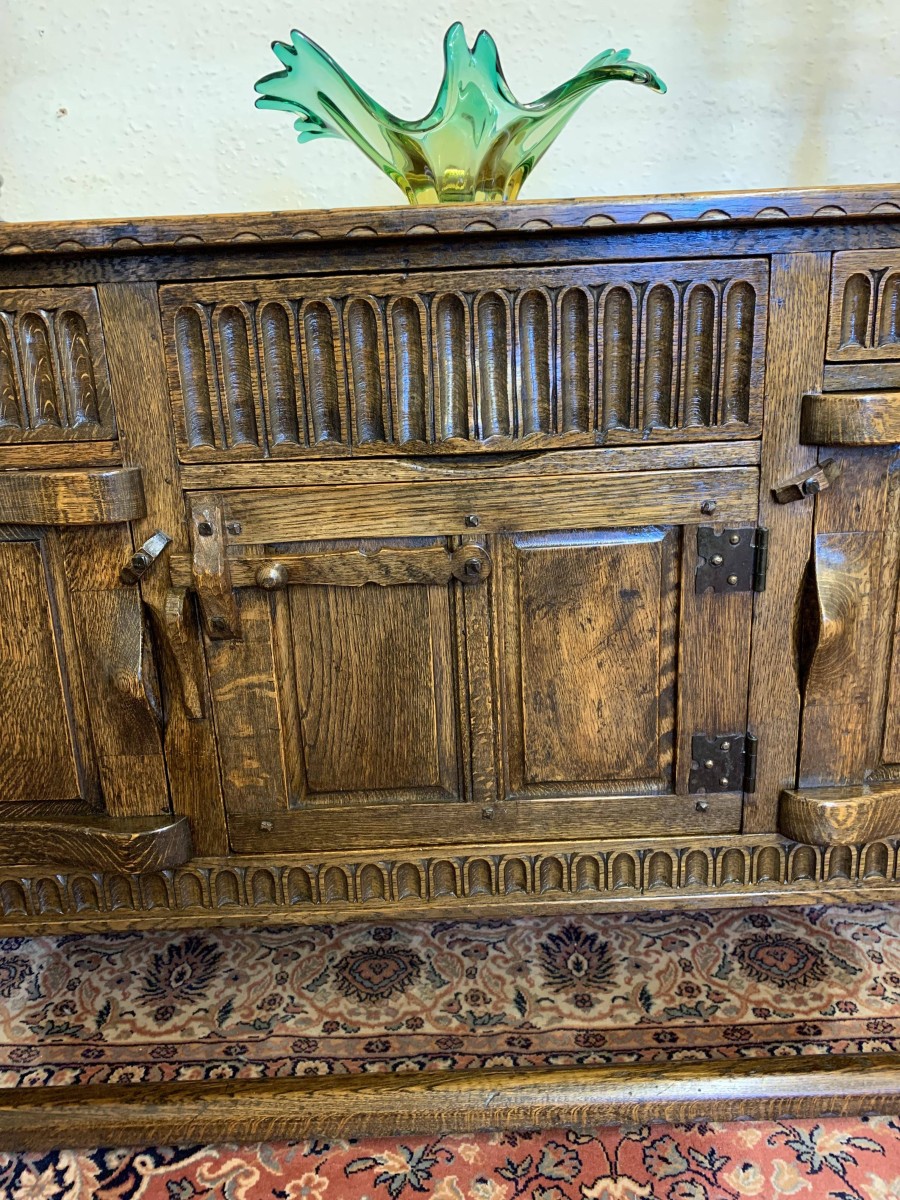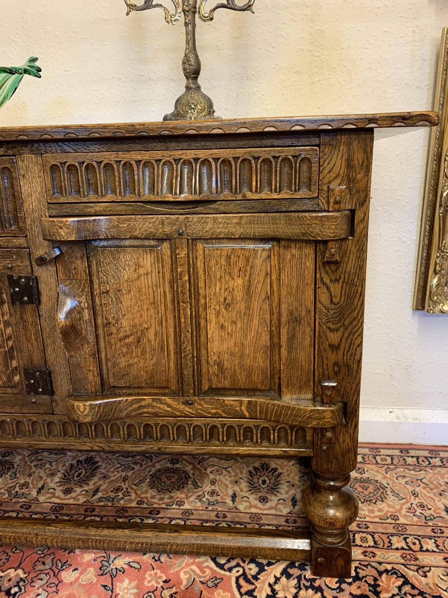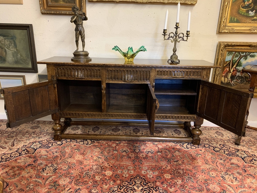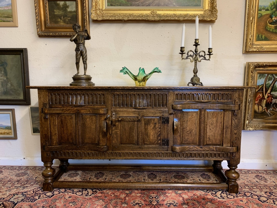 Made entirely of solid oak and in excellent condition this dresser was made by the renowned Nigel Rupert Griffiths furniture company. The oversailing top has a carved edge. Below are three carved drawers each drawer having the trade mark eyebrow handle of Nigel Rupert Griffiths. Below are three recessed panelled lockable doors with a carved skirt below. Carrying handles to the sides four bulbous legs on block feet with sturdy stretcher supports.