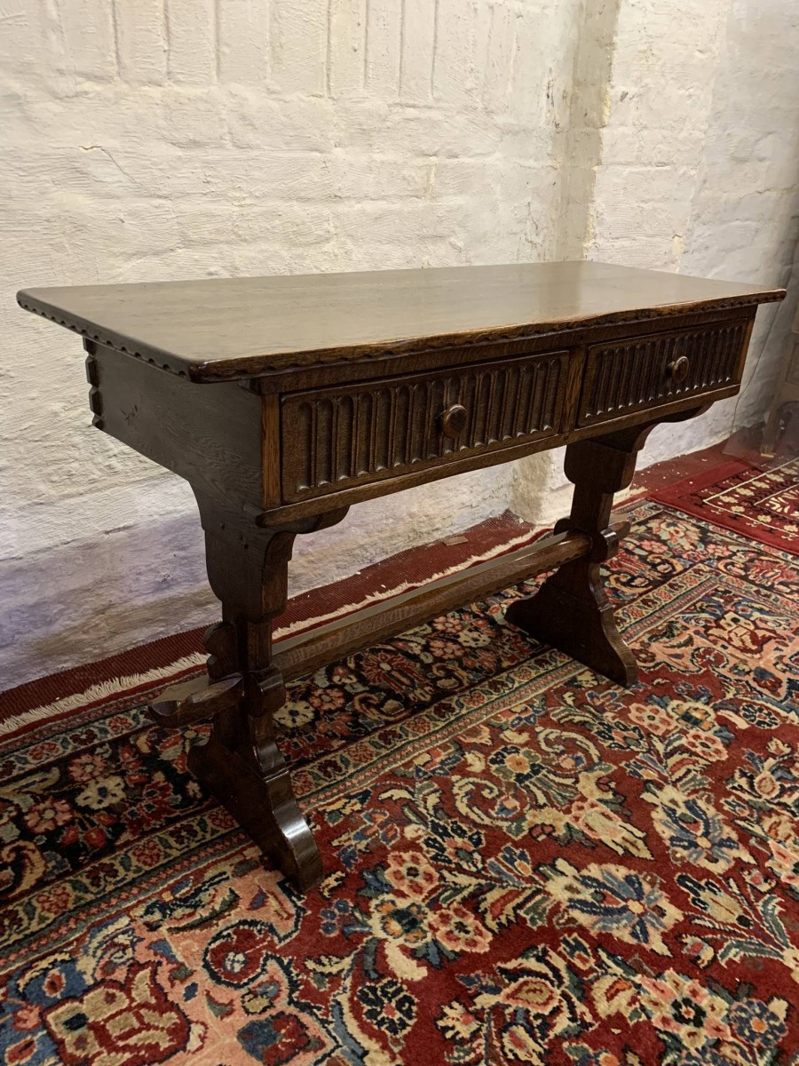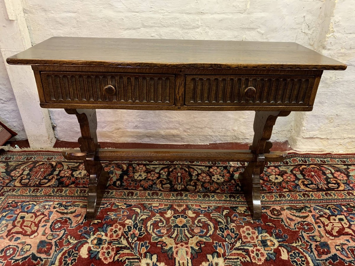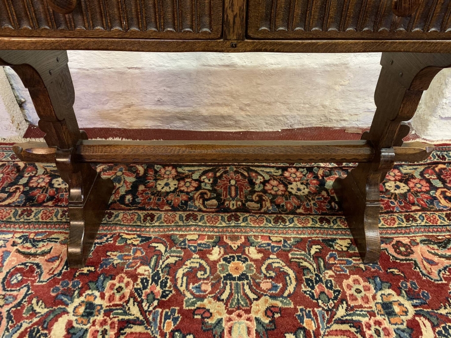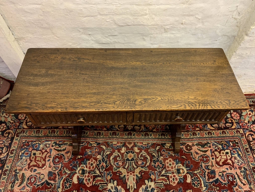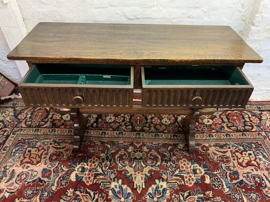 Made entirely in solid oak this side table was produced by the Nigel Rupert Griffiths furniture company. Each item of Nigel Rupert Griffiths furniture is individually crafted with hand cut dovetails and is planed, sanded, carved, stained and polished by hand. The oversailing top sits above a pair of carved drawers, each drawer having a round knob handle. Below are a pair of shaped legs, with a chamfered stretcher support. This fabulous side table sits on block feet.