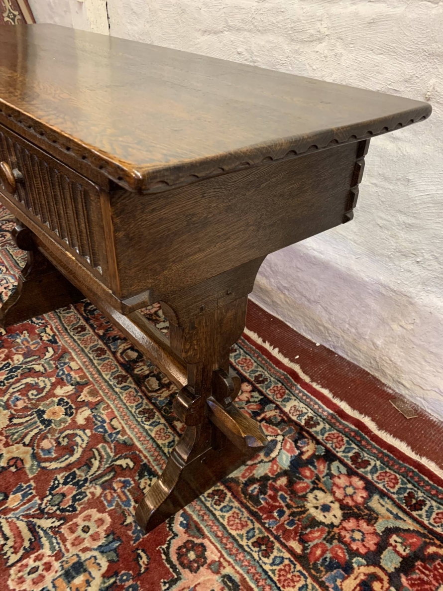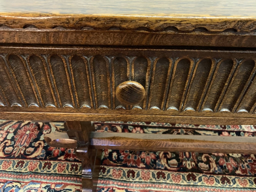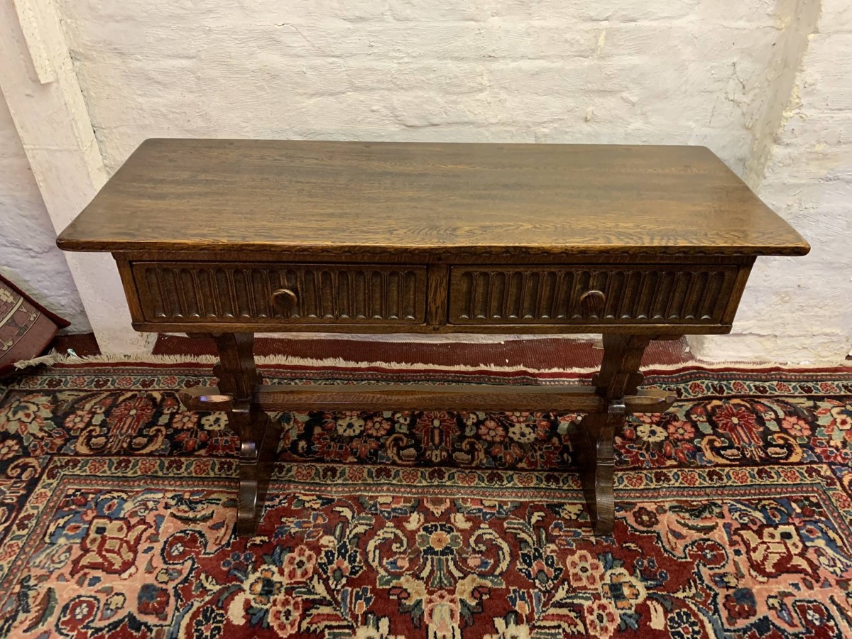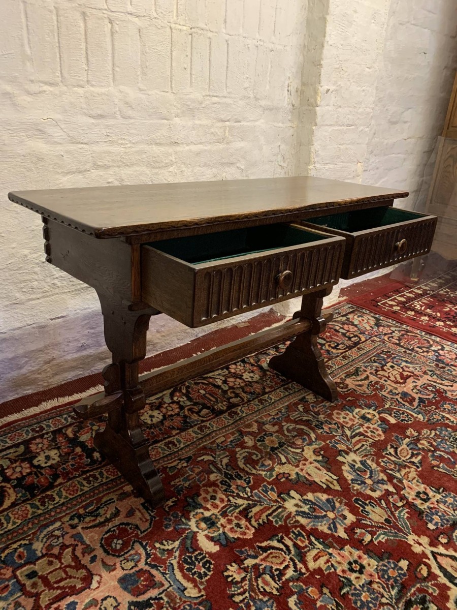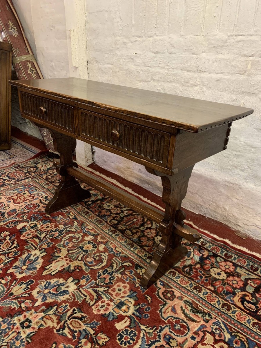 Made entirely in solid oak this side table was produced by the Nigel Rupert Griffiths furniture company. Each item of Nigel Rupert Griffiths furniture is individually crafted with hand cut dovetails and is planed, sanded, carved, stained and polished by hand. The oversailing top sits above a pair of carved drawers, each drawer having a round knob handle. Below are a pair of shaped legs, with a chamfered stretcher support. This fabulous side table sits on block feet.