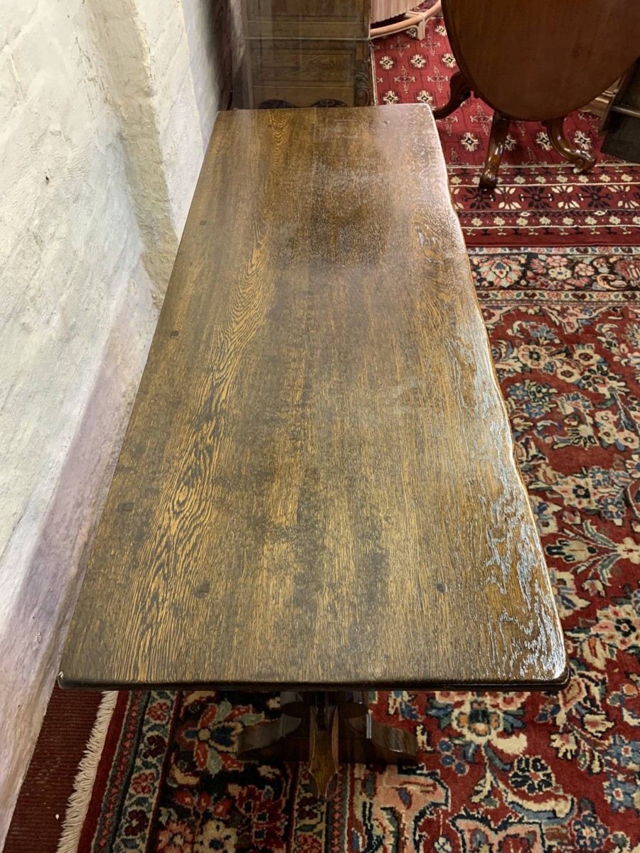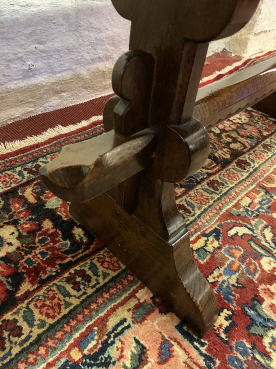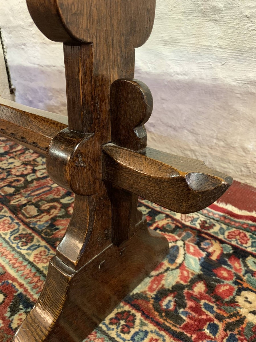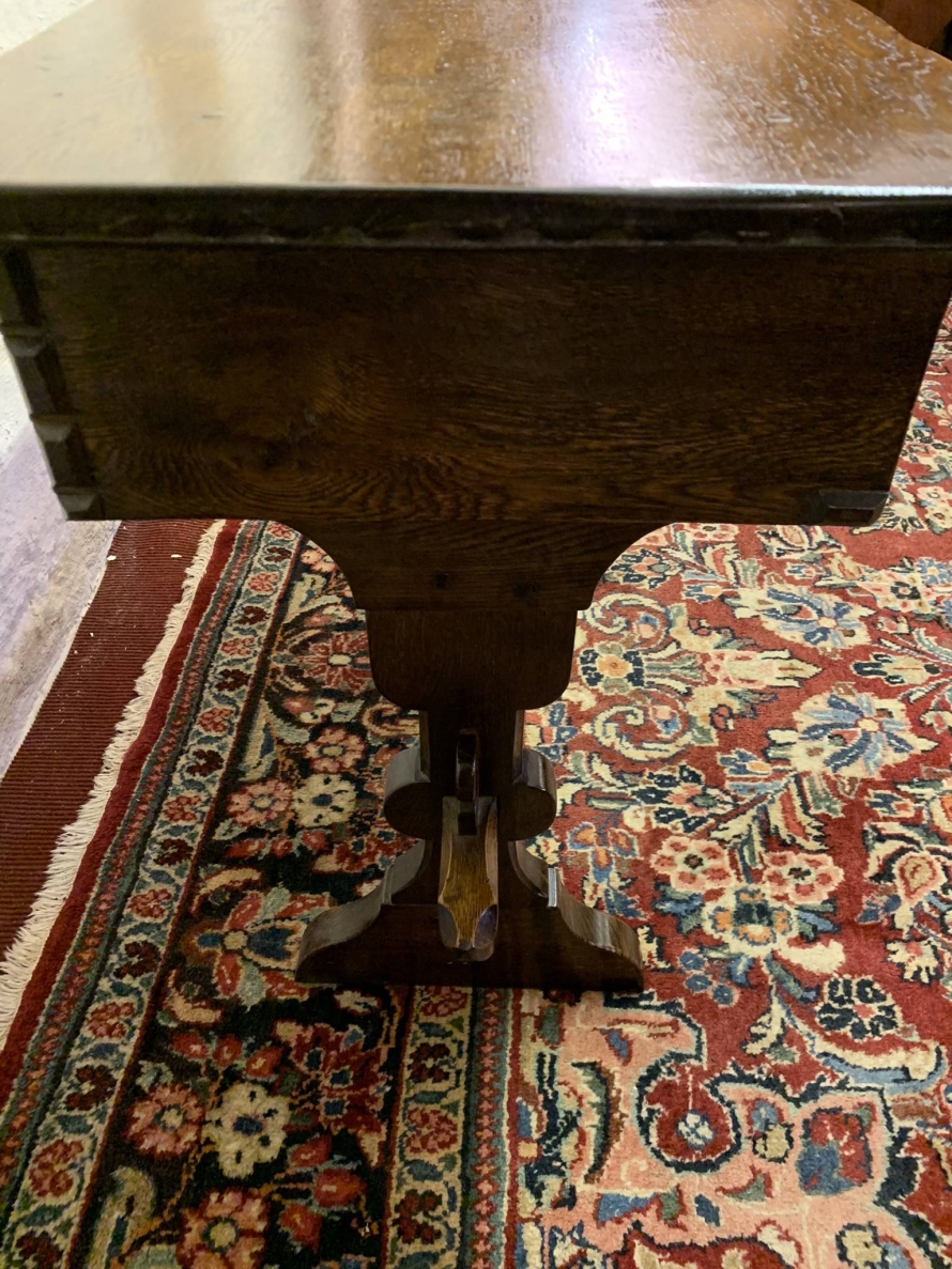 Made entirely in solid oak this side table was produced by the Nigel Rupert Griffiths furniture company. Each item of Nigel Rupert Griffiths furniture is individually crafted with hand cut dovetails and is planed, sanded, carved, stained and polished by hand. The oversailing top sits above a pair of carved drawers, each drawer having a round knob handle. Below are a pair of shaped legs, with a chamfered stretcher support. This fabulous side table sits on block feet.