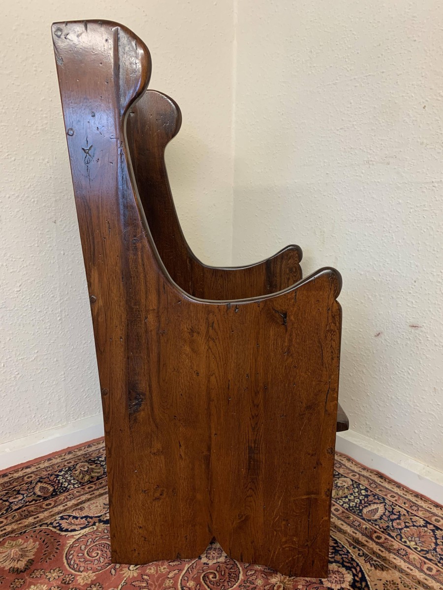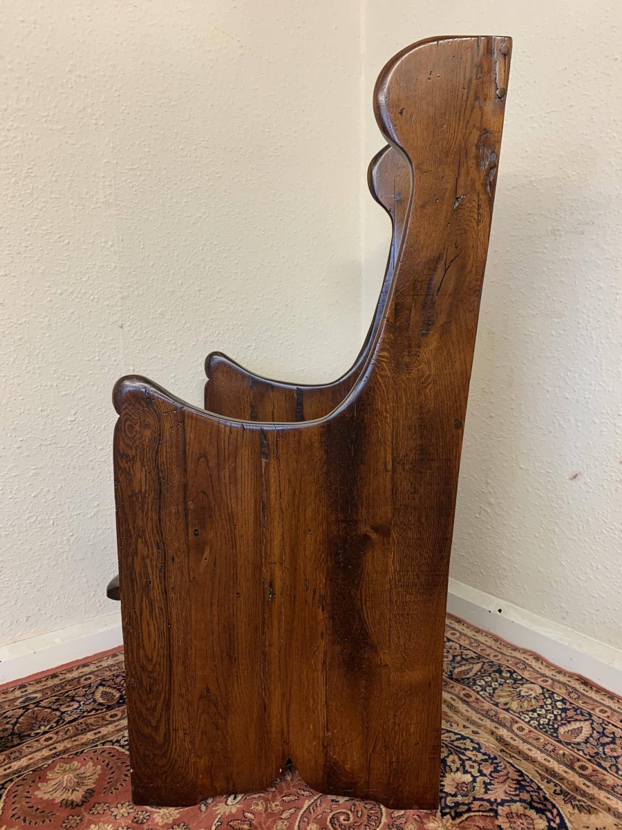 Made entirely from glorious solid oak this antique style lambing chair is in excellent condition. High pierced back, sweeping arms and a panelled seat. An outstanding quality item of furniture.