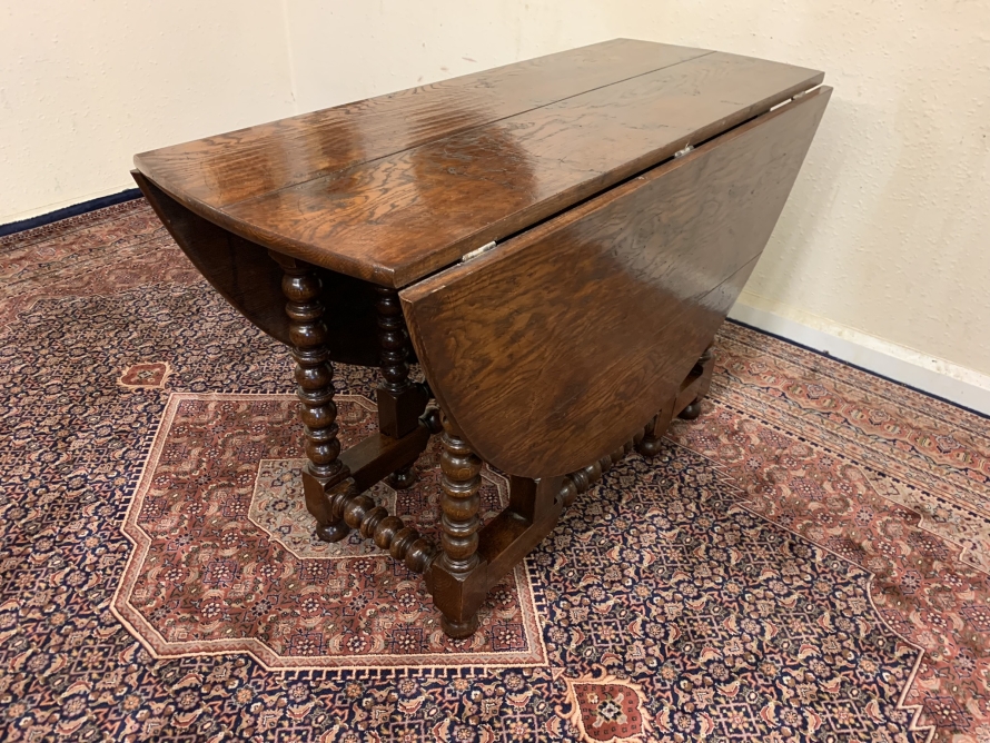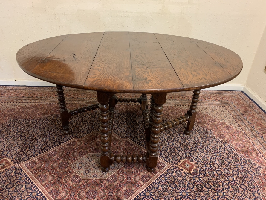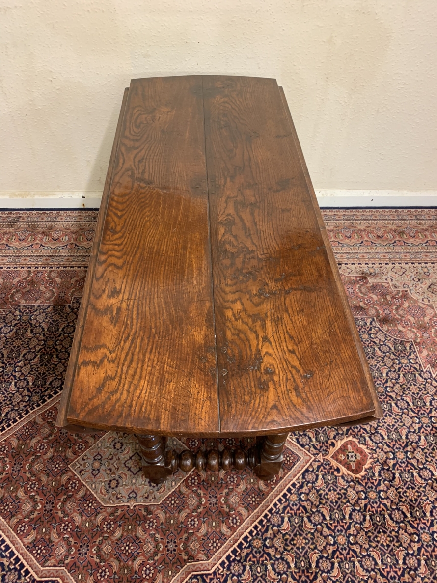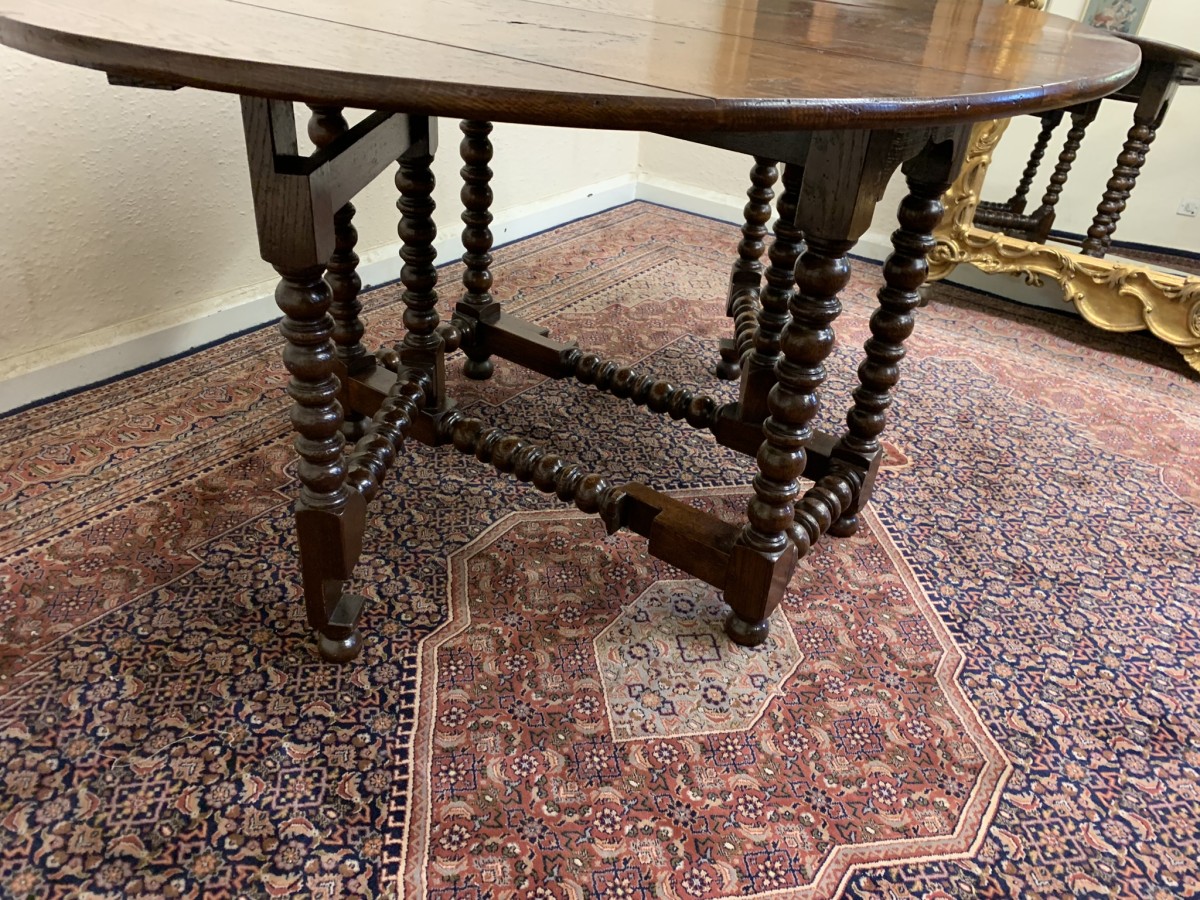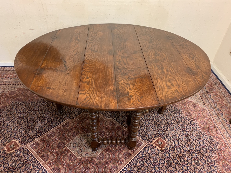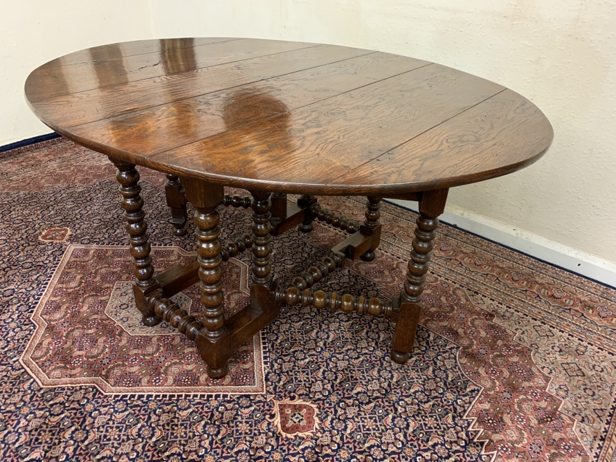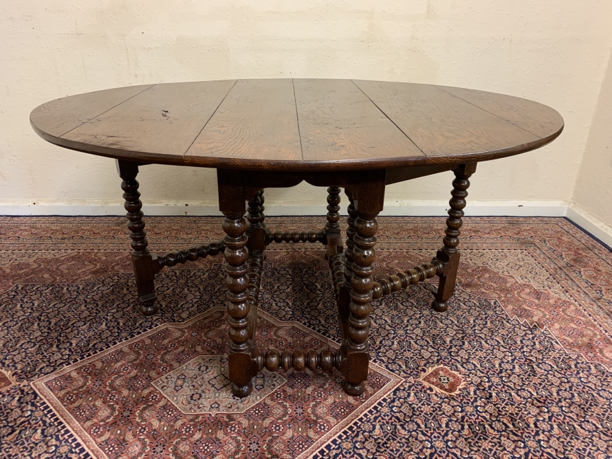 Made in fabulous solid oak this table is in excellent condition. The table has two drop leaves which open to extend the capacity of the table. The table top is peg jointed throughout. The fantastic bobbin leg base opens for the leaves to rest on.