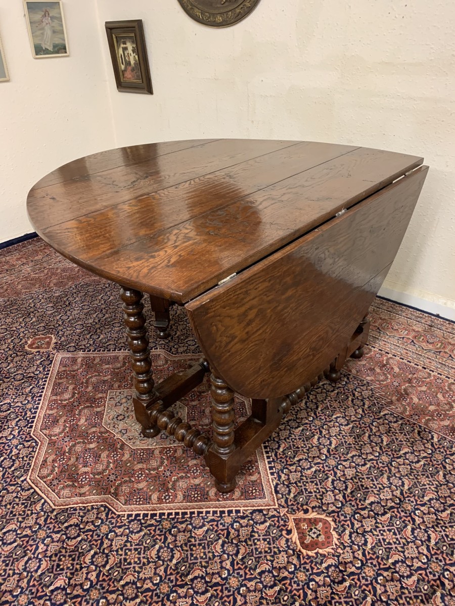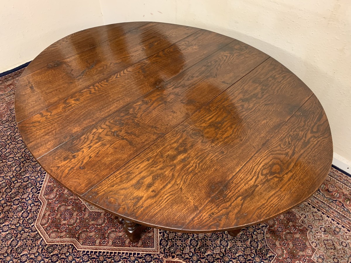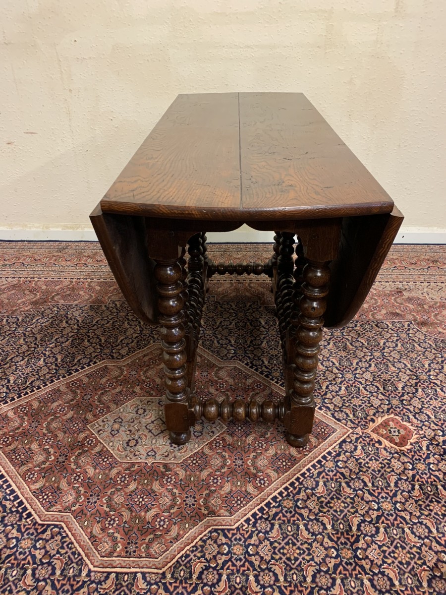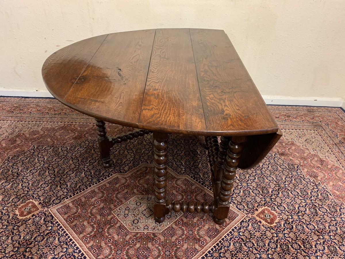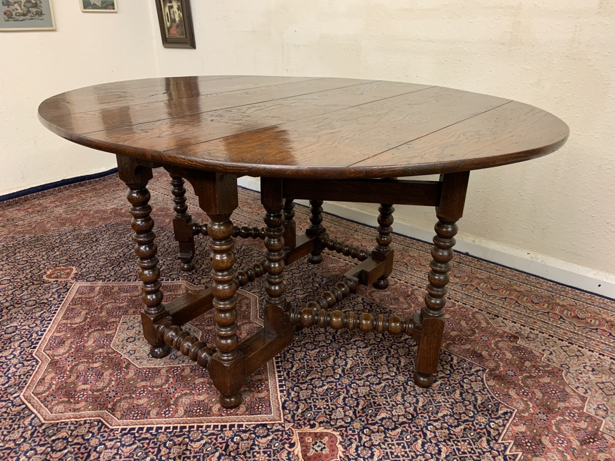Made in fabulous solid oak this table is in excellent condition. The table has two drop leaves which open to extend the capacity of the table. The table top is peg jointed throughout. The fantastic bobbin leg base opens for the leaves to rest on.