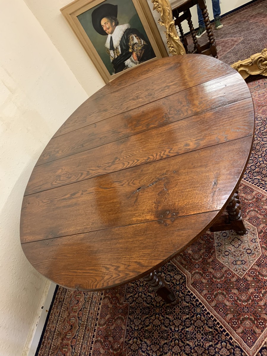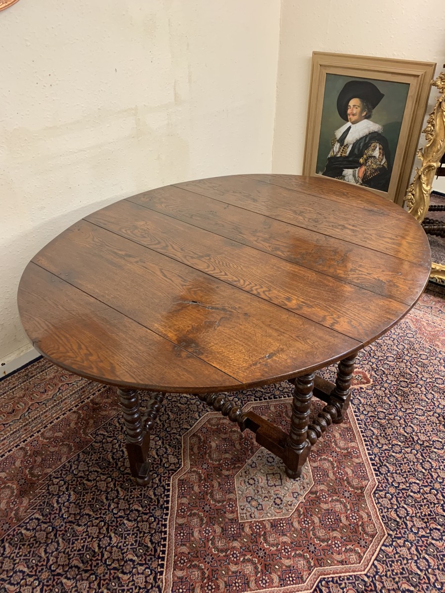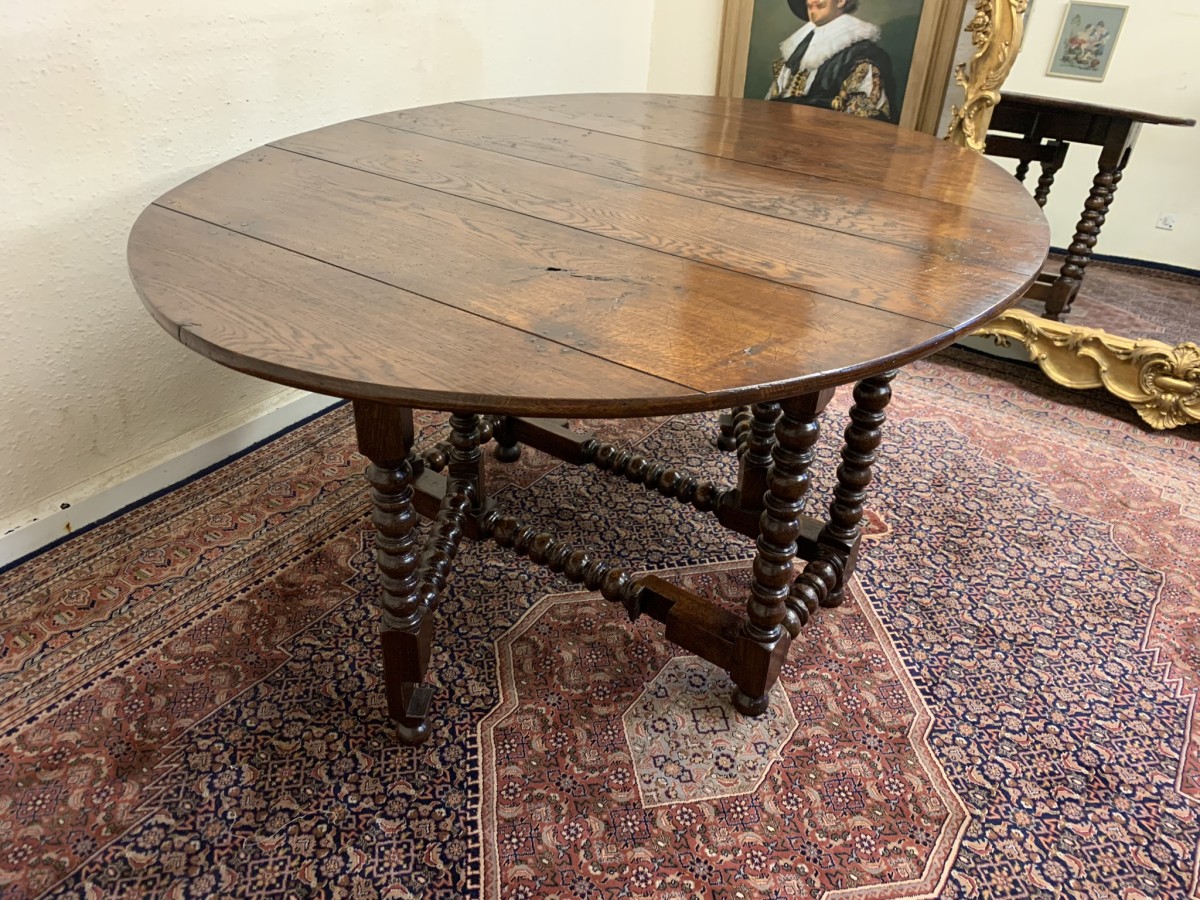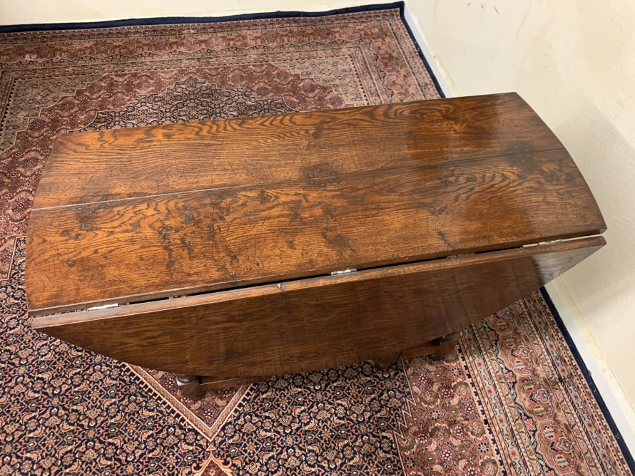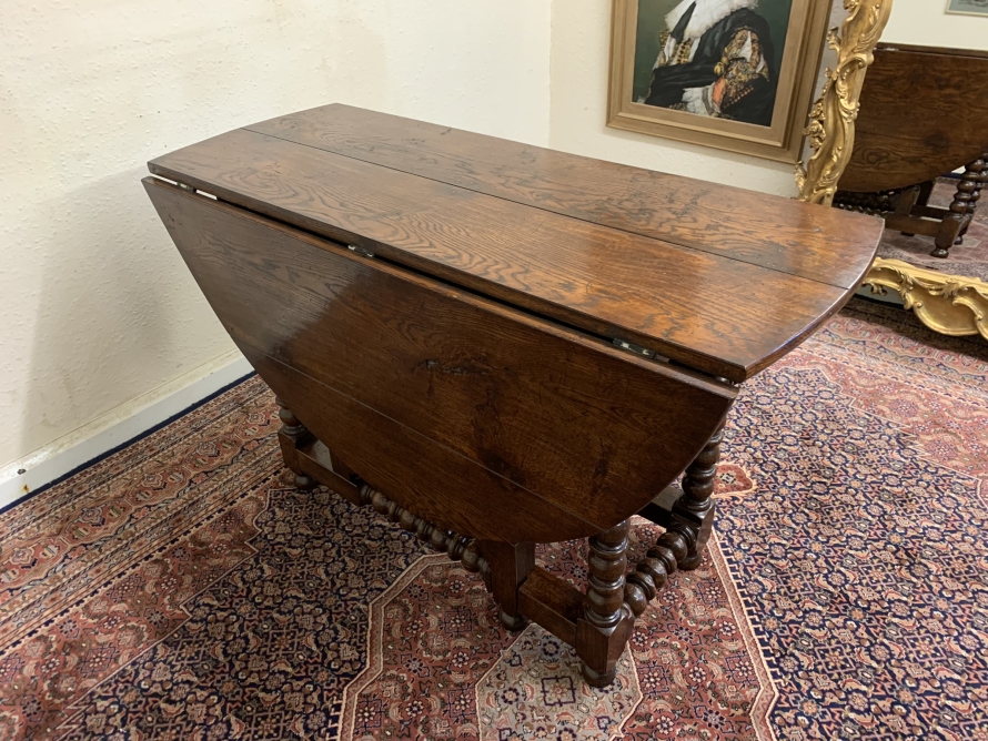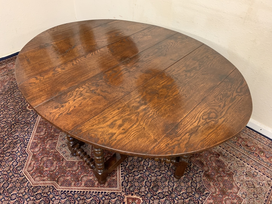 Made in fabulous solid oak this table is in excellent condition. The table has two drop leaves which open to extend the capacity of the table. The table top is peg jointed throughout. The fantastic bobbin leg base opens for the leaves to rest on.