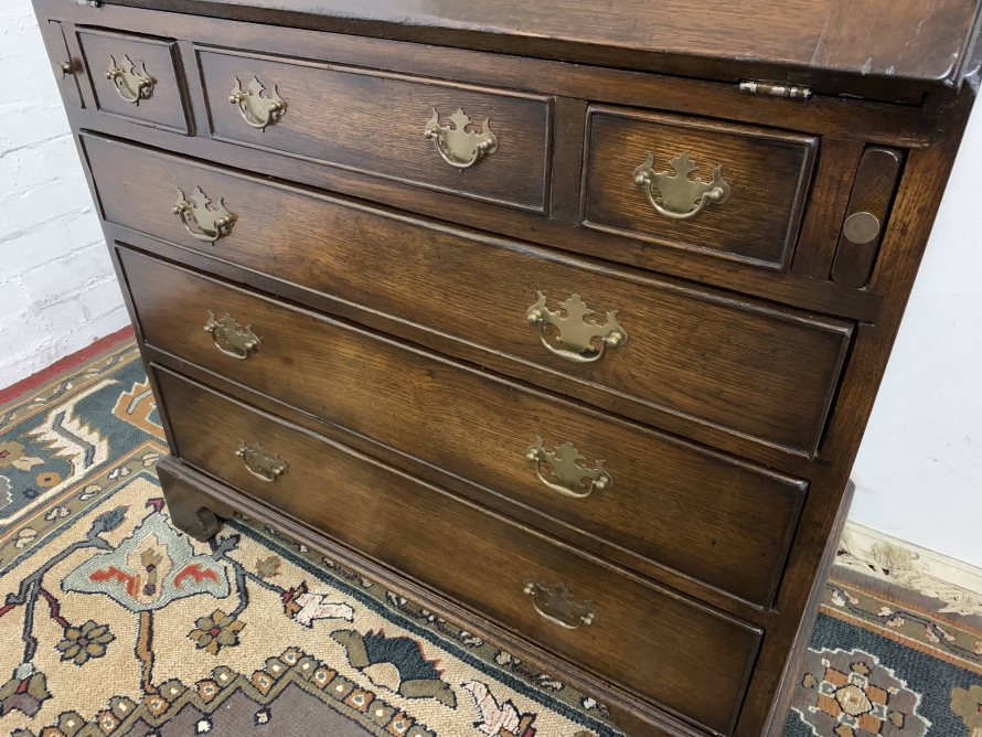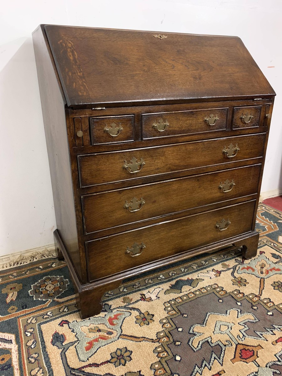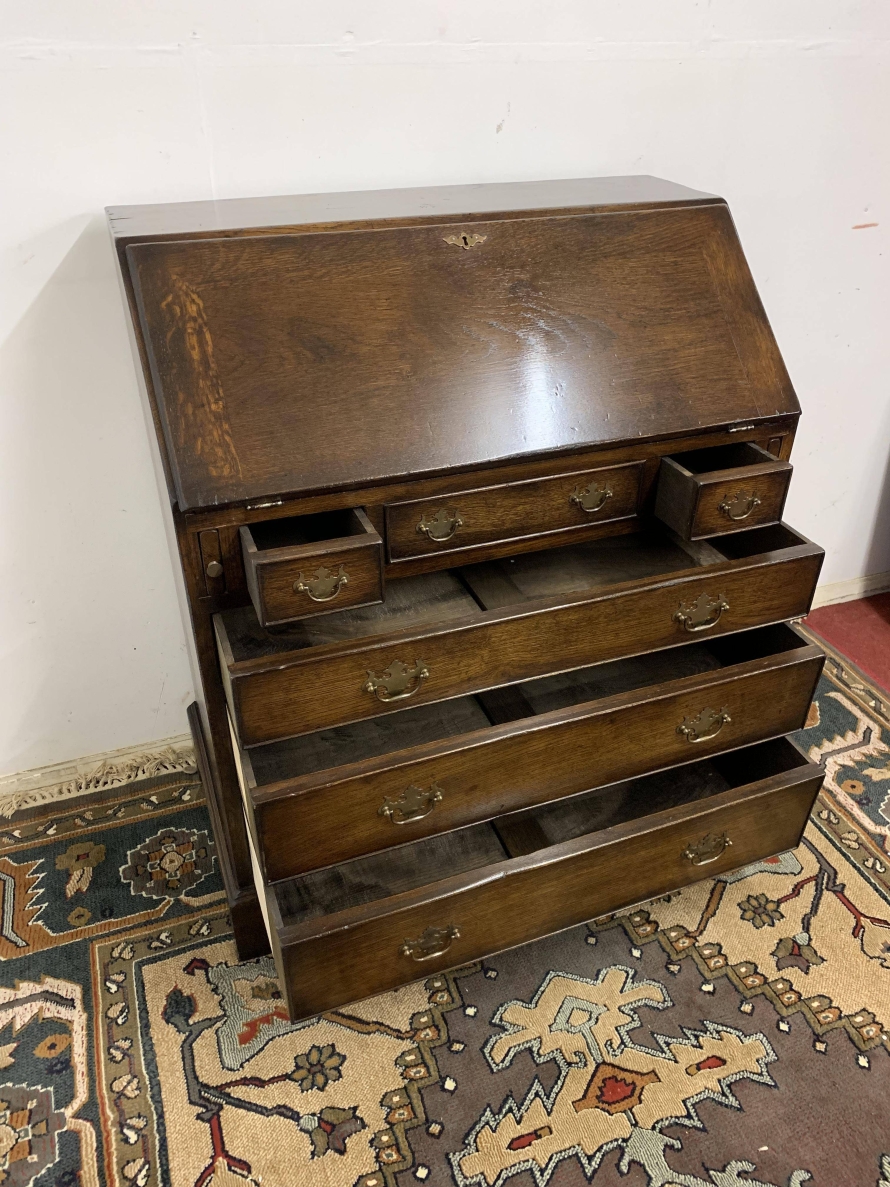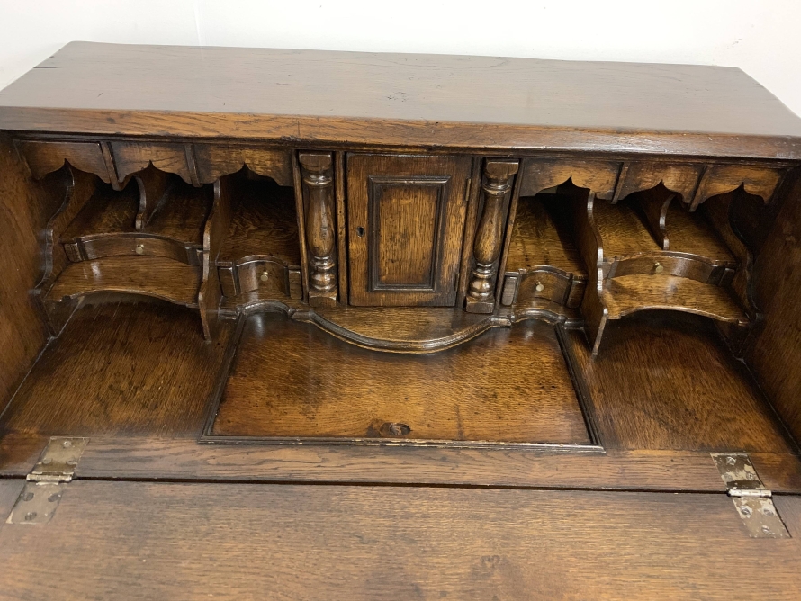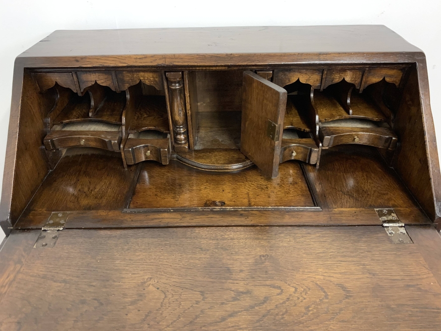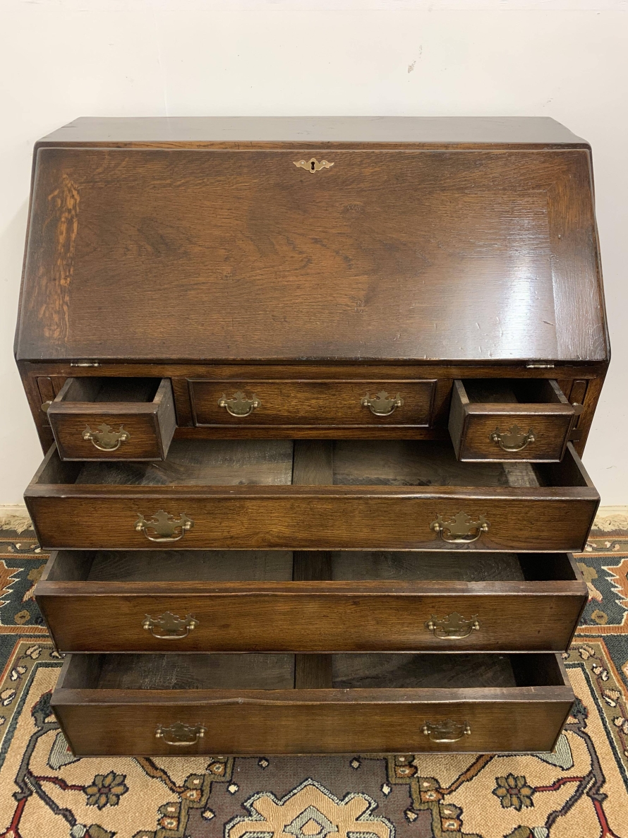 We are delighted to offer this top quality oak bureau. The lockable fall front opens to reveal a drop centre, array of drawers, secret drawers, pigeonholes with central cupboard. The fall front sits on retractable armrests. Below is a dummy central drawer flanked by a pair of smaller drawers, these sit above three graduated long drawers, each drawer having a pair of decorative brass handles. The bureau stands proud on four bracket feet. Please note this bureau is English made and is produced in glorious solid oak.