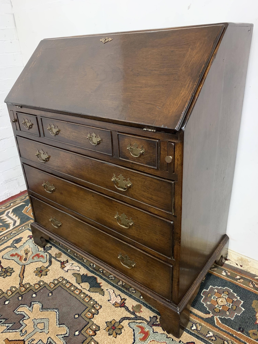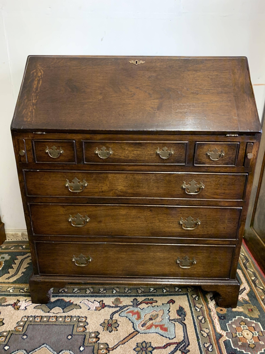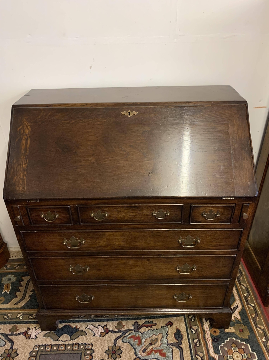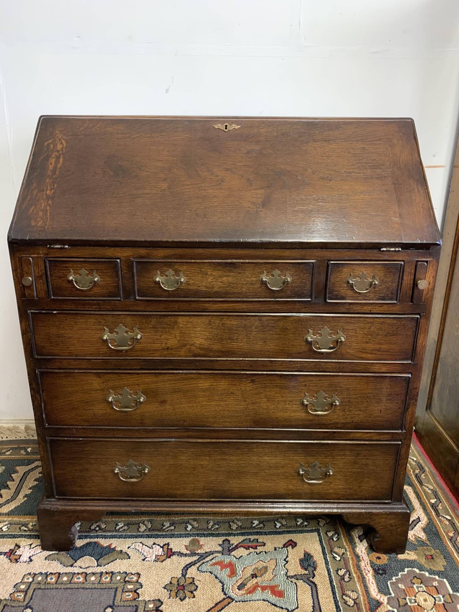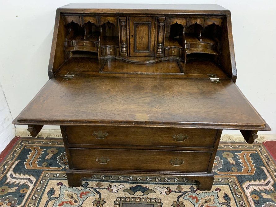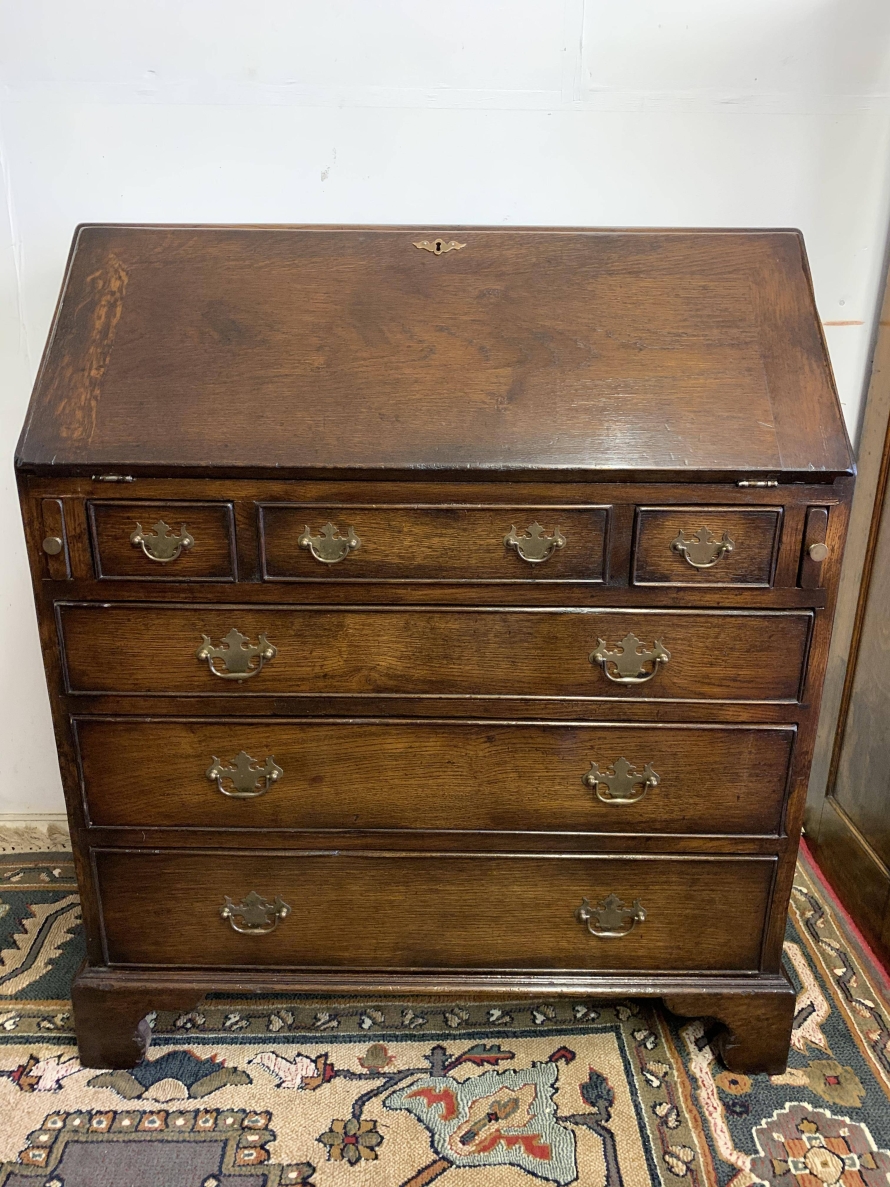 We are delighted to offer this top quality oak bureau. The lockable fall front opens to reveal a drop centre, array of drawers, secret drawers, pigeonholes with central cupboard. The fall front sits on retractable armrests. Below is a dummy central drawer flanked by a pair of smaller drawers, these sit above three graduated long drawers, each drawer having a pair of decorative brass handles. The bureau stands proud on four bracket feet. Please note this bureau is English made and is produced in glorious solid oak.