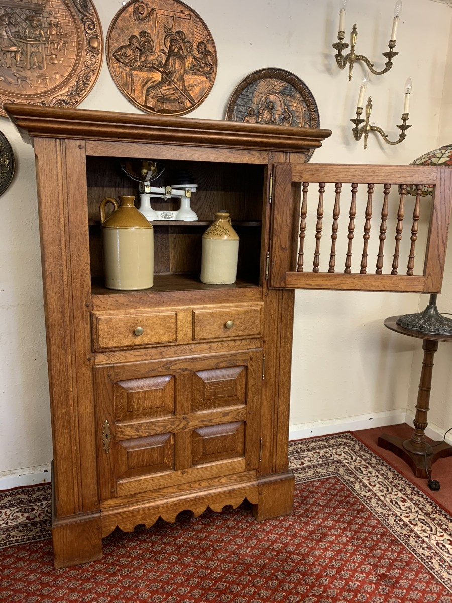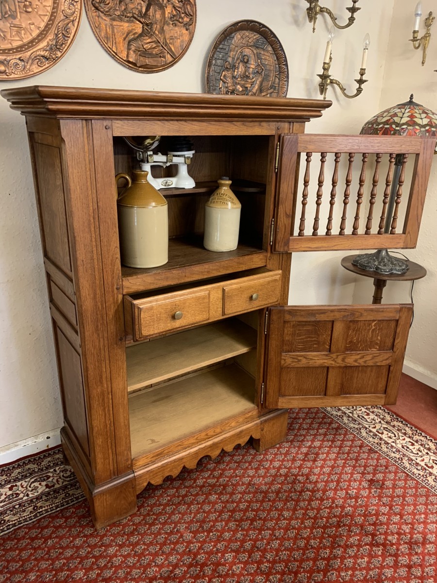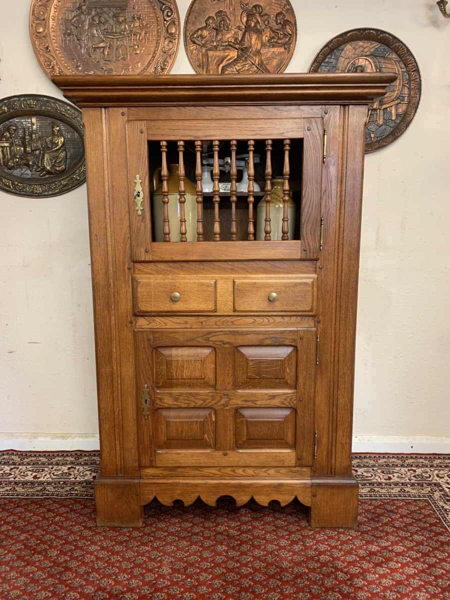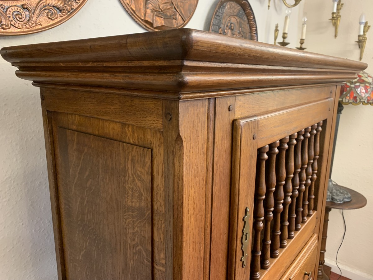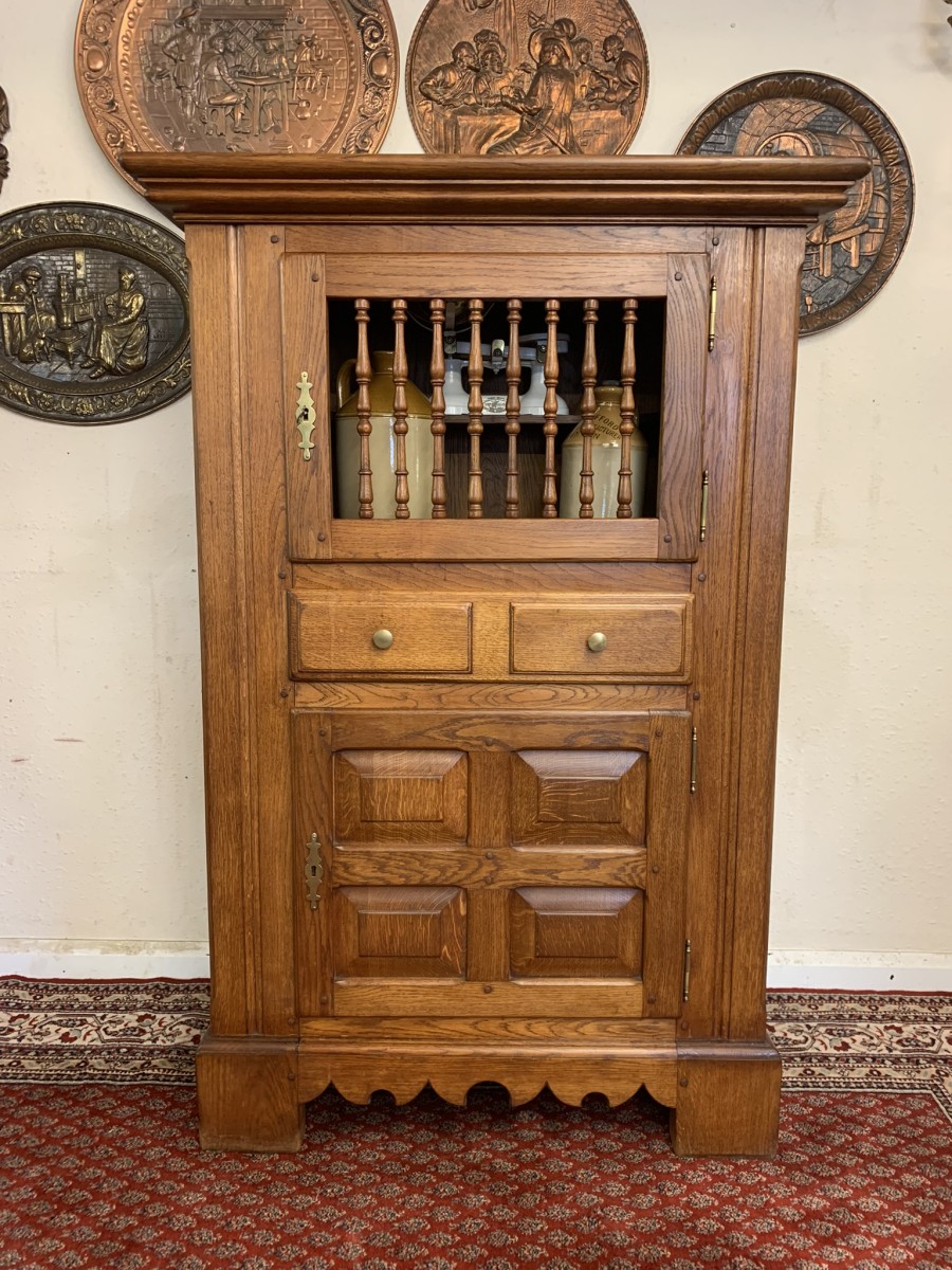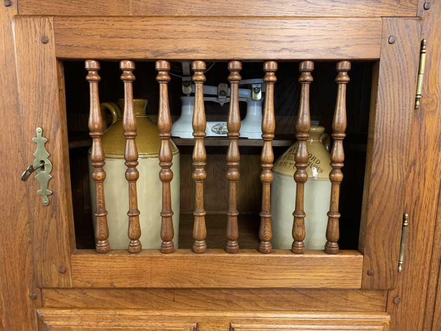 Stepped oversailing top sits above a lockable door, the door having eight spindels and opening to reveal a removable shaped shelf. Below is a drawer which sits above a lockable panelled door, the door opens to reveal a removable shelf. Recessed panelled sides , shaped skirt and standing on block feet. Please note this cabinet has fabulous visible pegs throughout.