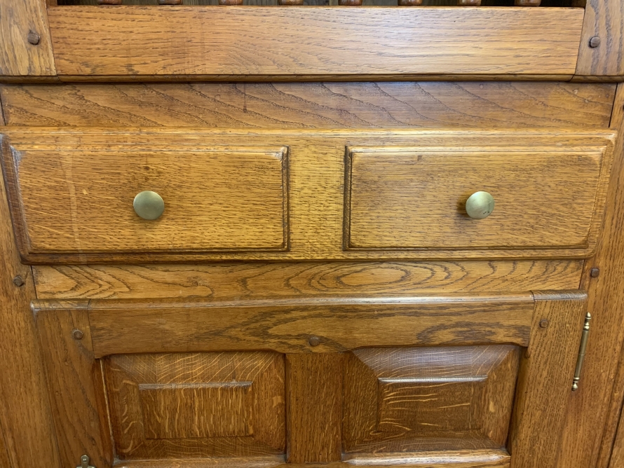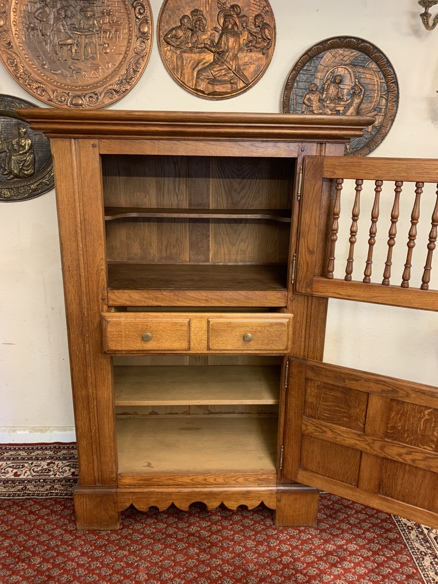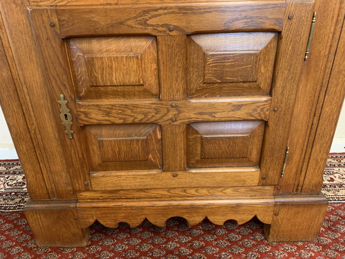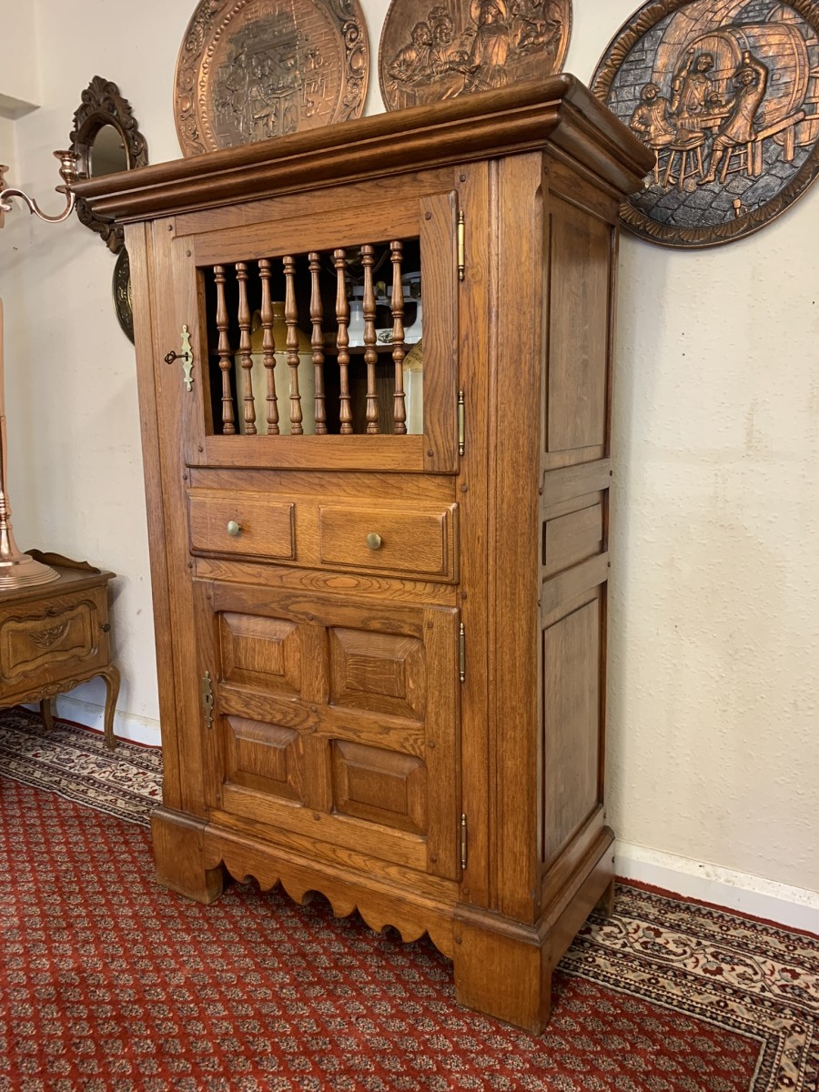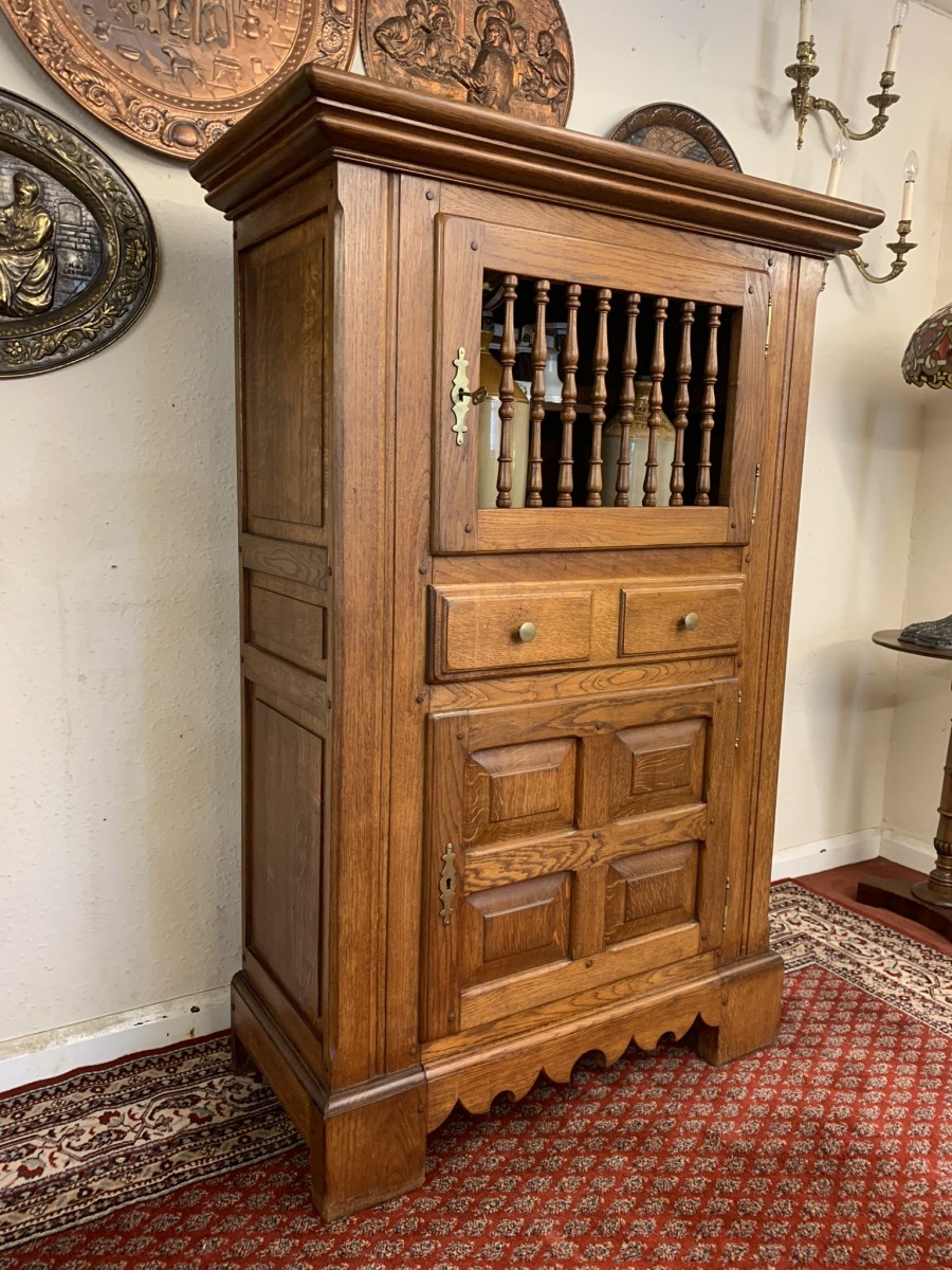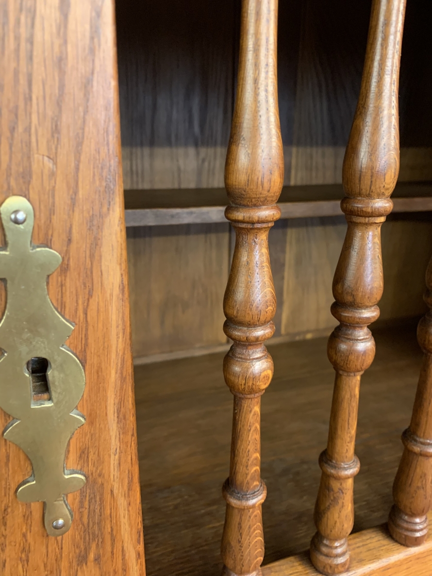 Stepped oversailing top sits above a lockable door, the door having eight spindels and opening to reveal a removable shaped shelf. Below is a drawer which sits above a lockable panelled door, the door opens to reveal a removable shelf. Recessed panelled sides , shaped skirt and standing on block feet. Please note this cabinet has fabulous visible pegs throughout.
