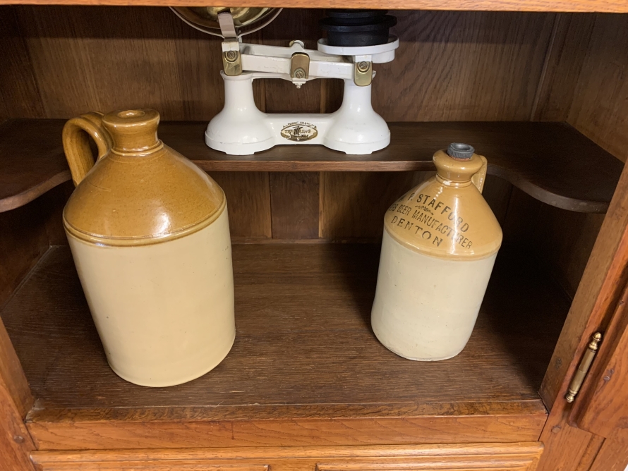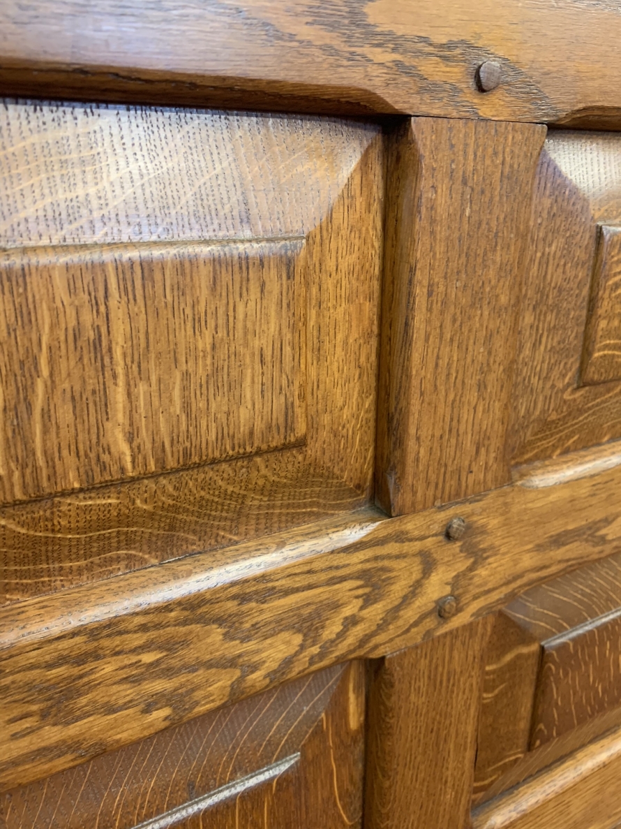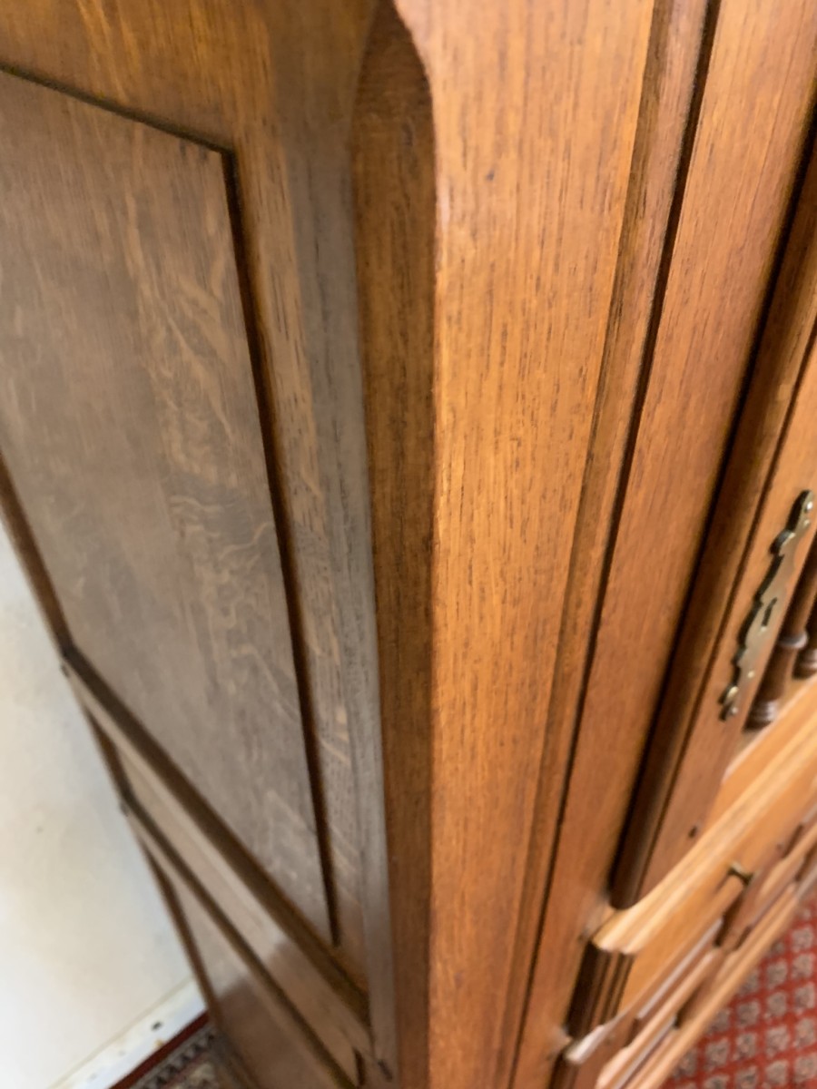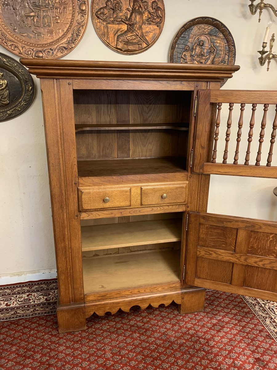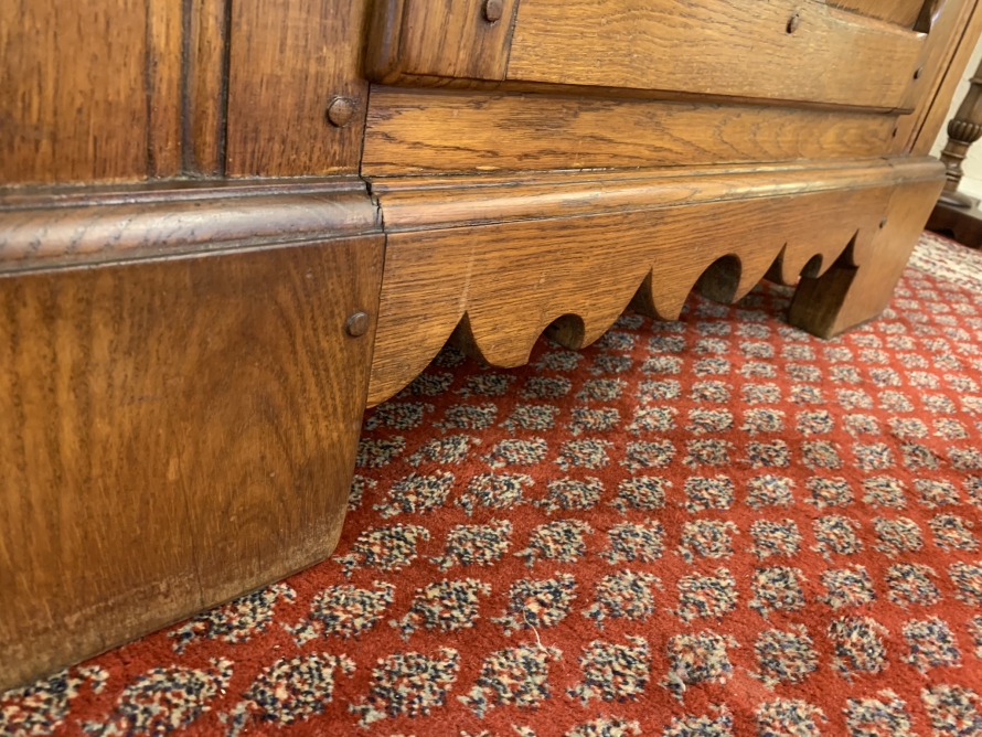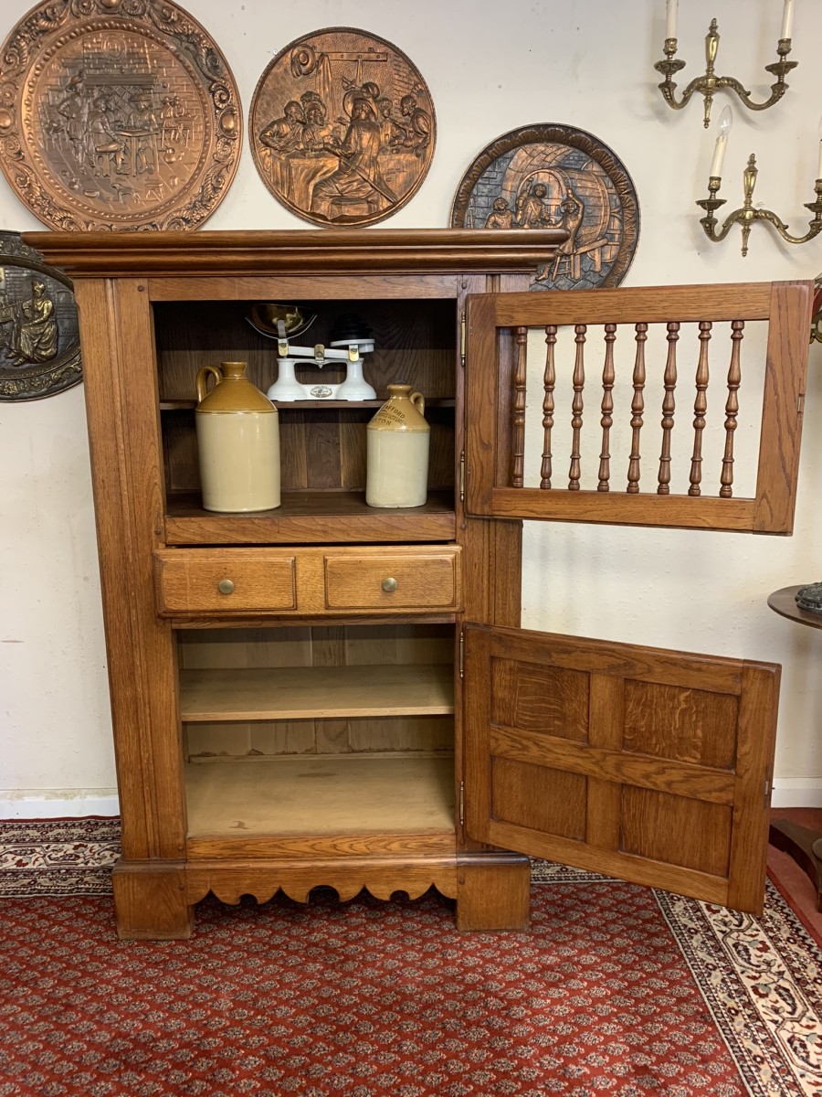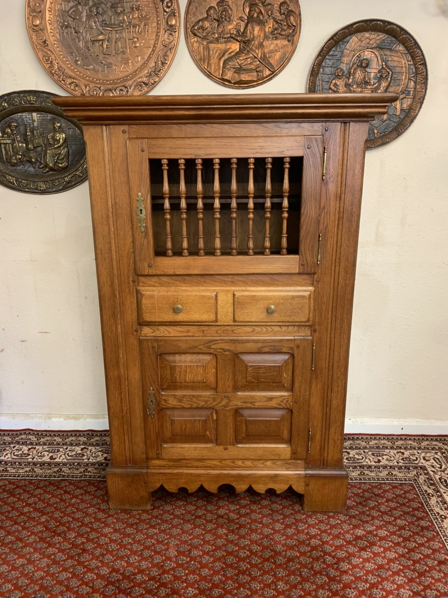 Stepped oversailing top sits above a lockable door, the door having eight spindels and opening to reveal a removable shaped shelf. Below is a drawer which sits above a lockable panelled door, the door opens to reveal a removable shelf. Recessed panelled sides , shaped skirt and standing on block feet. Please note this cabinet has fabulous visible pegs throughout.