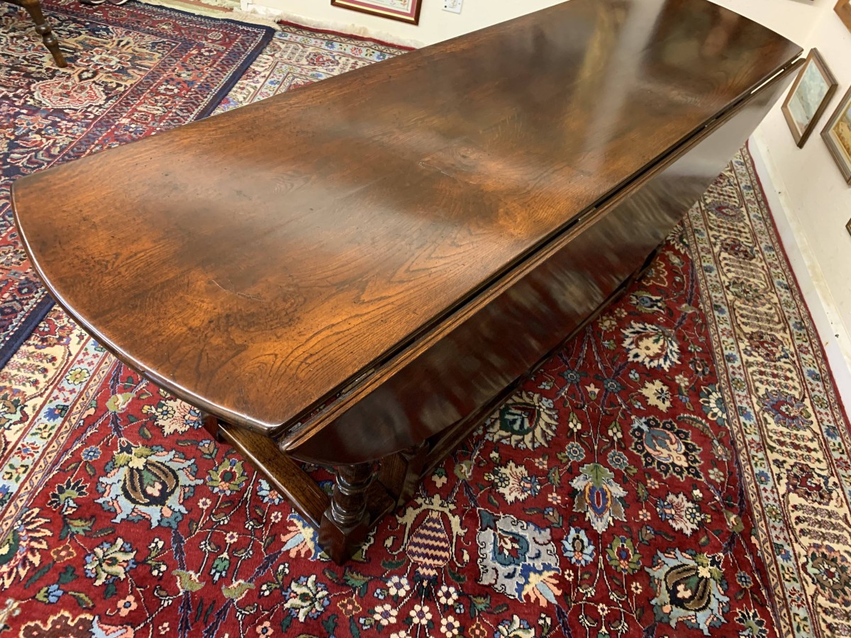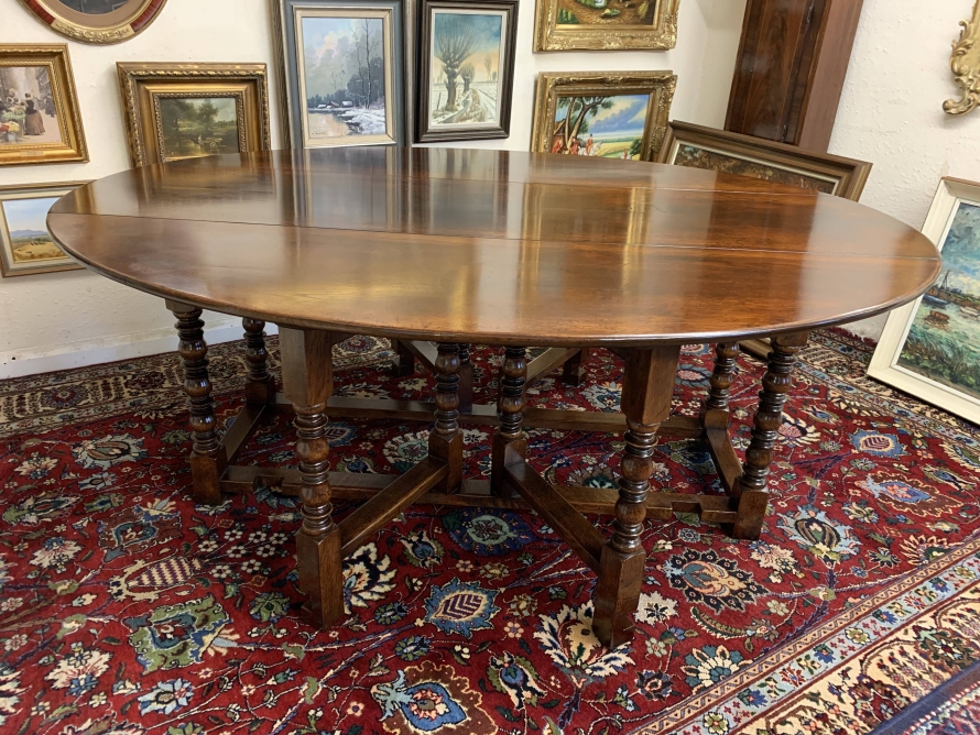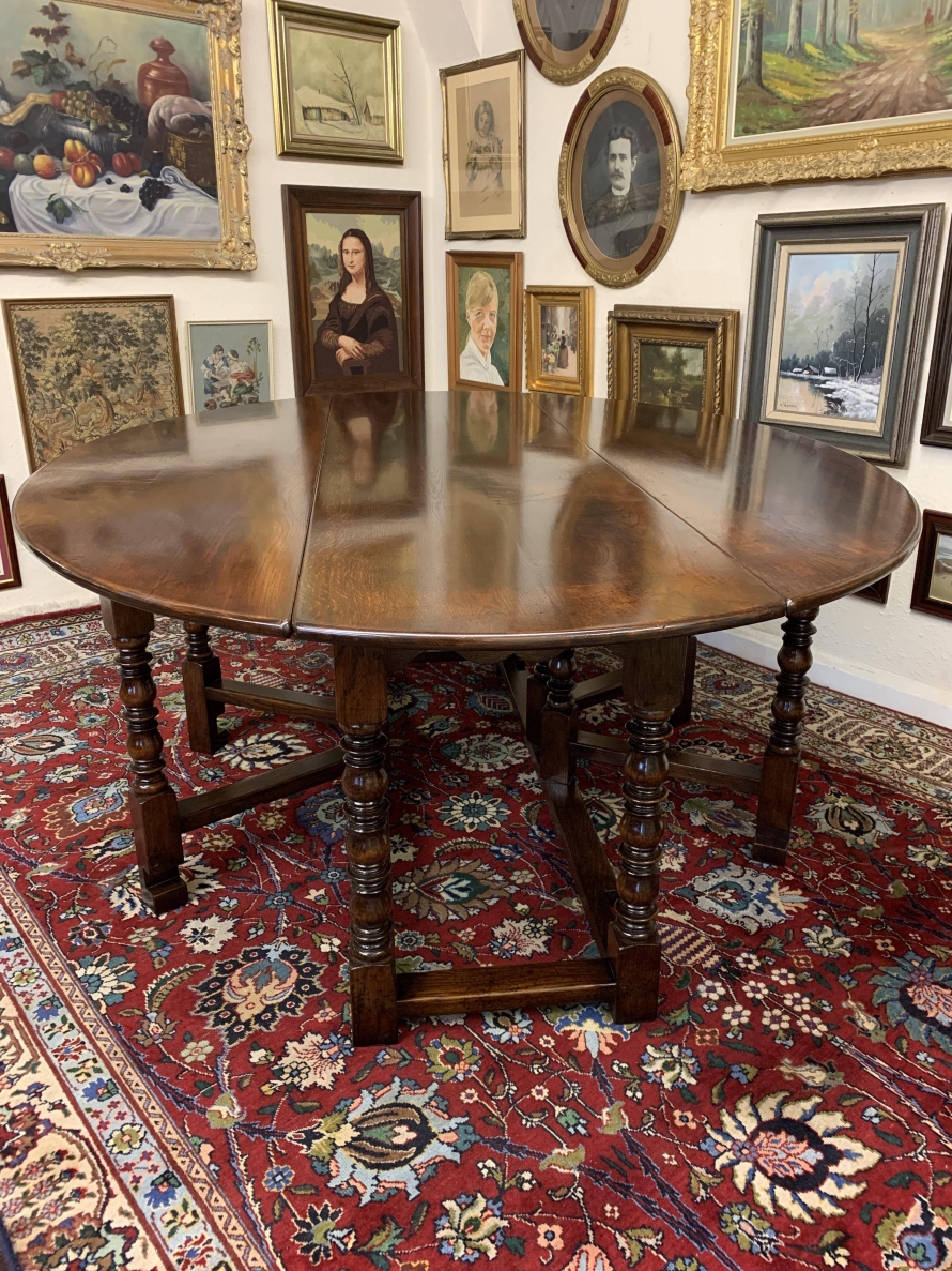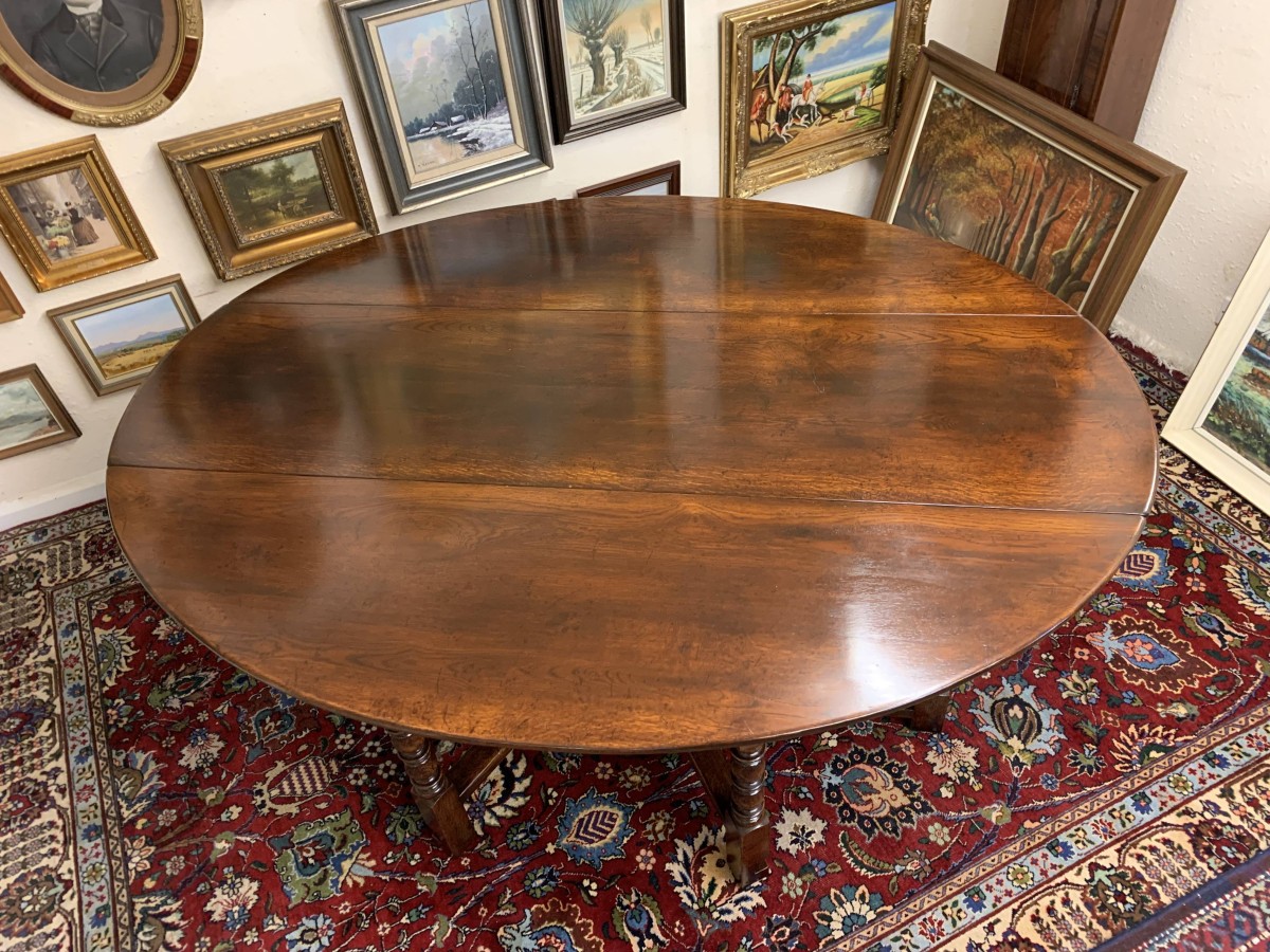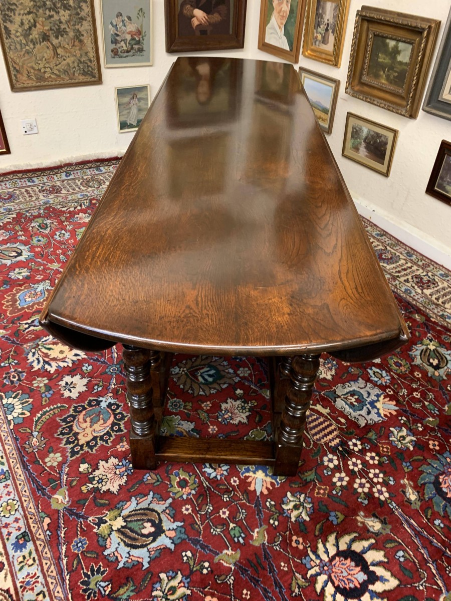 Made in striking oak and having a fabulous platina. The table has two drop down leaves which when open sit on a fabulous turned double gate. Fabulous large table.