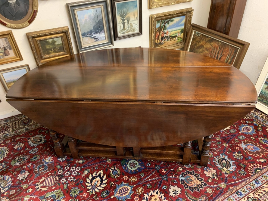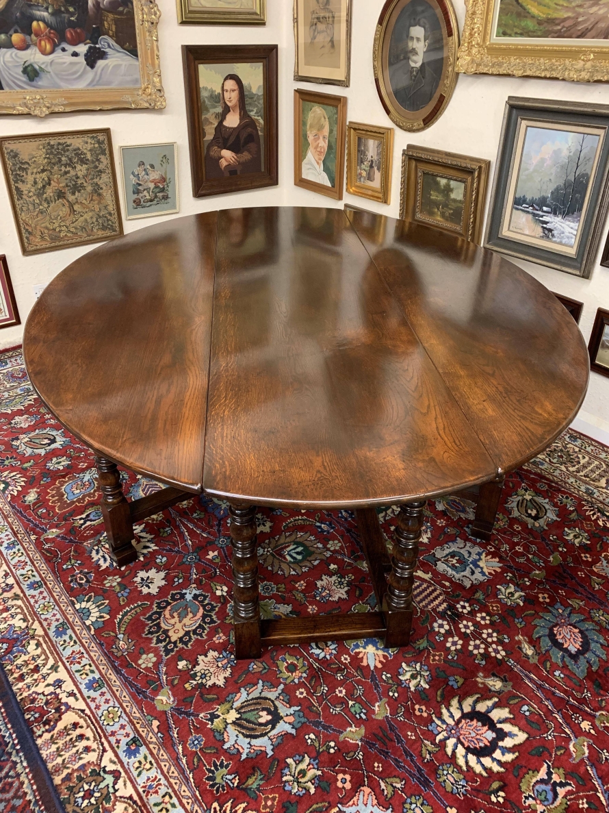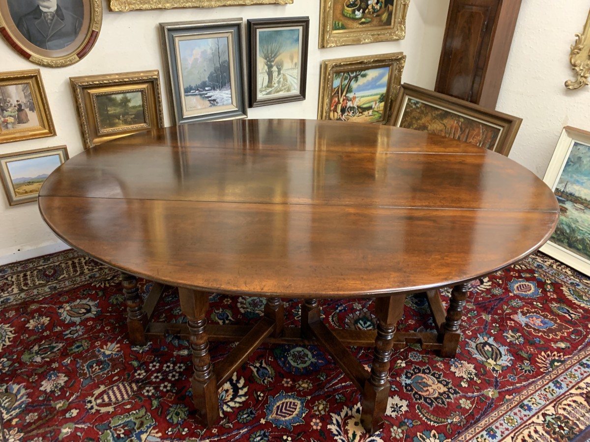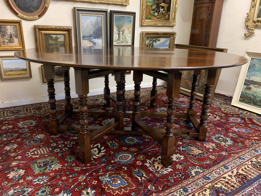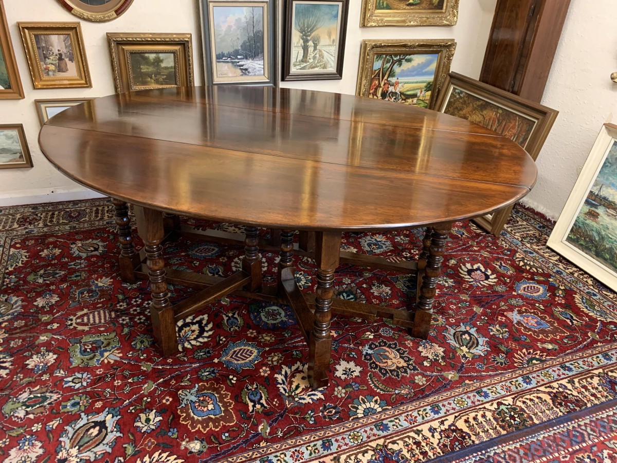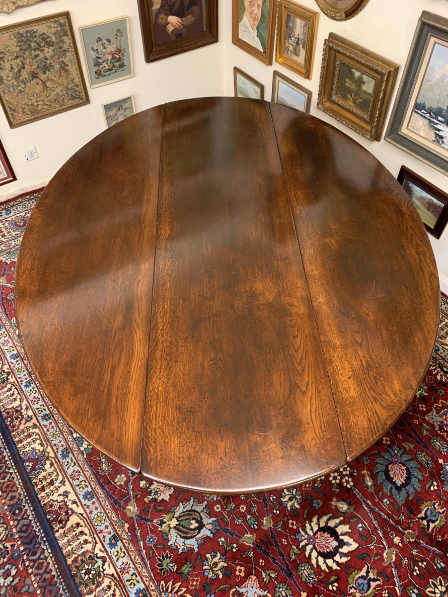 Made in striking oak and having a fabulous platina. The table has two drop down leaves which when open sit on a fabulous turned double gate. Fabulous large table.