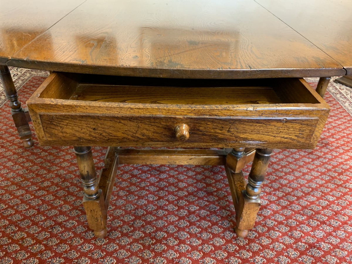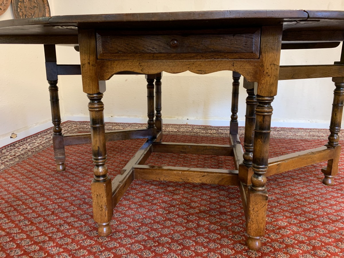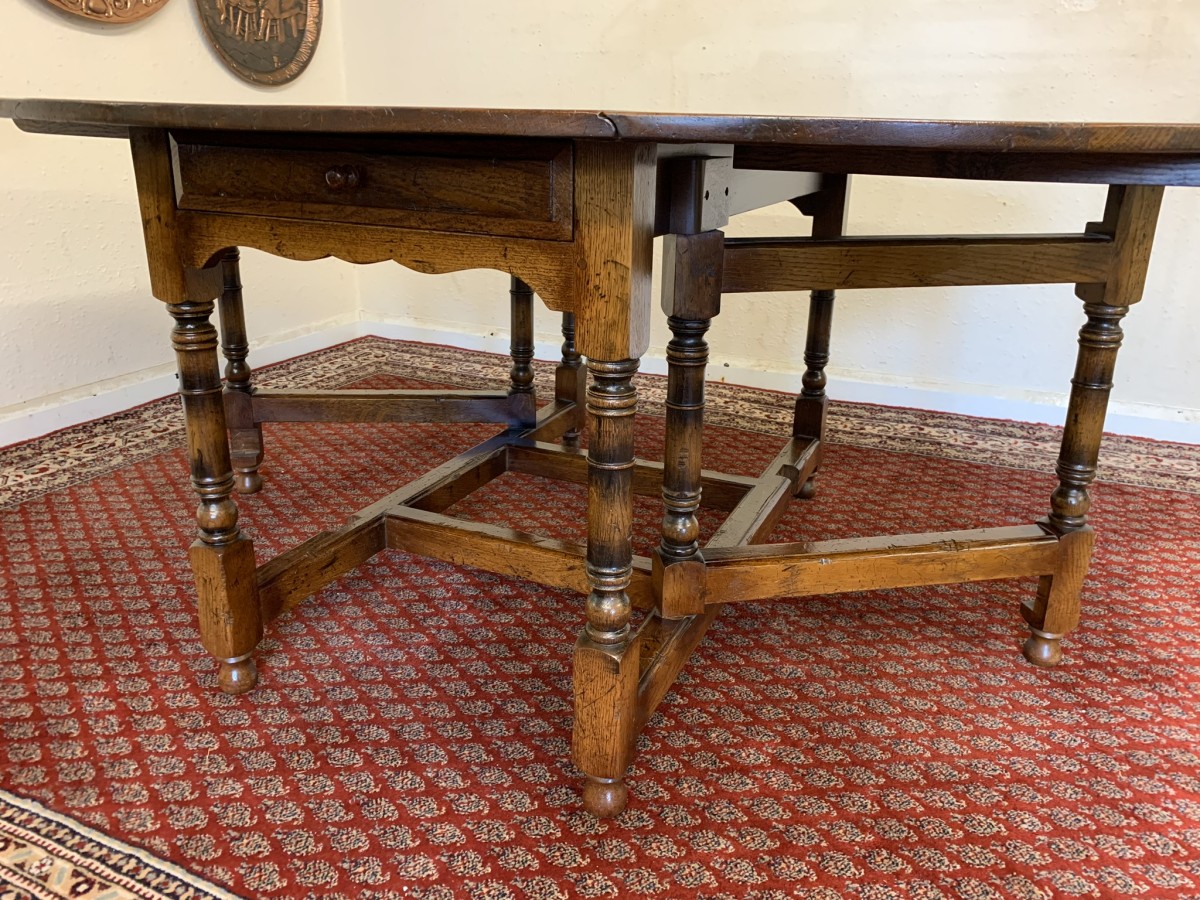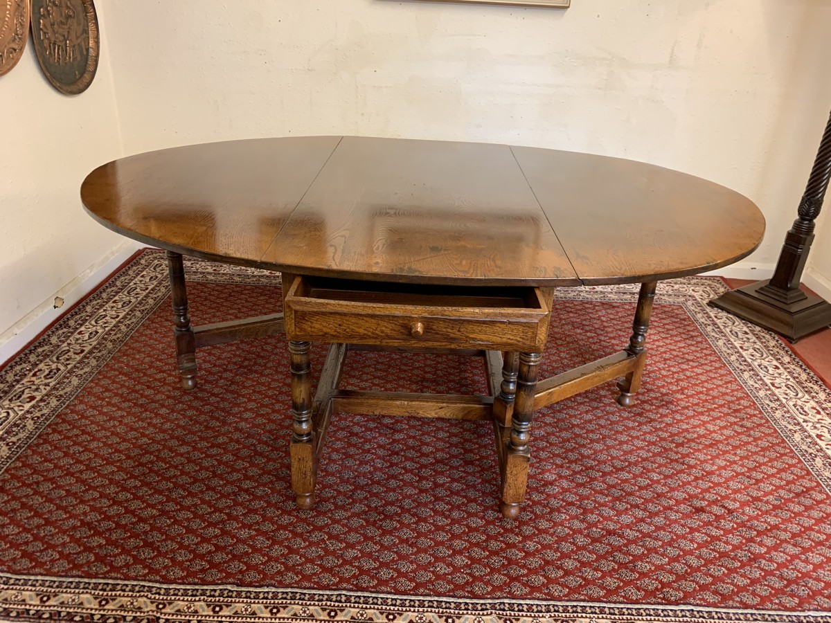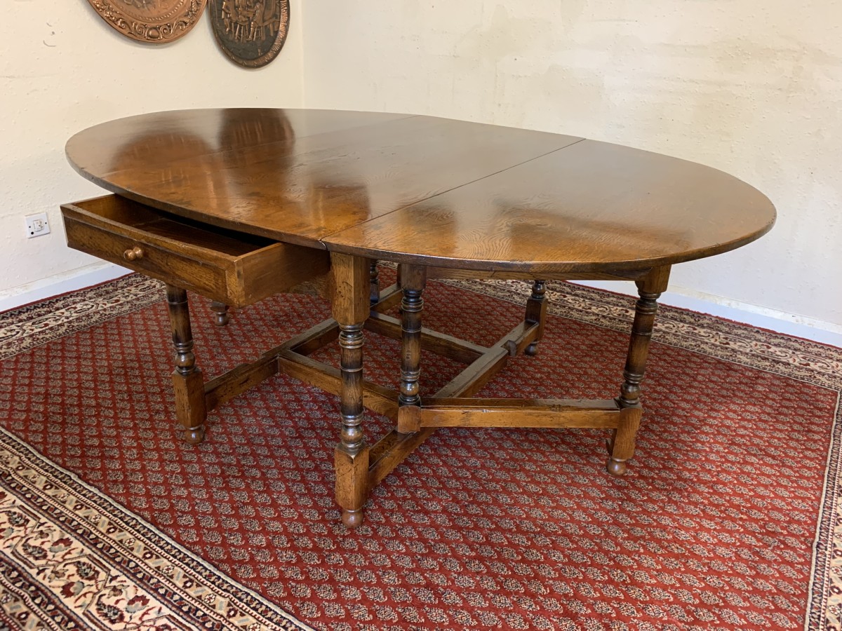 This large gate leg table is in excellent condition and is made entirely in solid oak. The table extends on gate leg turned supports and has a drawer . Fabulous turned legs, stretcher supports and standing on turned feet.