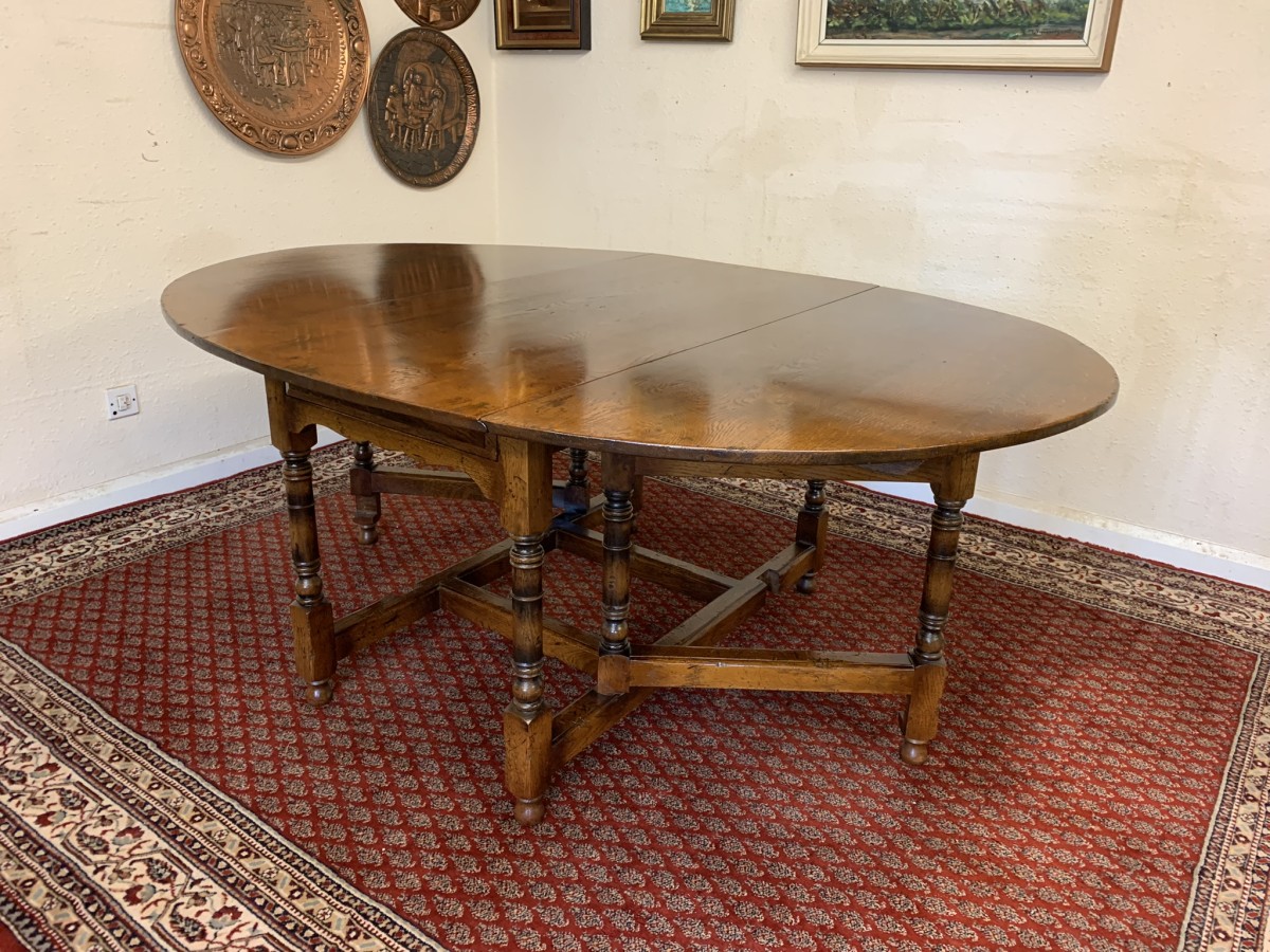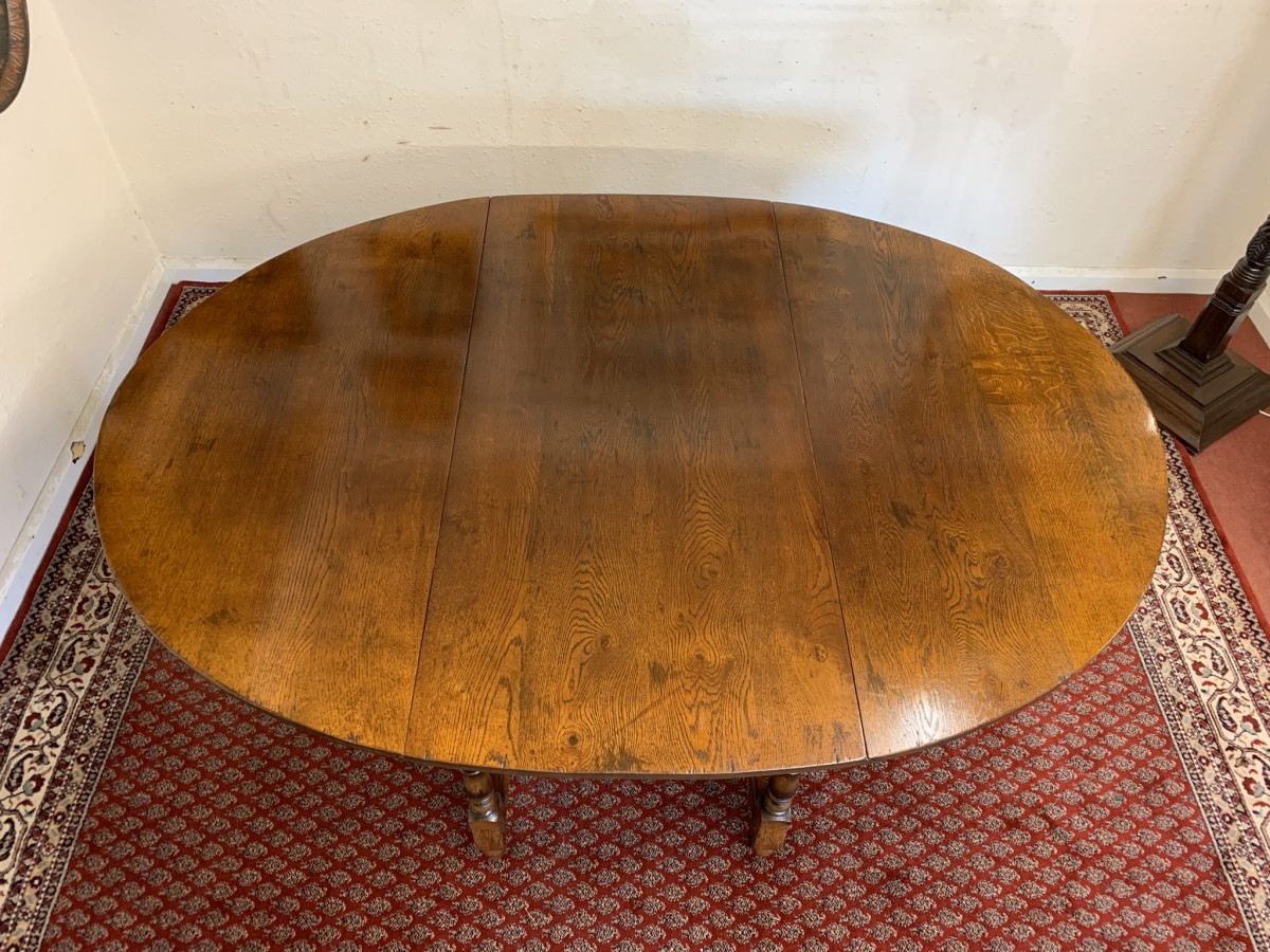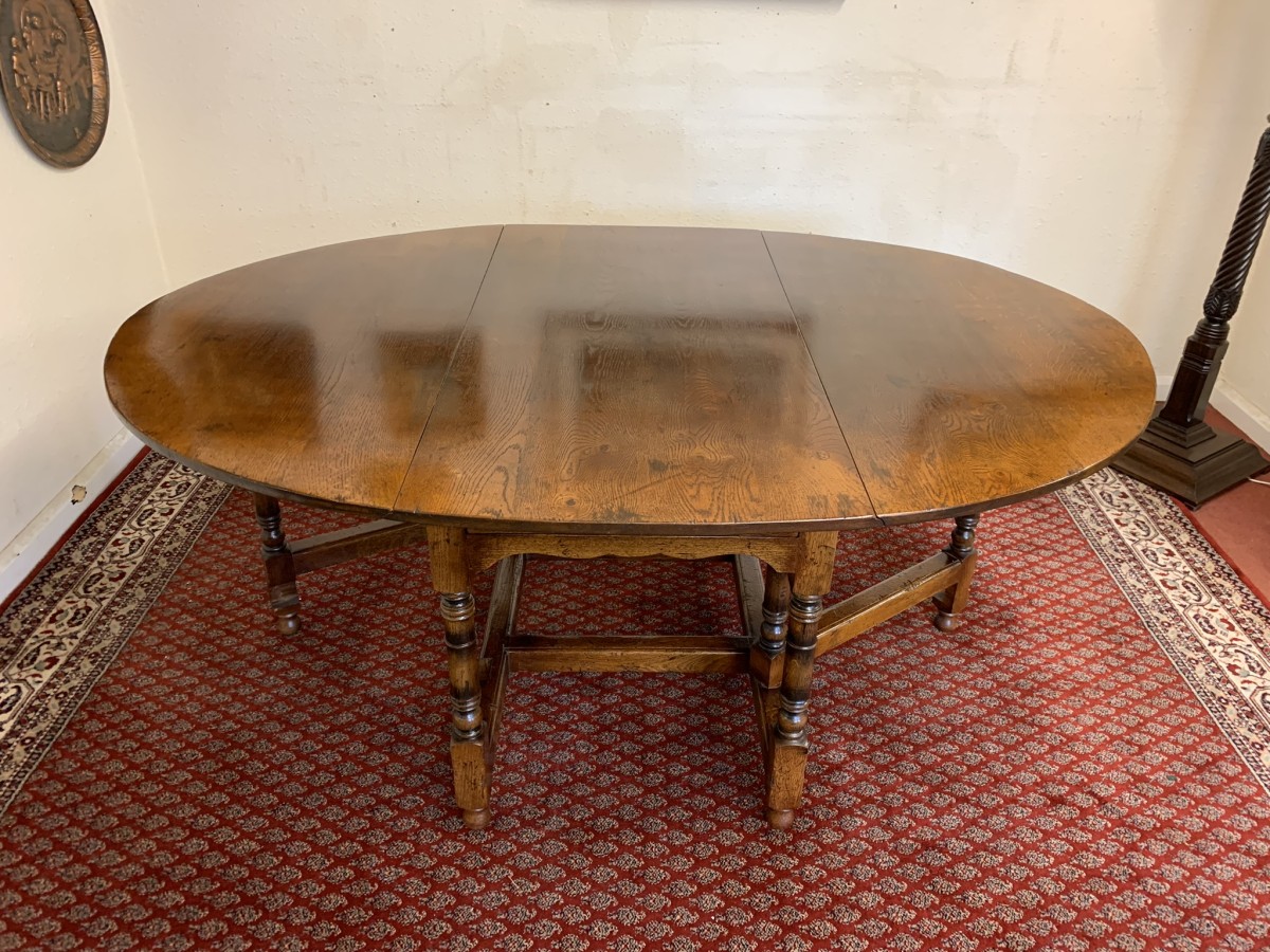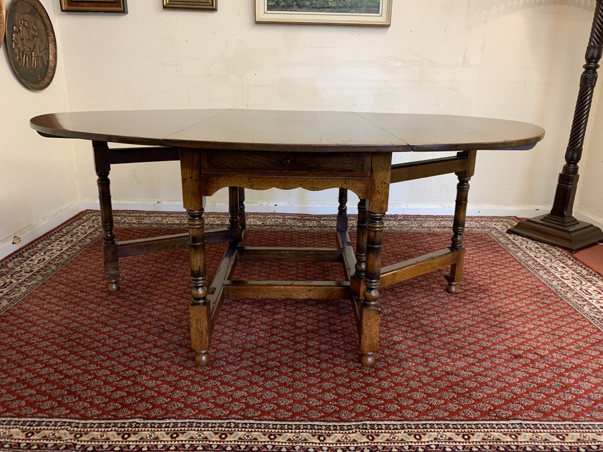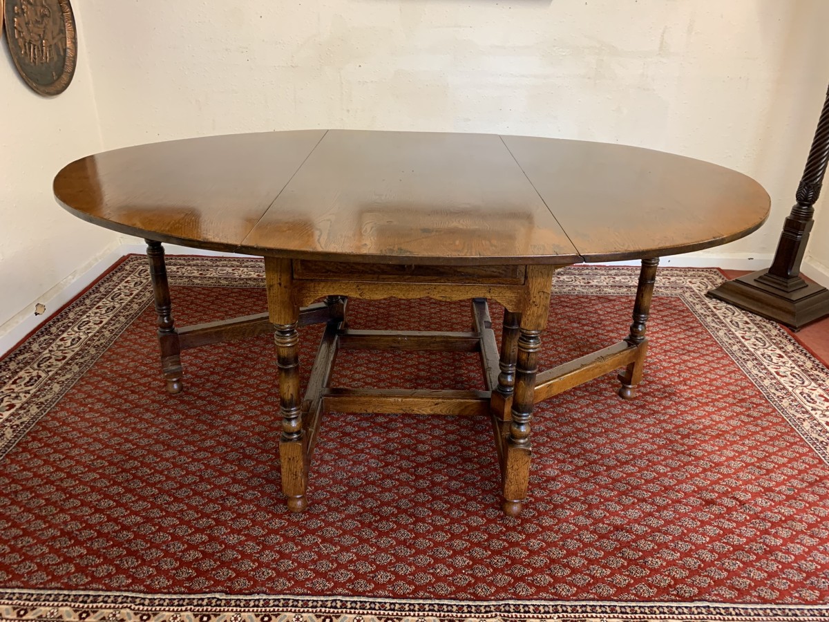 This large gate leg table is in excellent condition and is made entirely in solid oak. The table extends on gate leg turned supports and has a drawer . Fabulous turned legs, stretcher supports and standing on turned feet.
