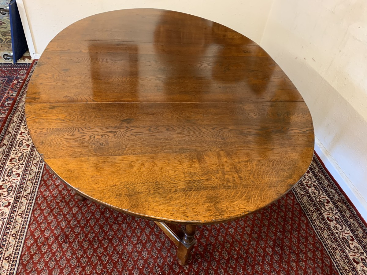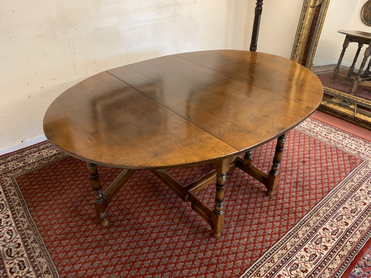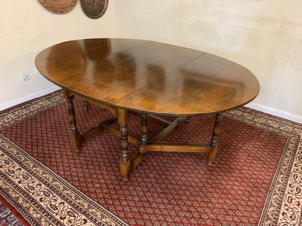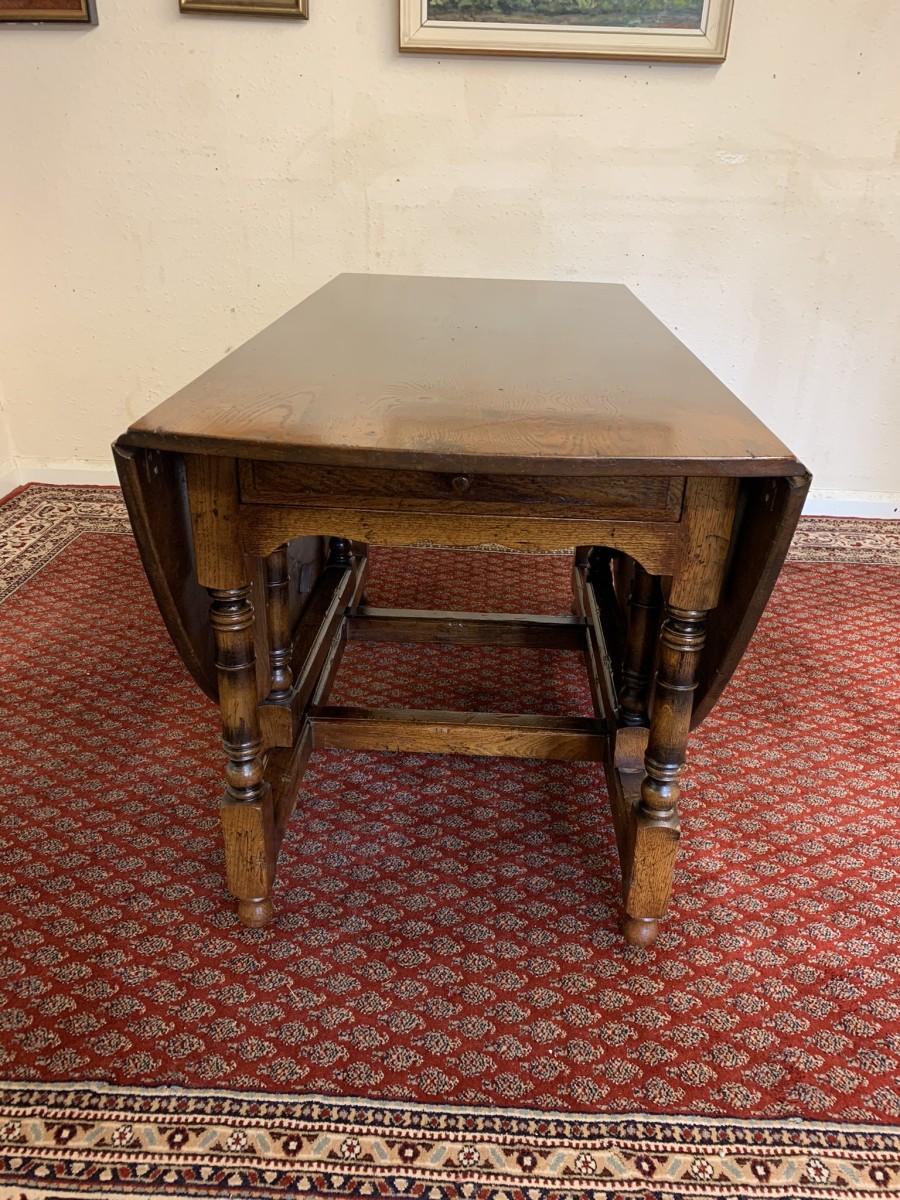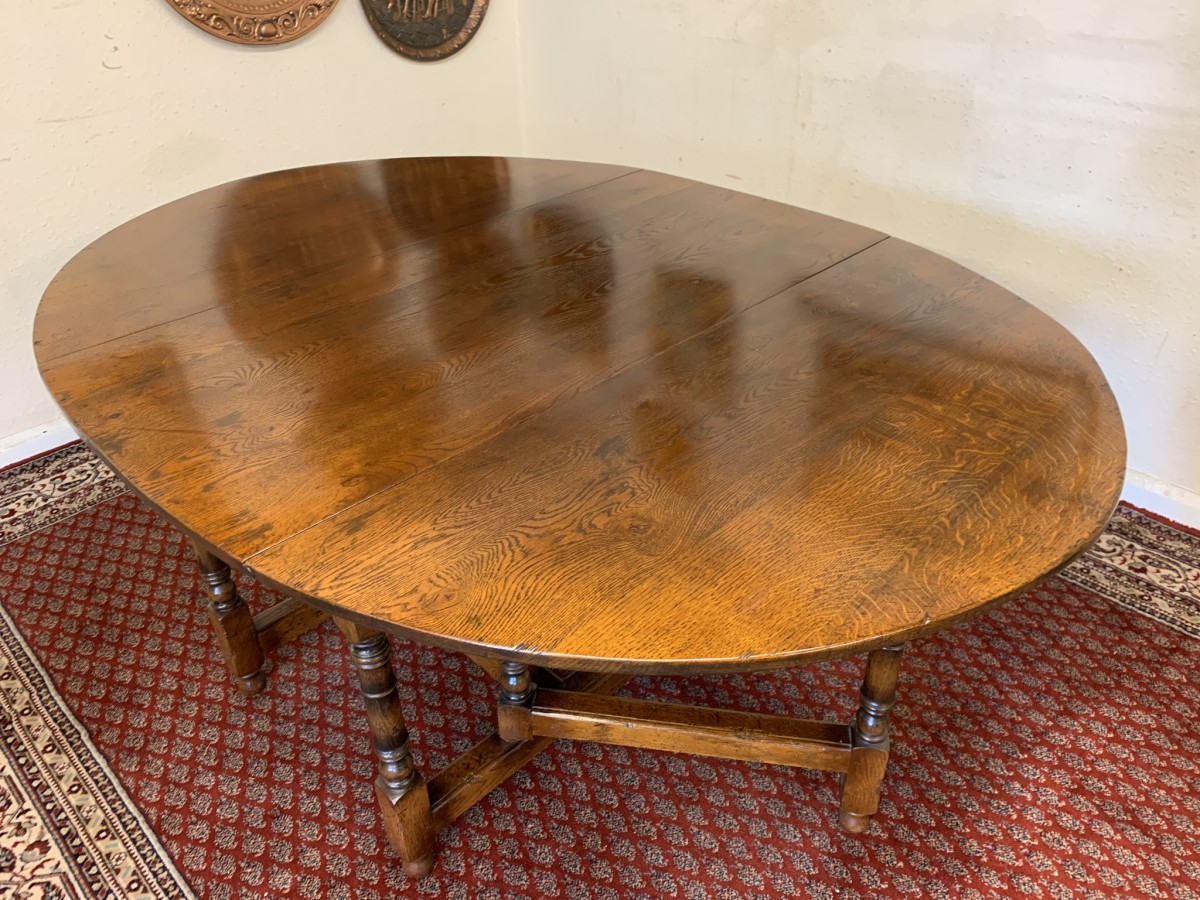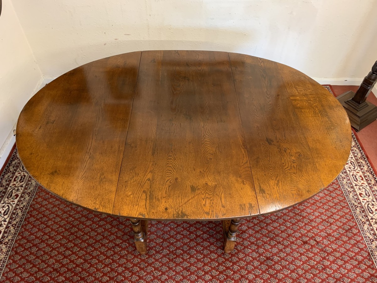 This large gate leg table is in excellent condition and is made entirely in solid oak. The table extends on gate leg turned supports and has a drawer . Fabulous turned legs, stretcher supports and standing on turned feet.