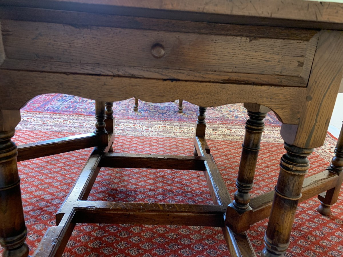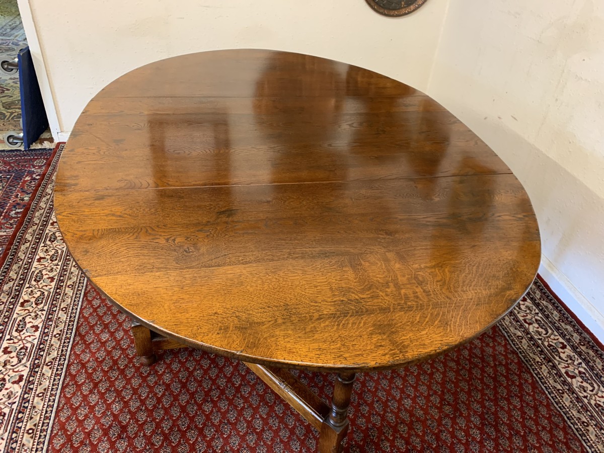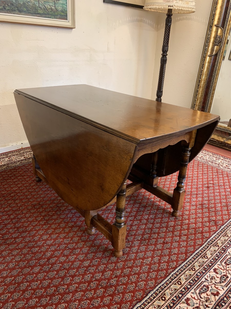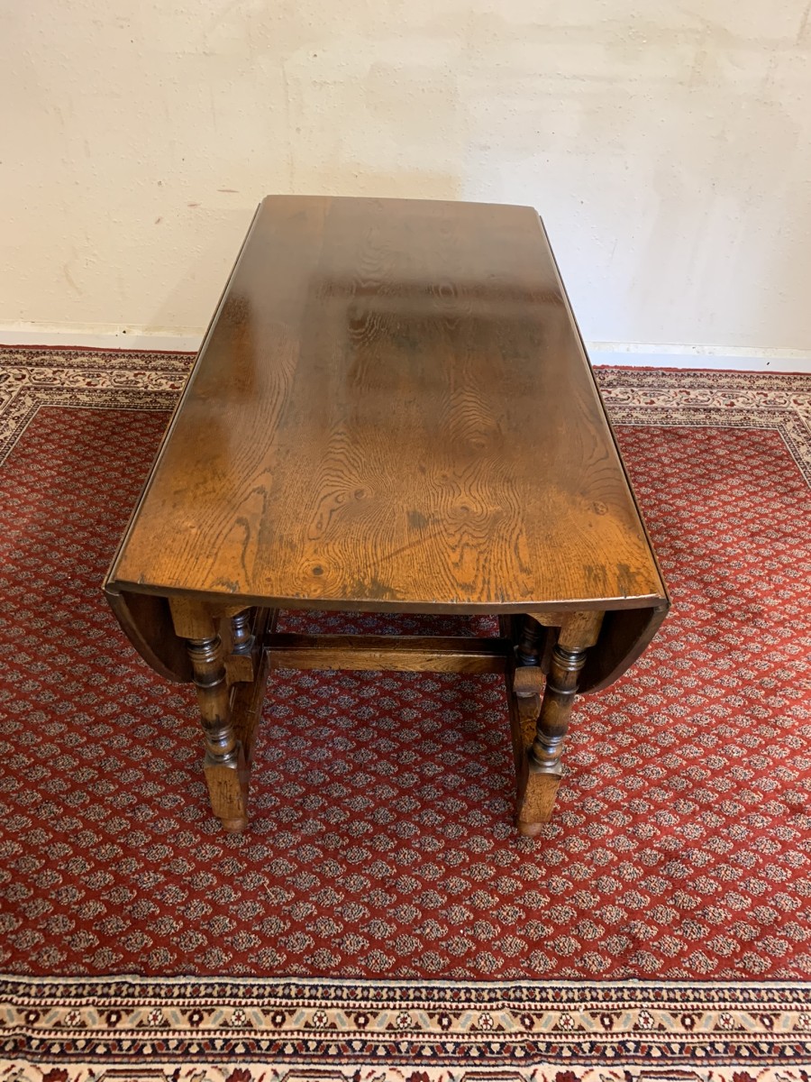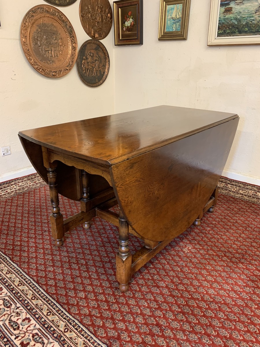 This large gate leg table is in excellent condition and is made entirely in solid oak. The table extends on gate leg turned supports and has a drawer . Fabulous turned legs, stretcher supports and standing on turned feet.