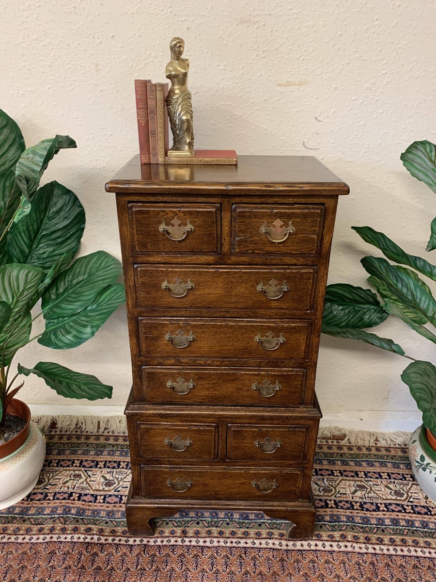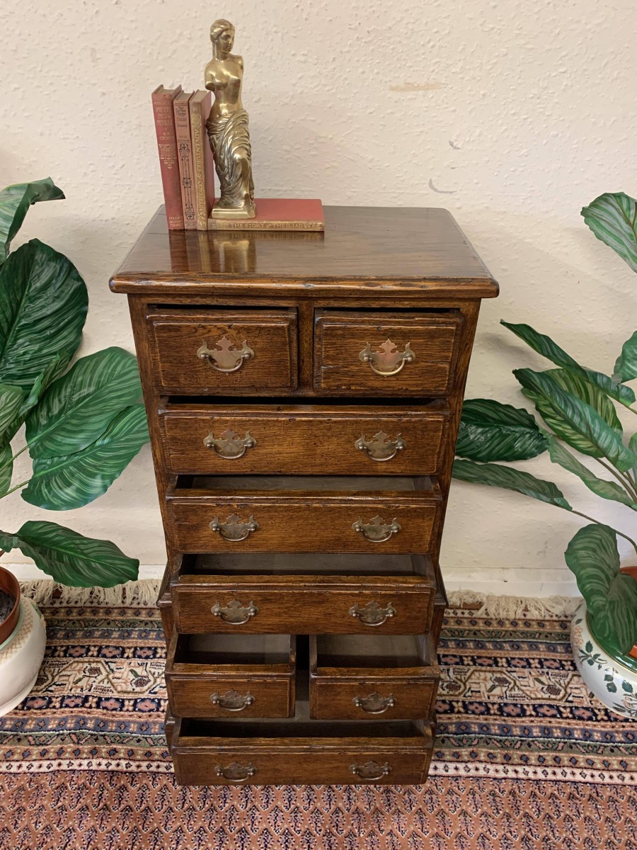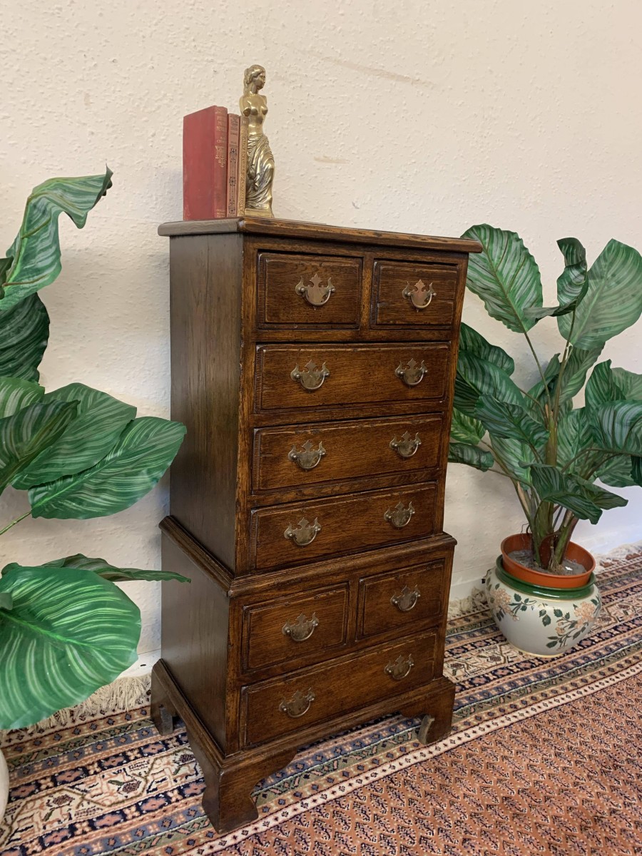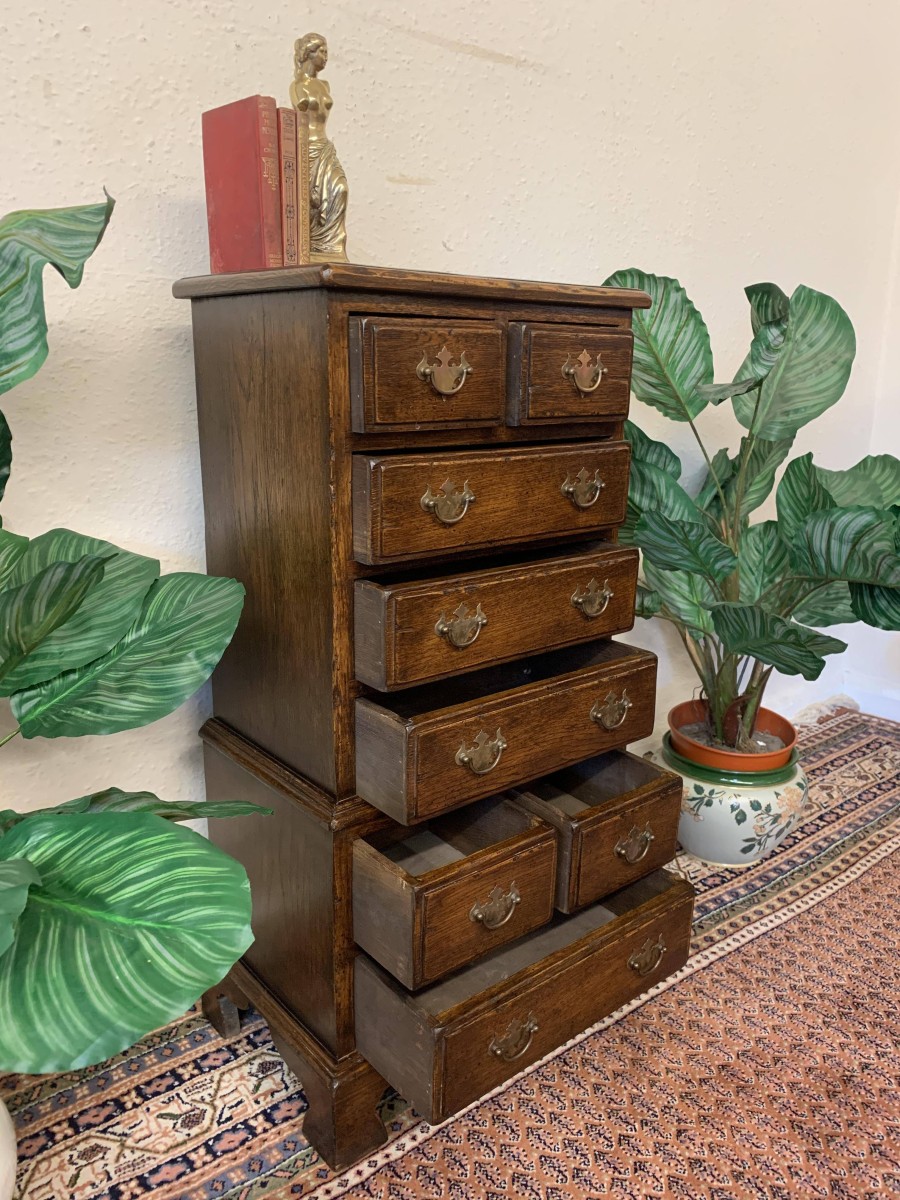 This glorious neat sized chest of drawers is made entirely of solid oak. The oversailing top sits above eight drawers. This is a great chest of drawers which sits on four bracket feet.