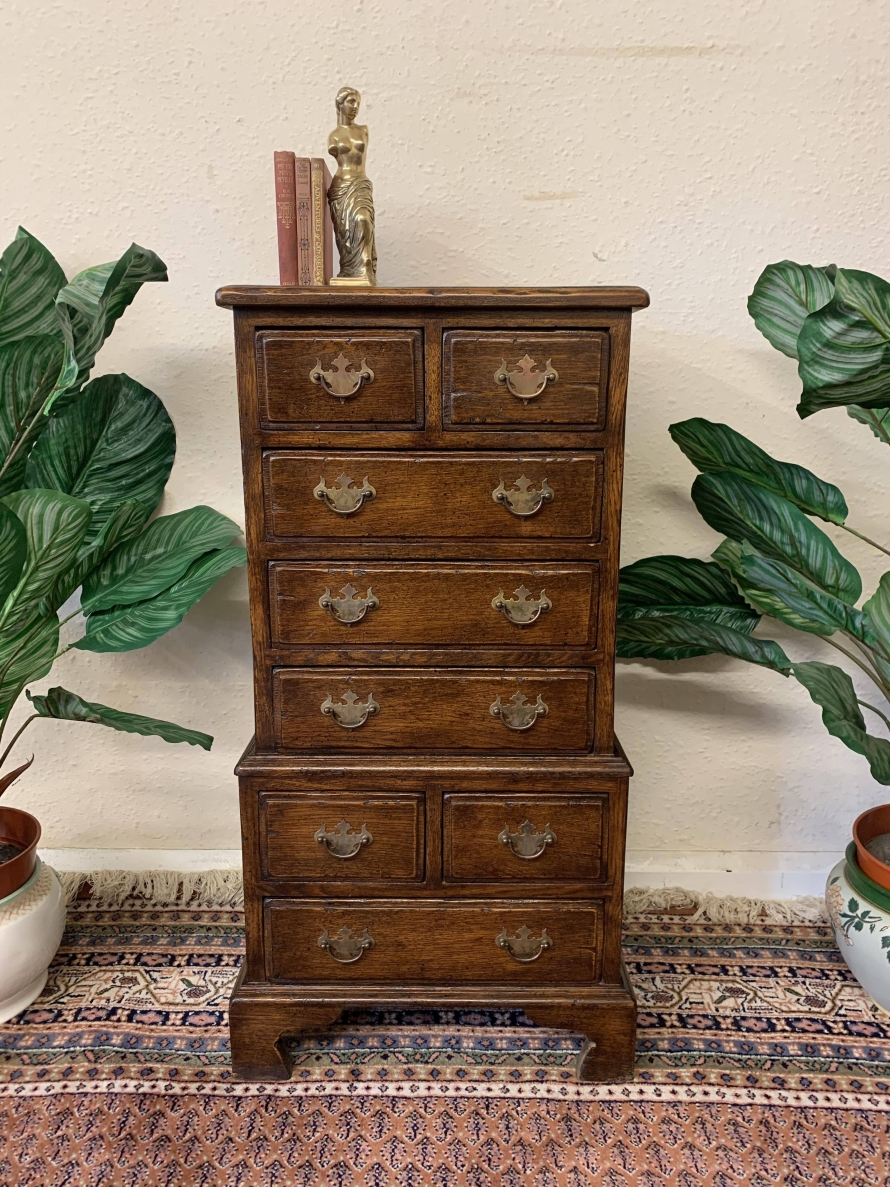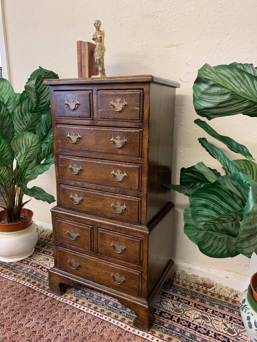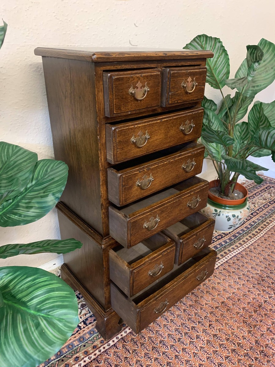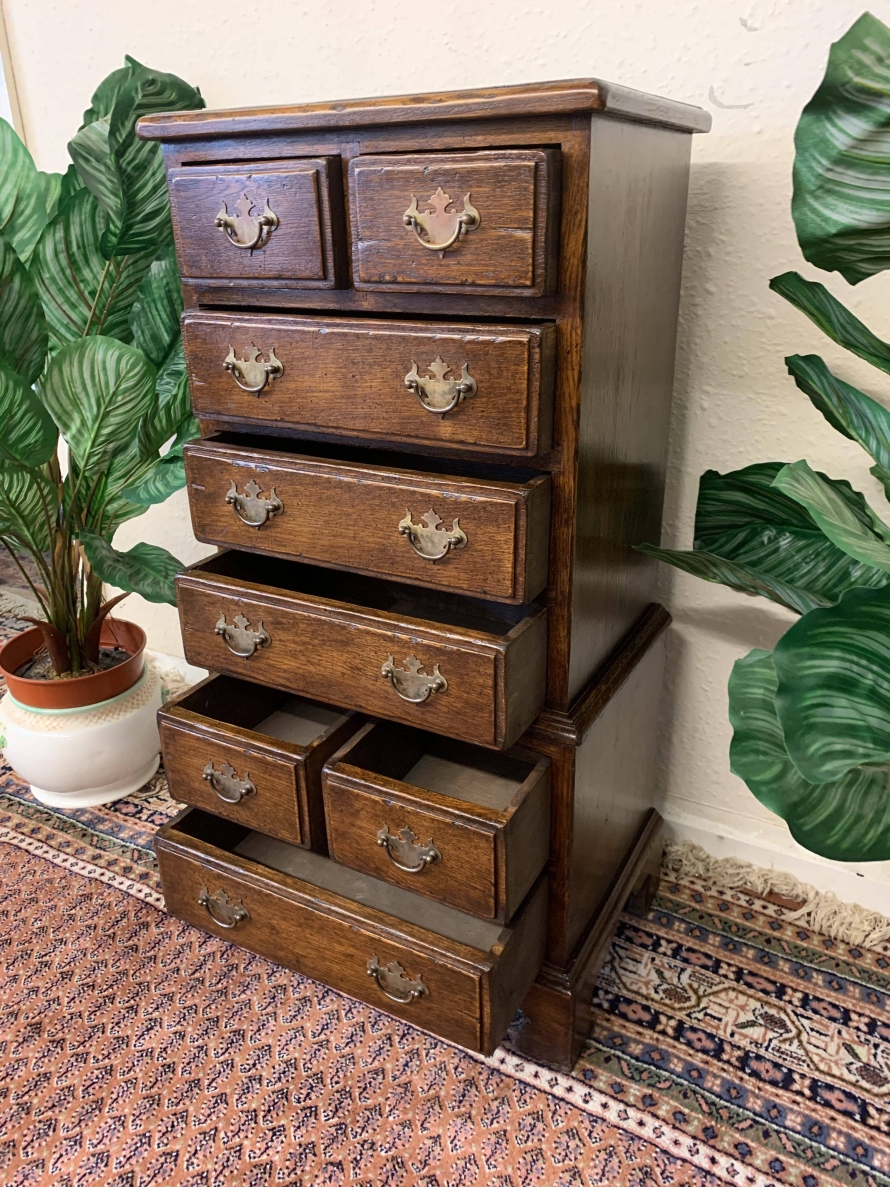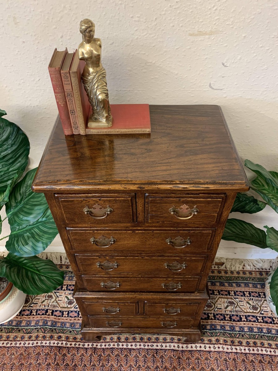 This glorious neat sized chest of drawers is made entirely of solid oak. The oversailing top sits above eight drawers. This is a great chest of drawers which sits on four bracket feet.