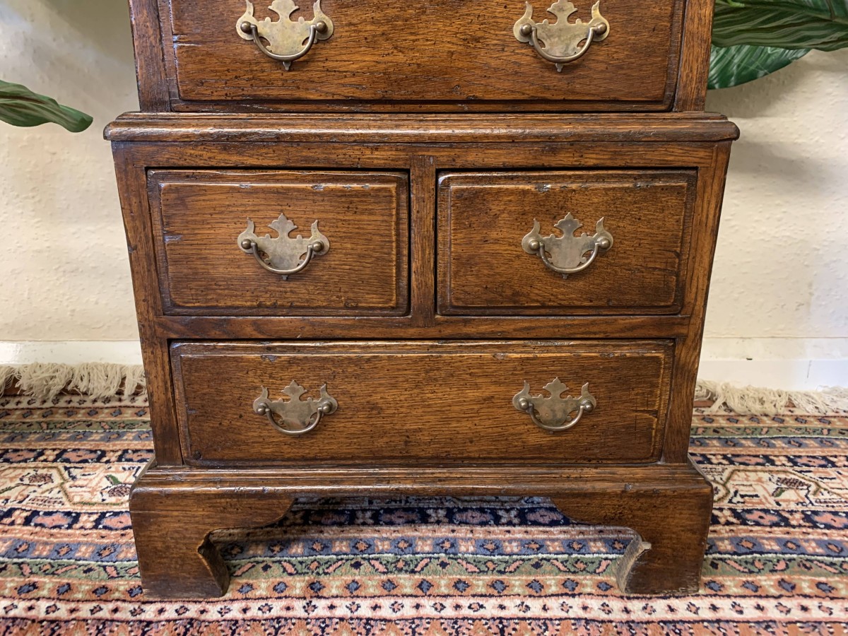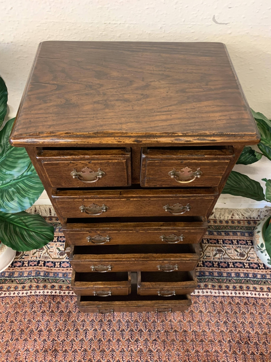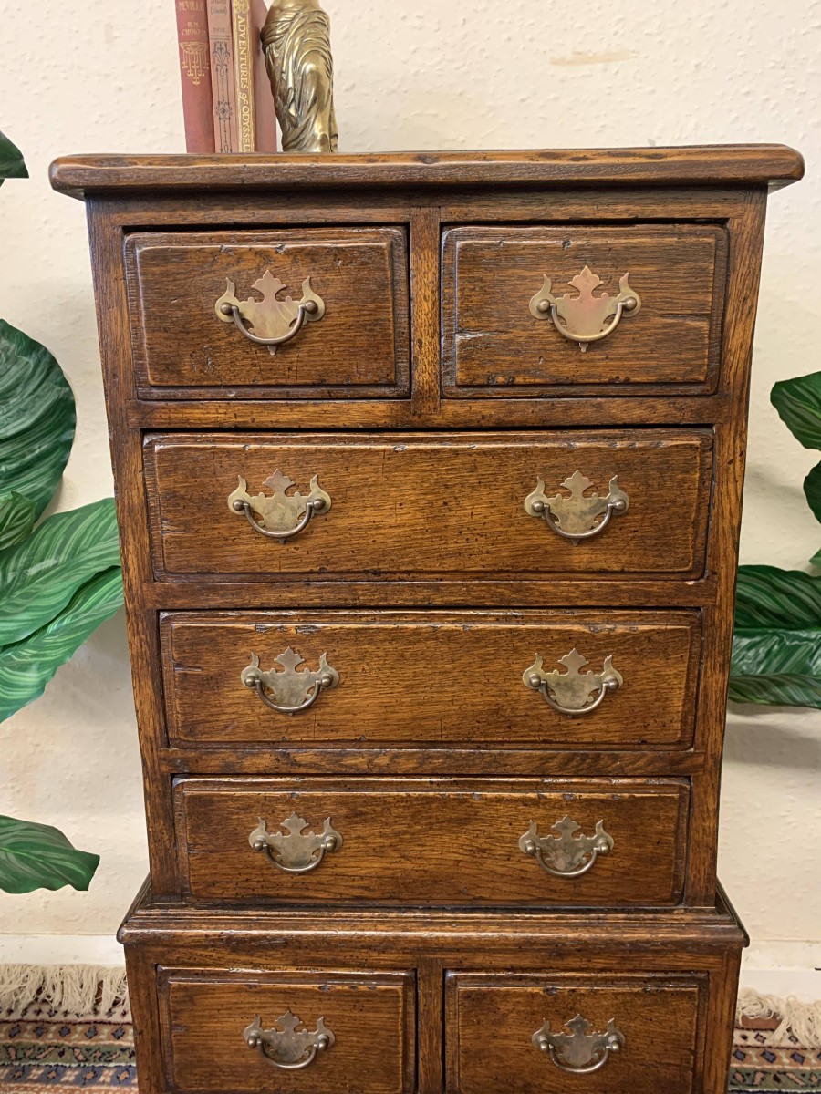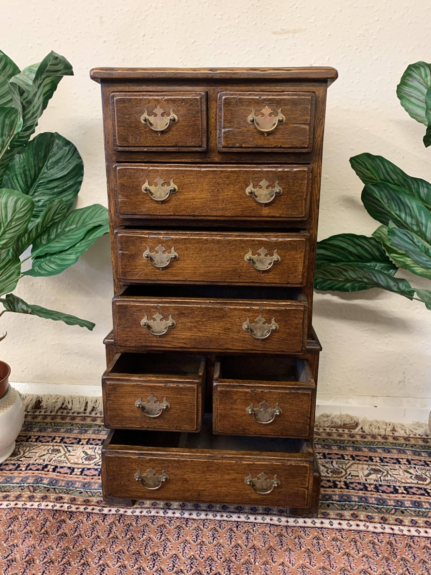 This glorious neat sized chest of drawers is made entirely of solid oak. The oversailing top sits above eight drawers. This is a great chest of drawers which sits on four bracket feet.