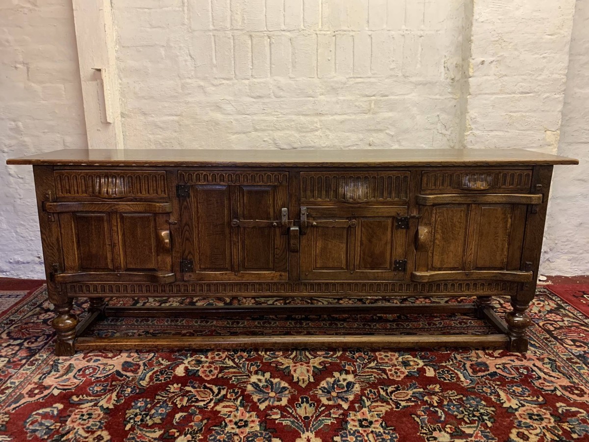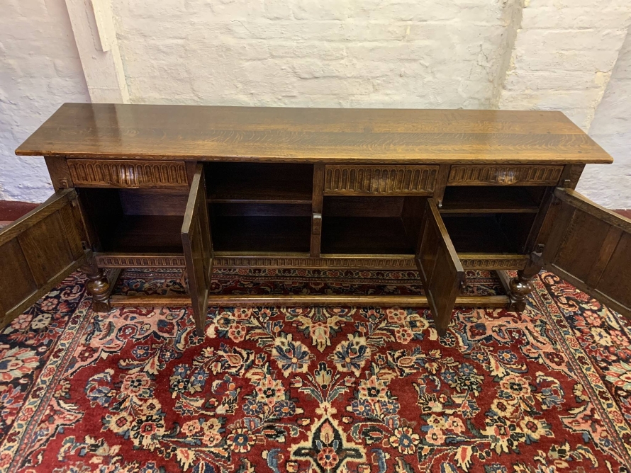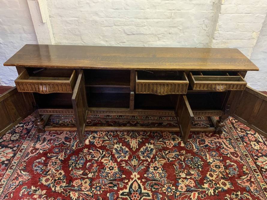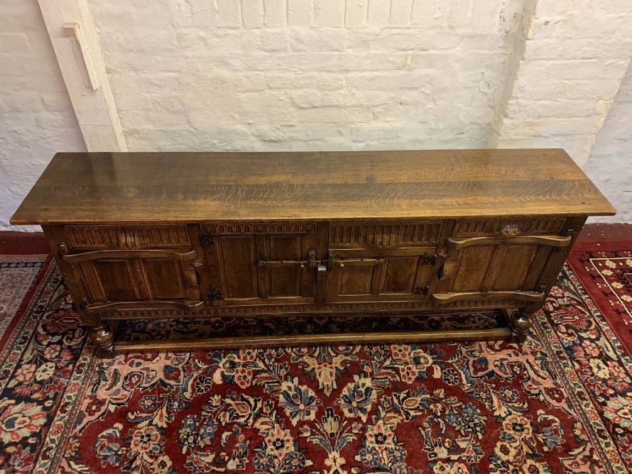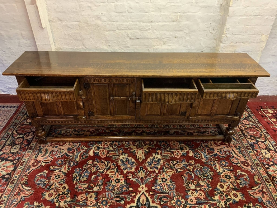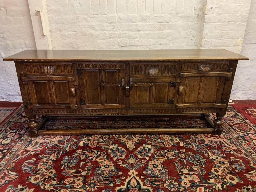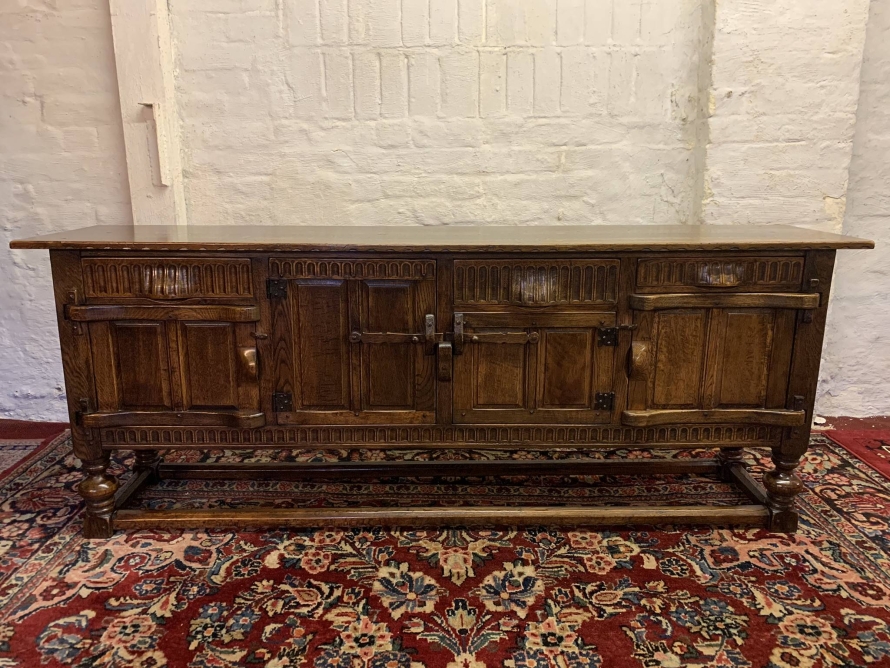 This fabulous quality oak dresser which is in excellent condition is made by the renowned Nigel Rupert Griffiths furniture company. Made entirely in solid oak each item of Nigel Rupert Griffiths furniture has hand cut dovetails and is planed, sanded, carved, stained and polished by hand. The oversailing top sits above four lockable recessed panelled doors and three drawers, each drawer having an eyebrow handle. The doors open to reveal good storage space. The sides have a carrying handle. Carved frieze, four turned legs with stretcher supports and standing on traditional block feet.