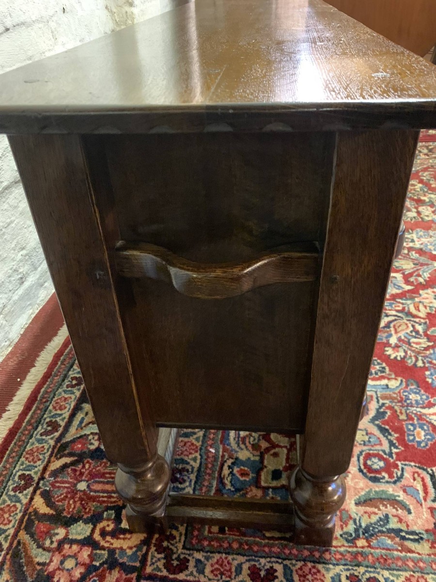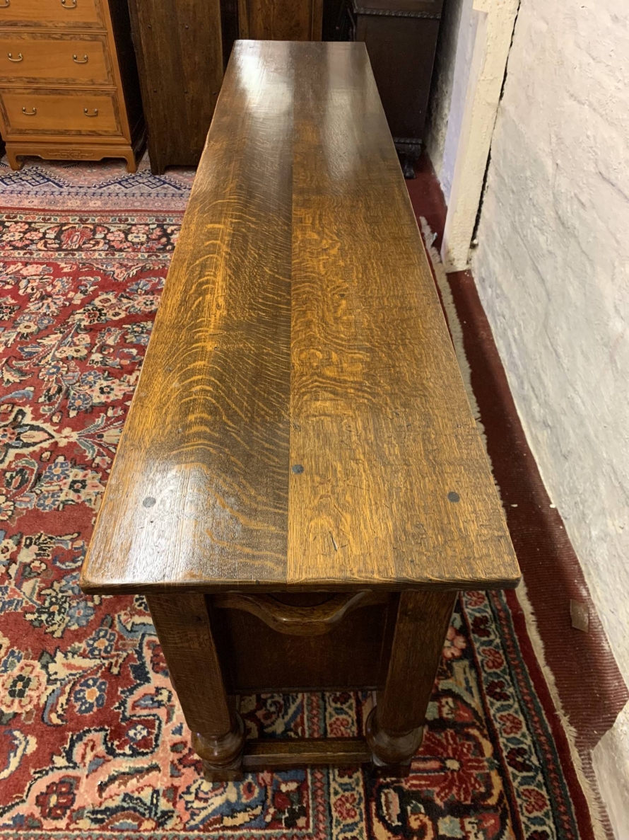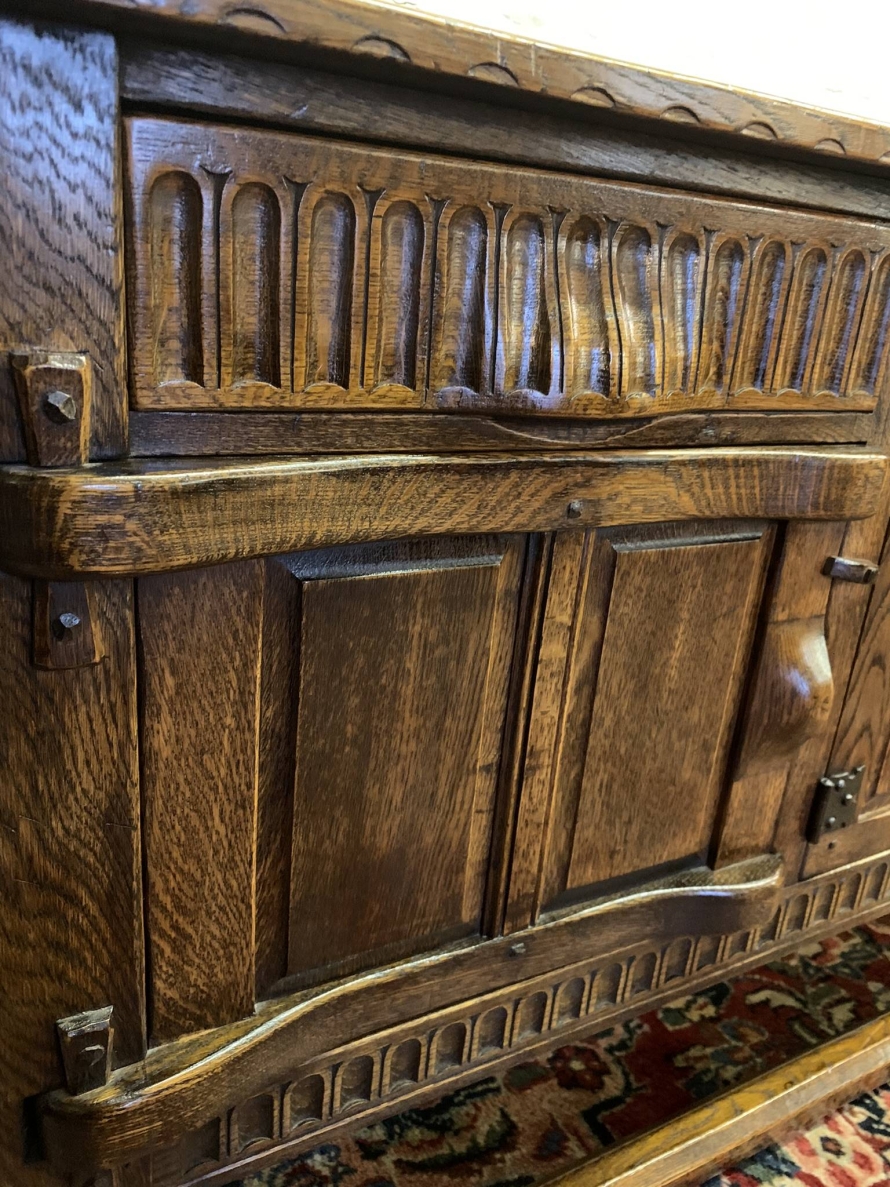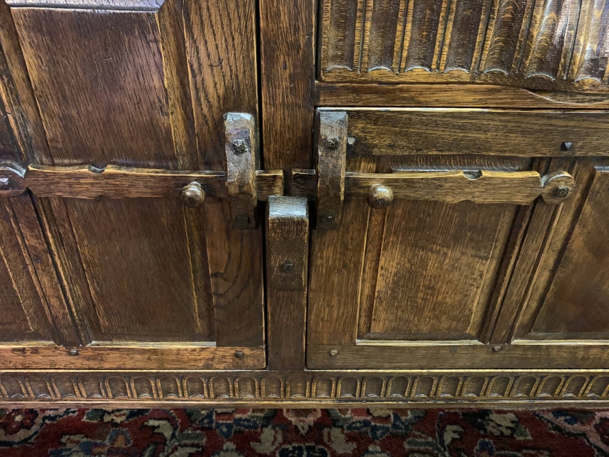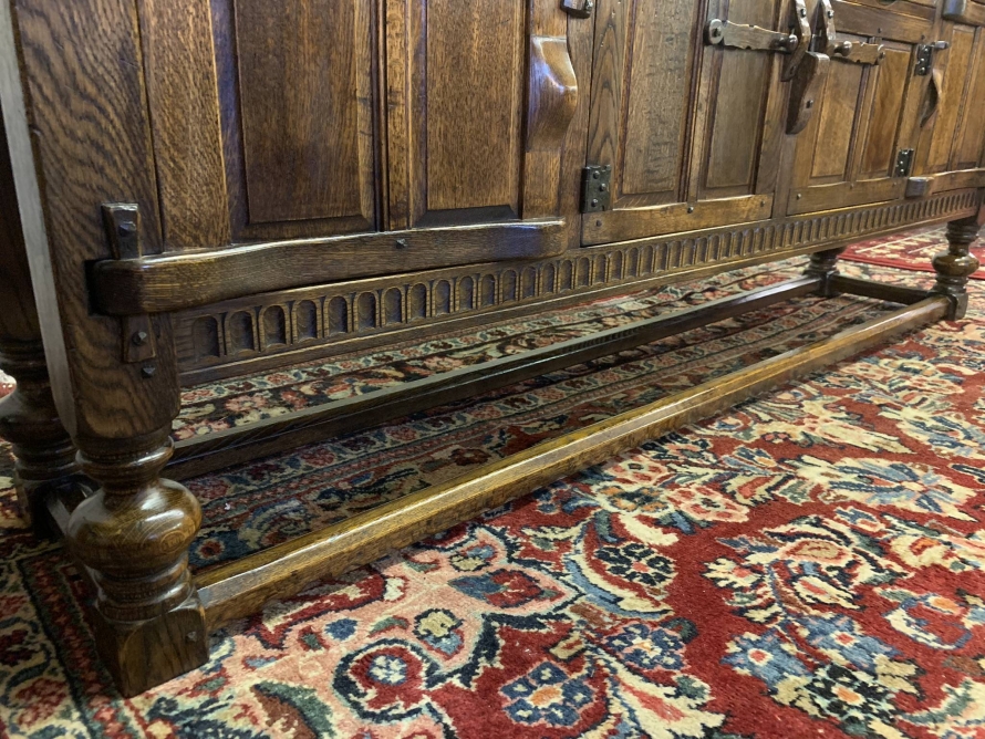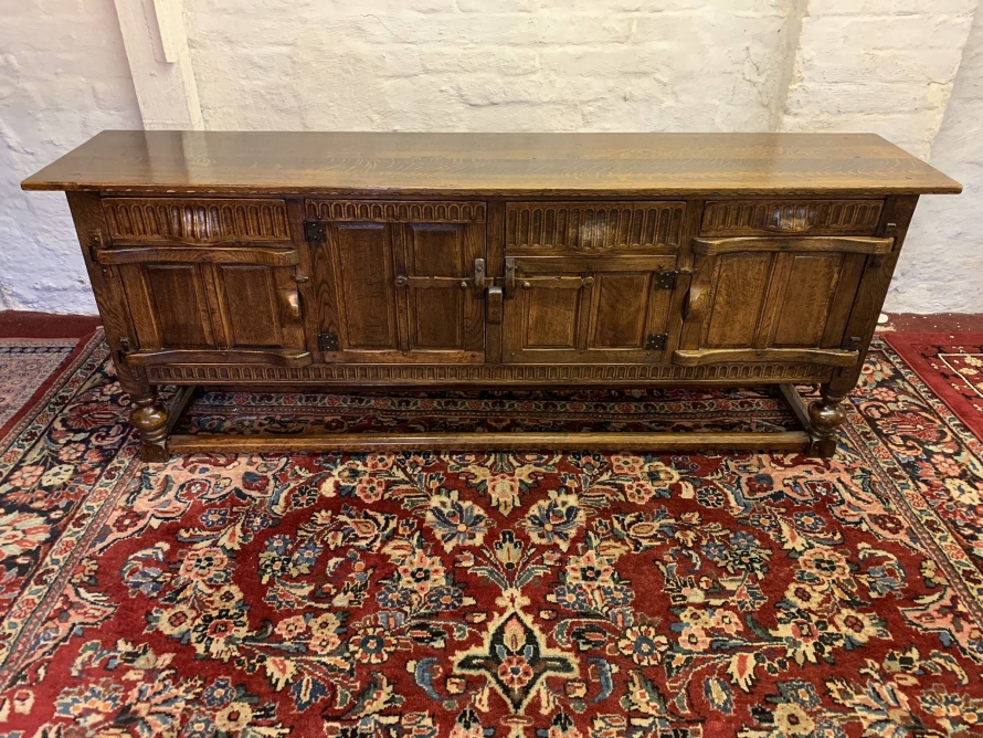 This fabulous quality oak dresser which is in excellent condition is made by the renowned Nigel Rupert Griffiths furniture company. Made entirely in solid oak each item of Nigel Rupert Griffiths furniture has hand cut dovetails and is planed, sanded, carved, stained and polished by hand. The oversailing top sits above four lockable recessed panelled doors and three drawers, each drawer having an eyebrow handle. The doors open to reveal good storage space. The sides have a carrying handle. Carved frieze, four turned legs with stretcher supports and standing on traditional block feet.