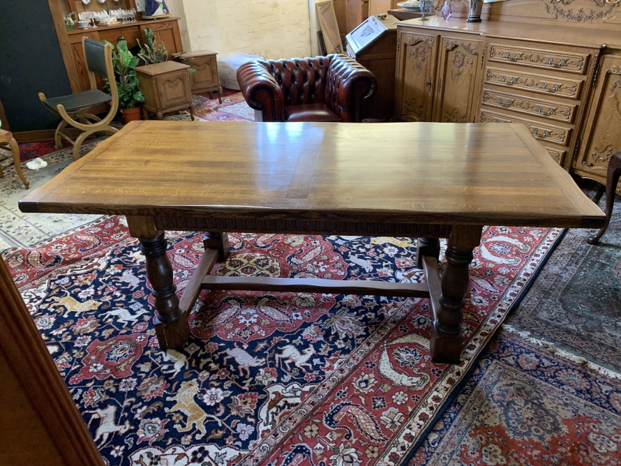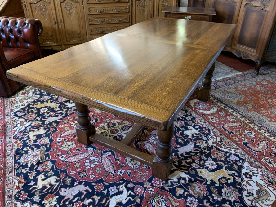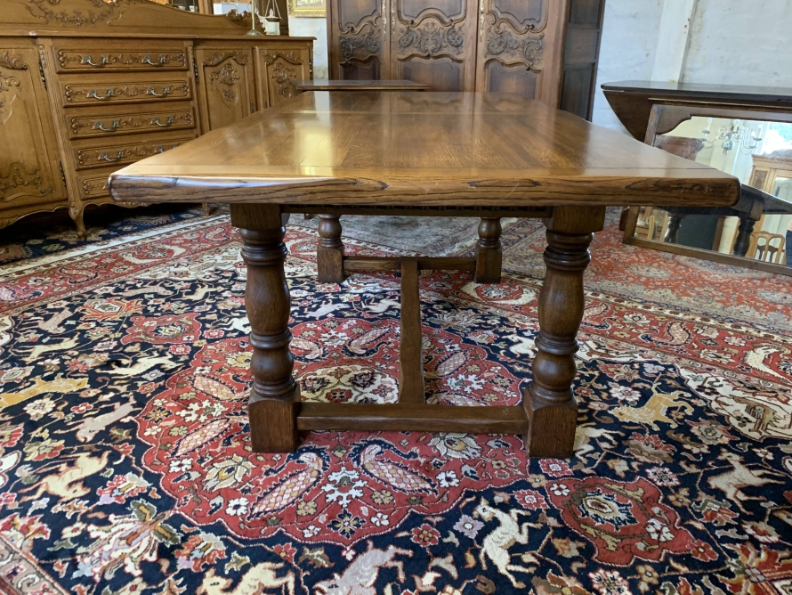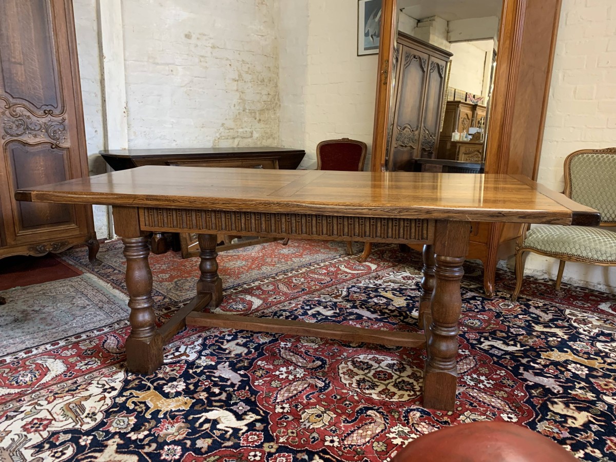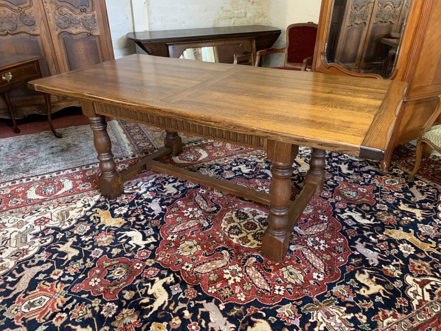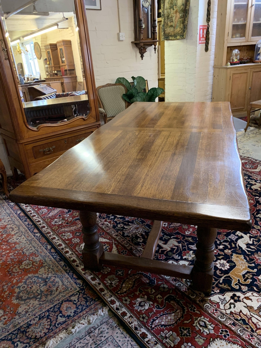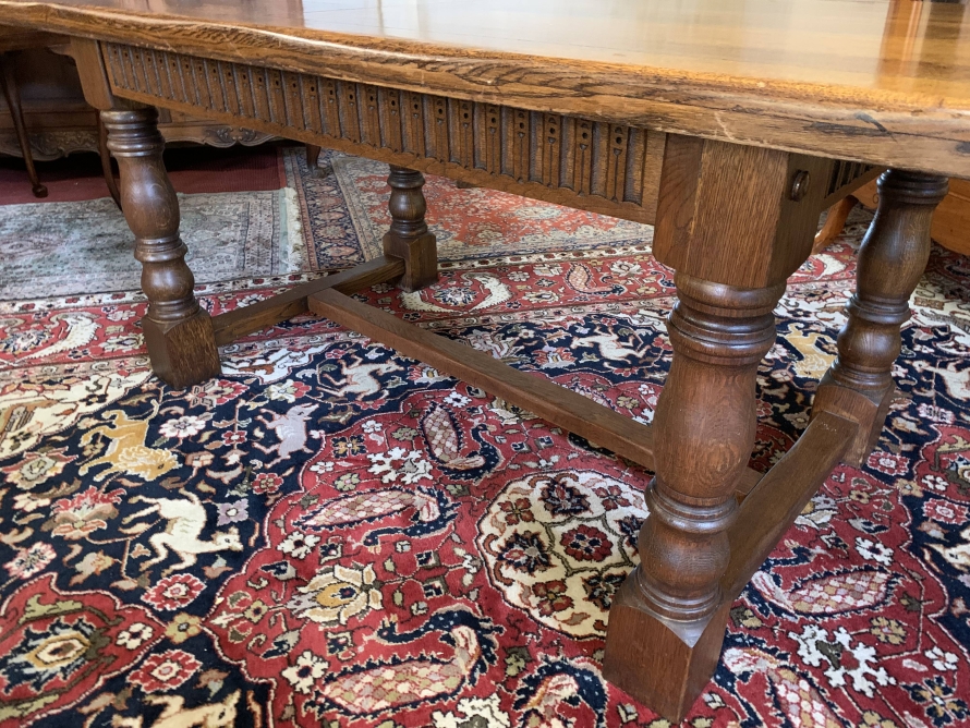 This large oak table offers ample dining space. The thick oak top sits on a base which has carved decoration, four fabulous turned legs with stretcher supports.
