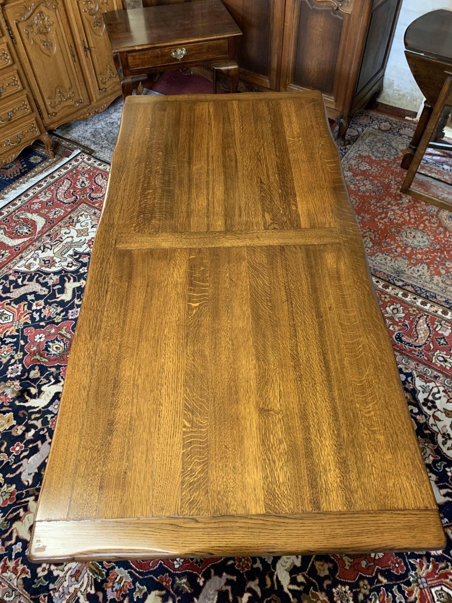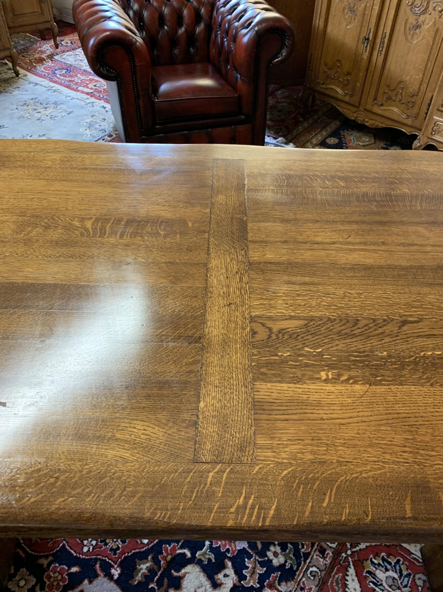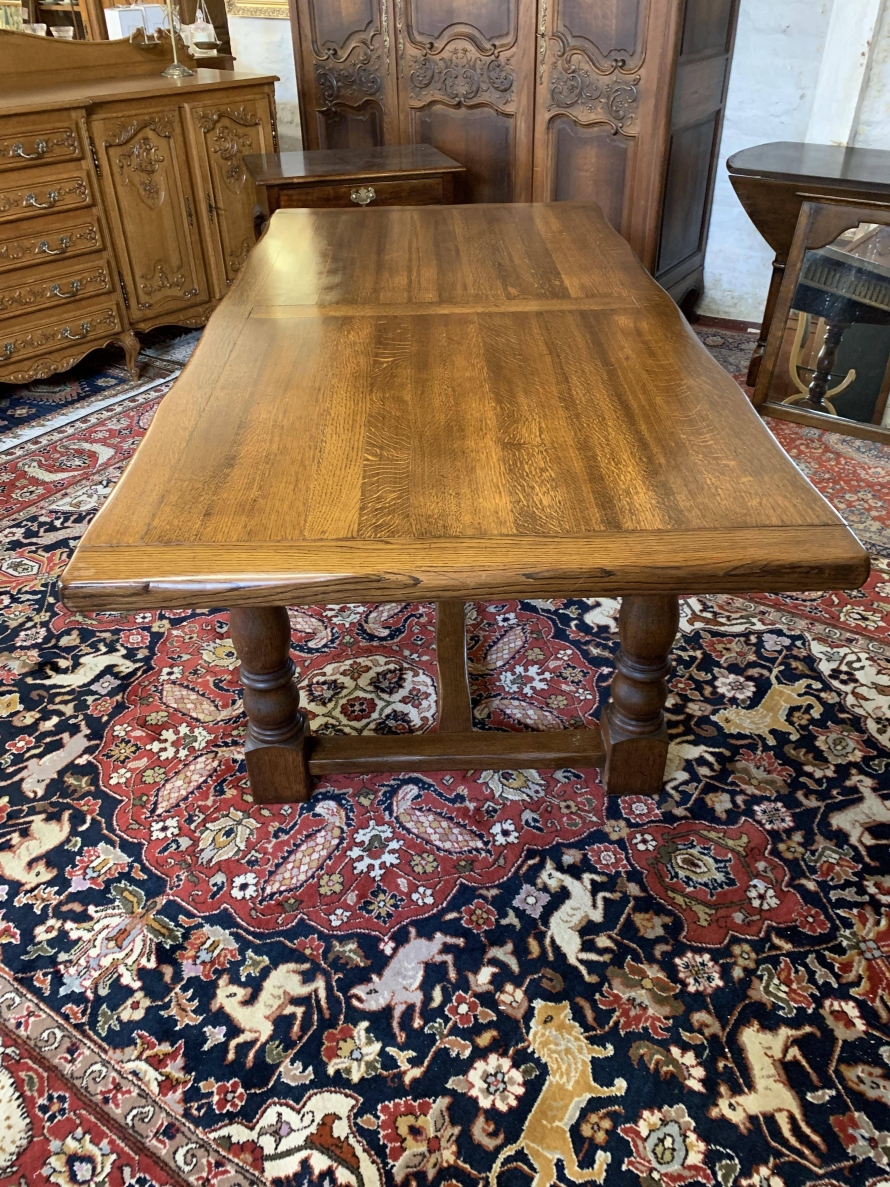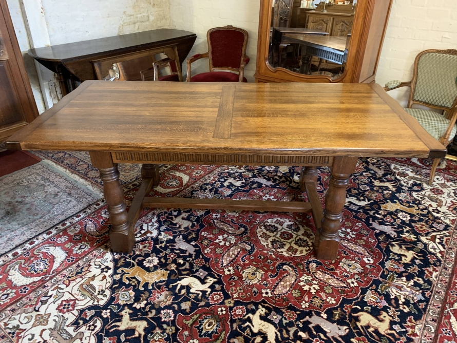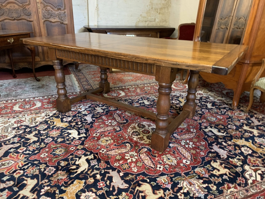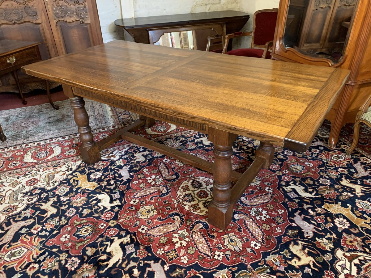 This large oak table offers ample dining space. The thick oak top sits on a base which has carved decoration, four fabulous turned legs with stretcher supports.