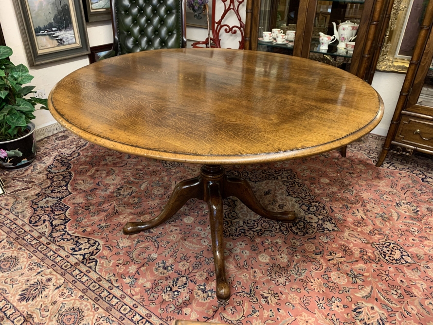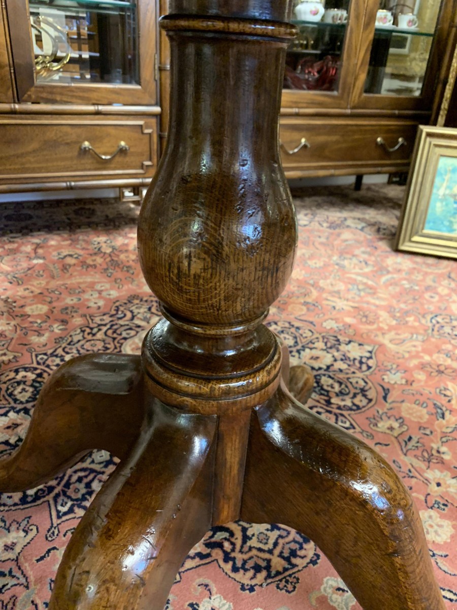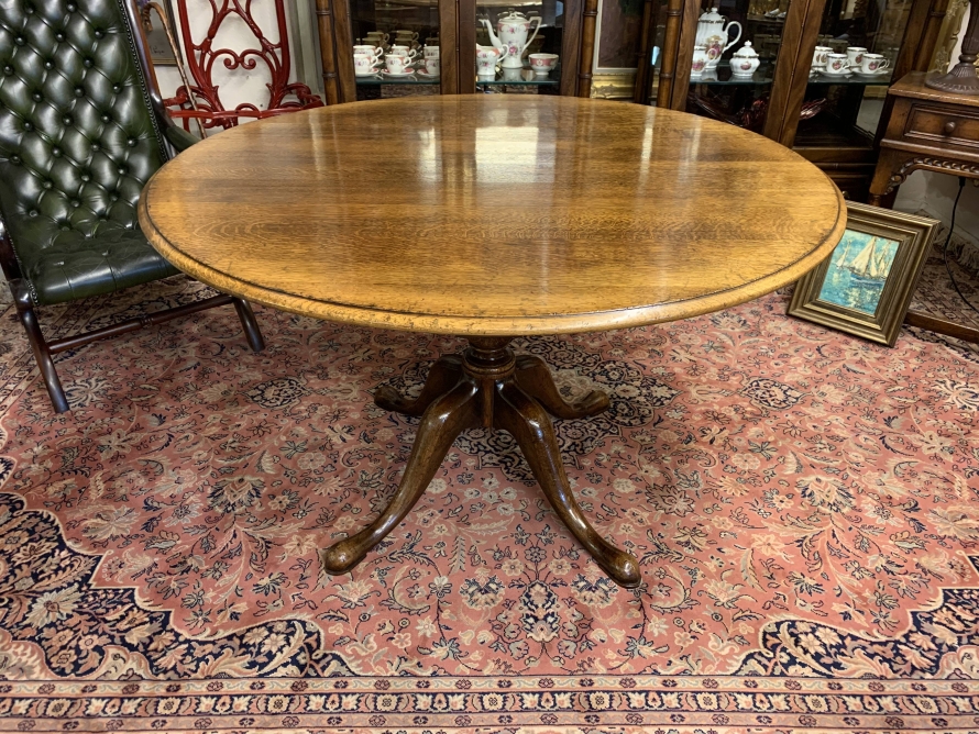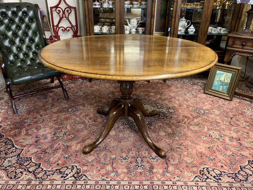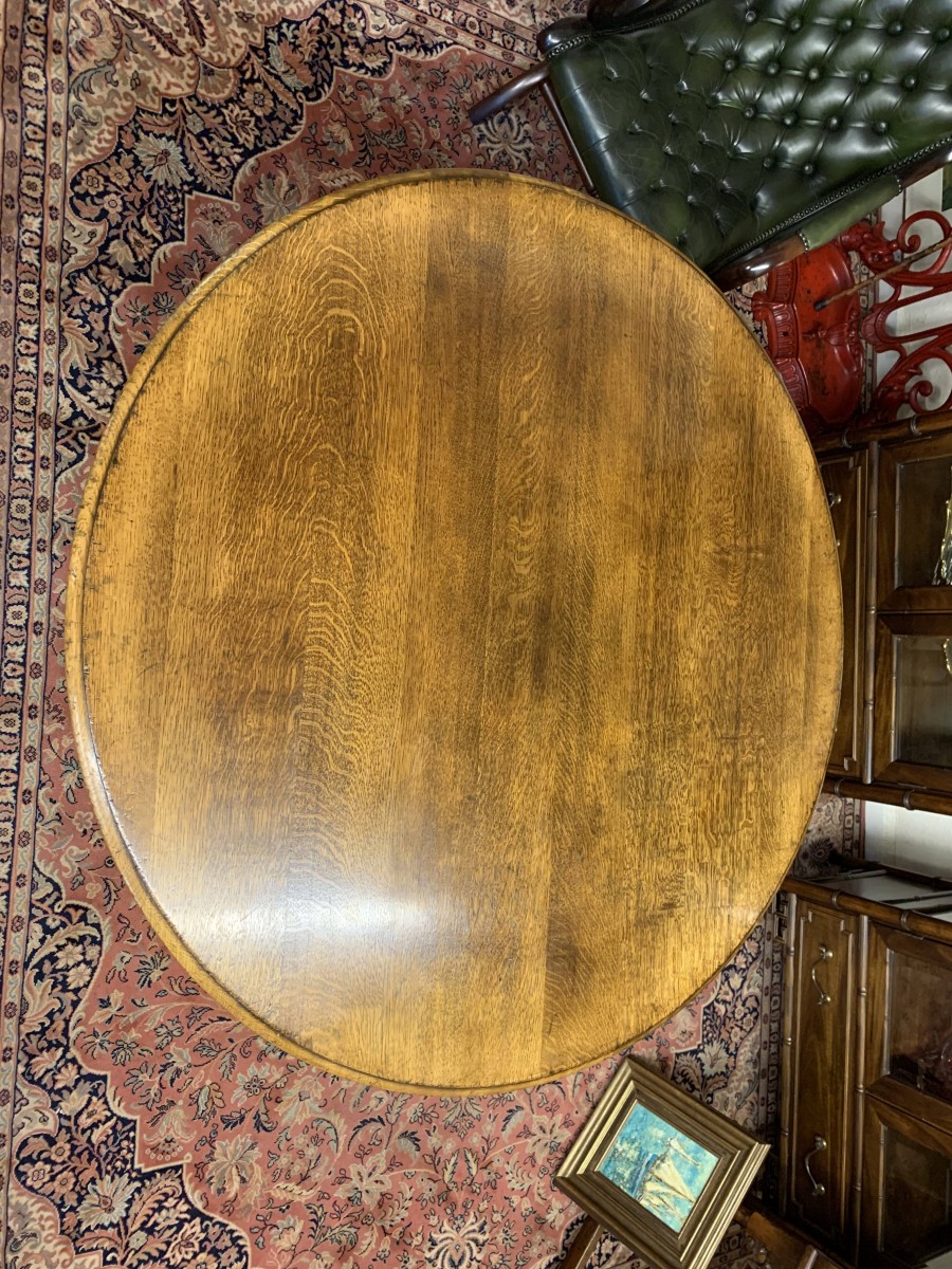 This fantastic quality table is made in glorious oak by the renowned Titchmarsh & Goodwin furniture makers. Having a round edged top on a turned pedestal base with four sweeping legs on pad feet.