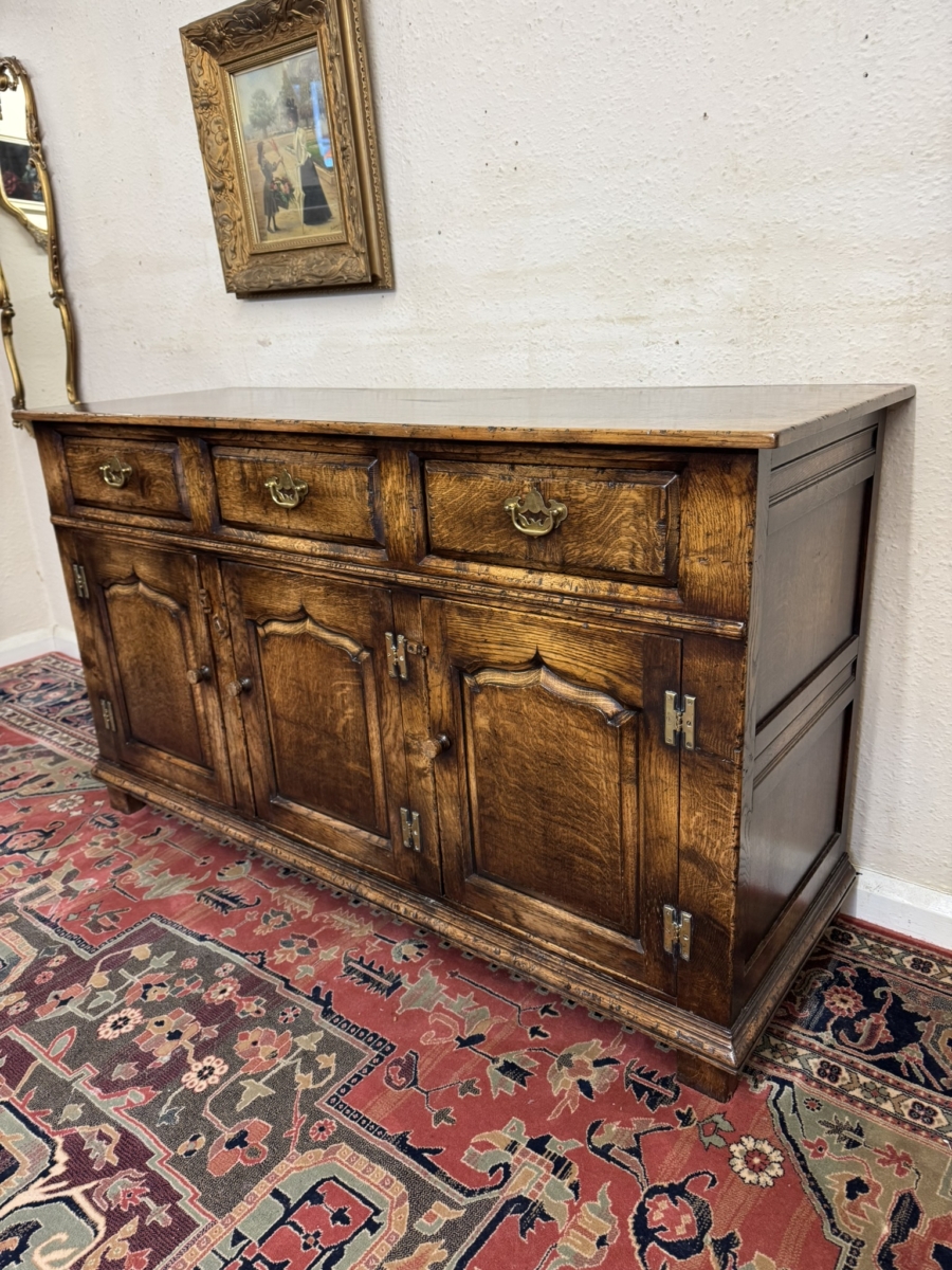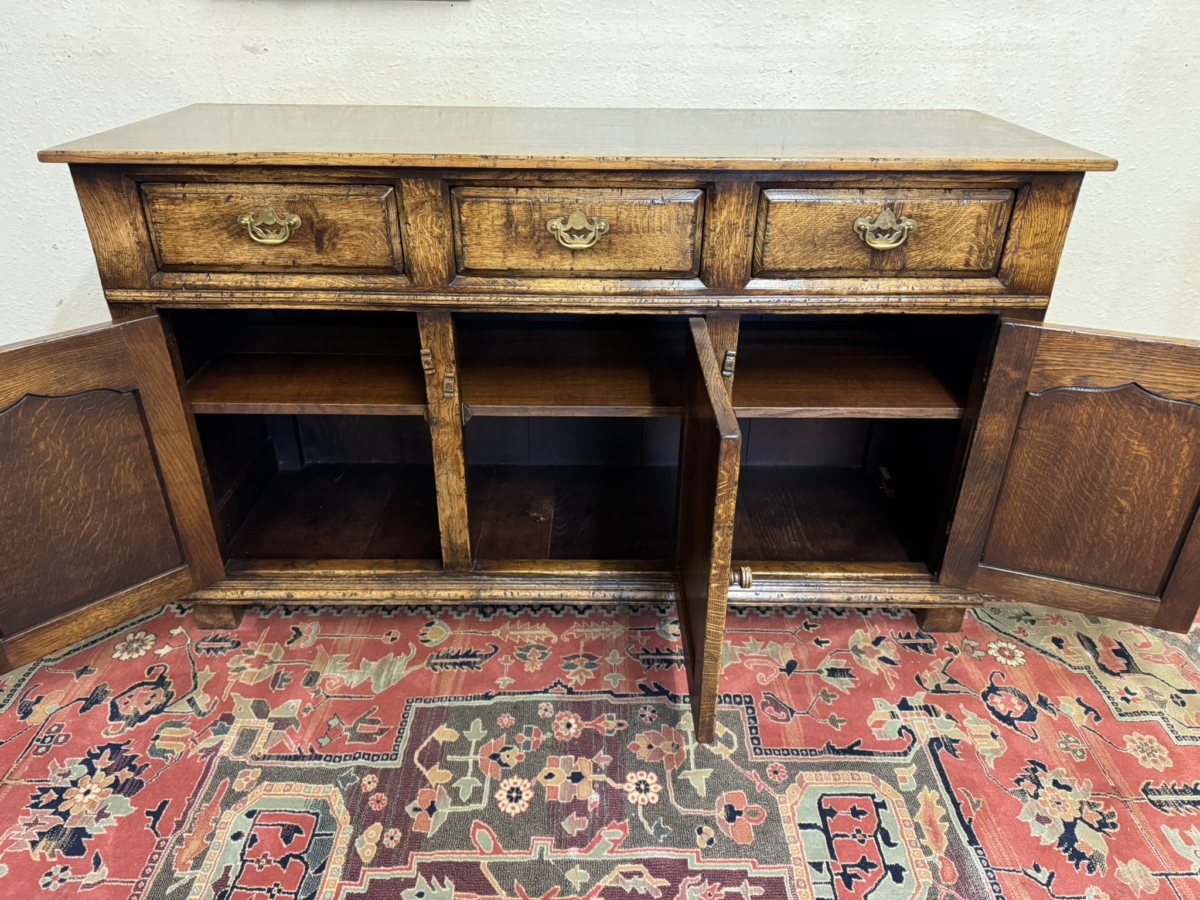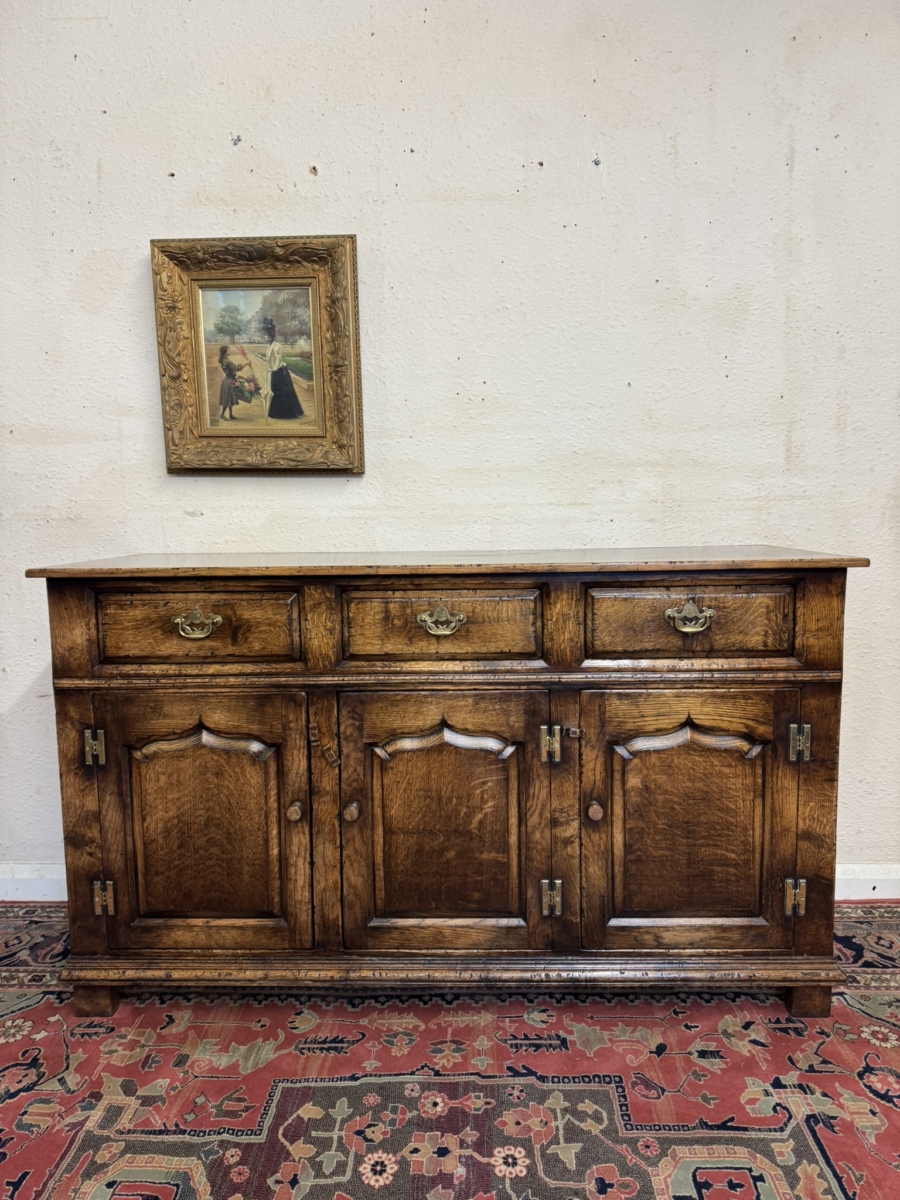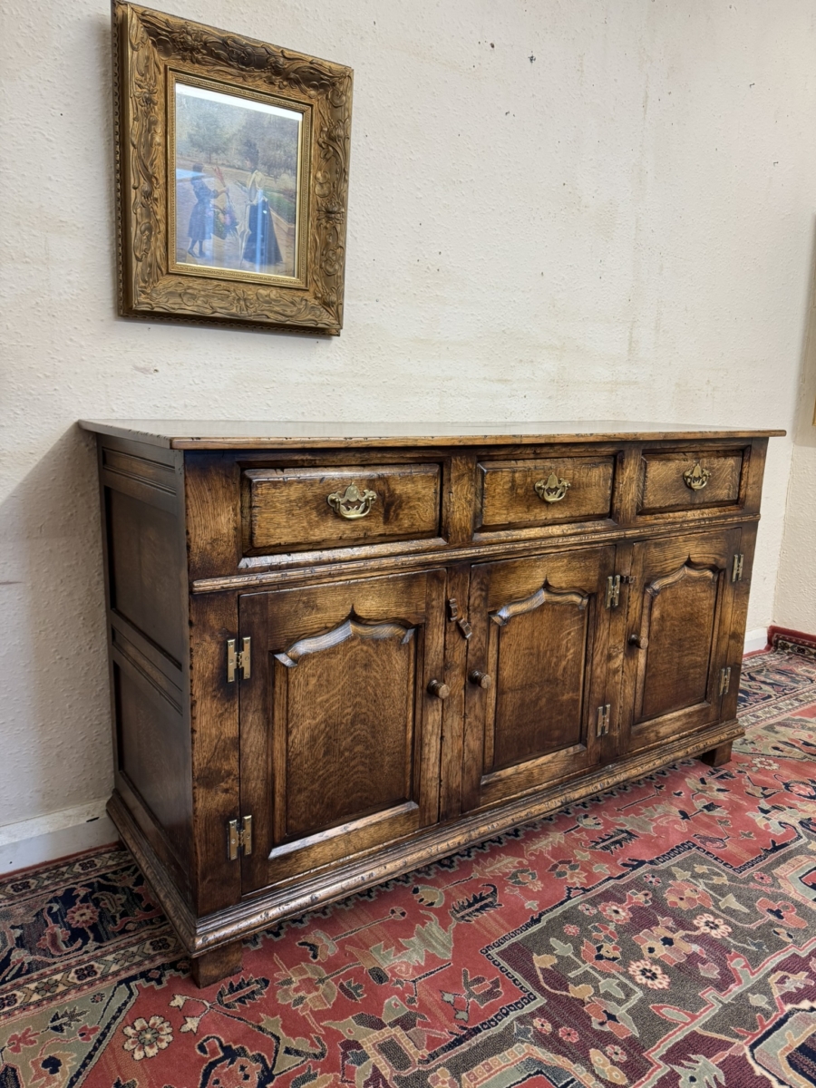This fabulous sideboard is made entirely in solid oak is in excellent condition. The over sailing top sits above three drawers, each drawer having a brass handle, below are three lockable shaped fielded panelled cupboard doors, each door having brass H hinges, turned wood handle and wood locking latch. The doors open to reveal a boarded back and base and a removable wooden shelf. Recessed panelled sides prominent skirt and standing on four traditional block feet.