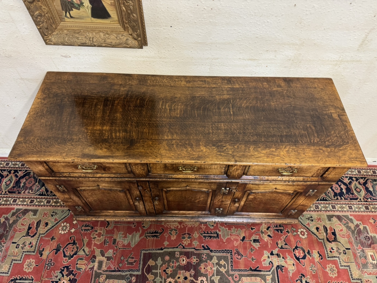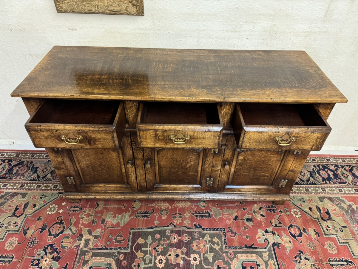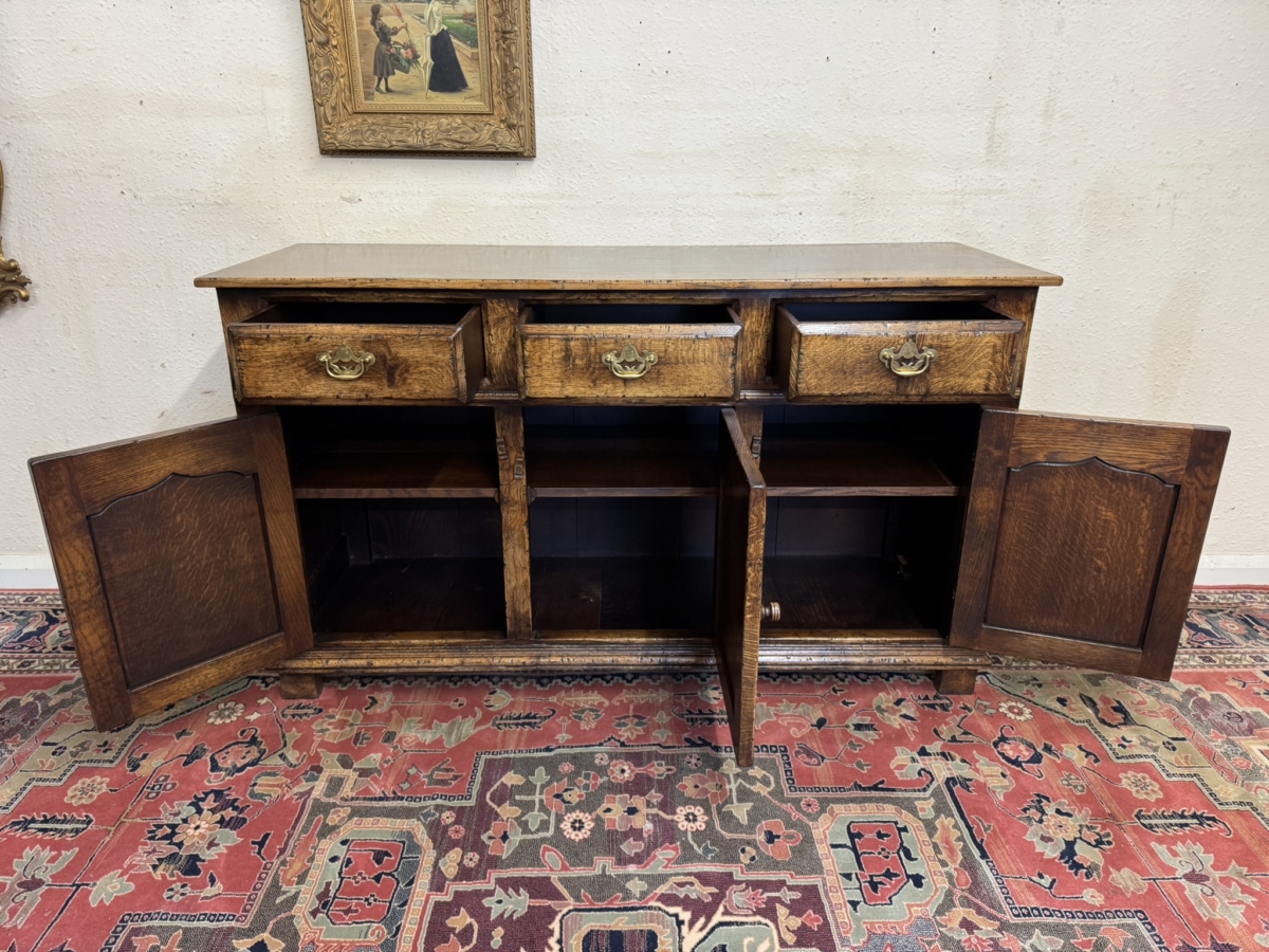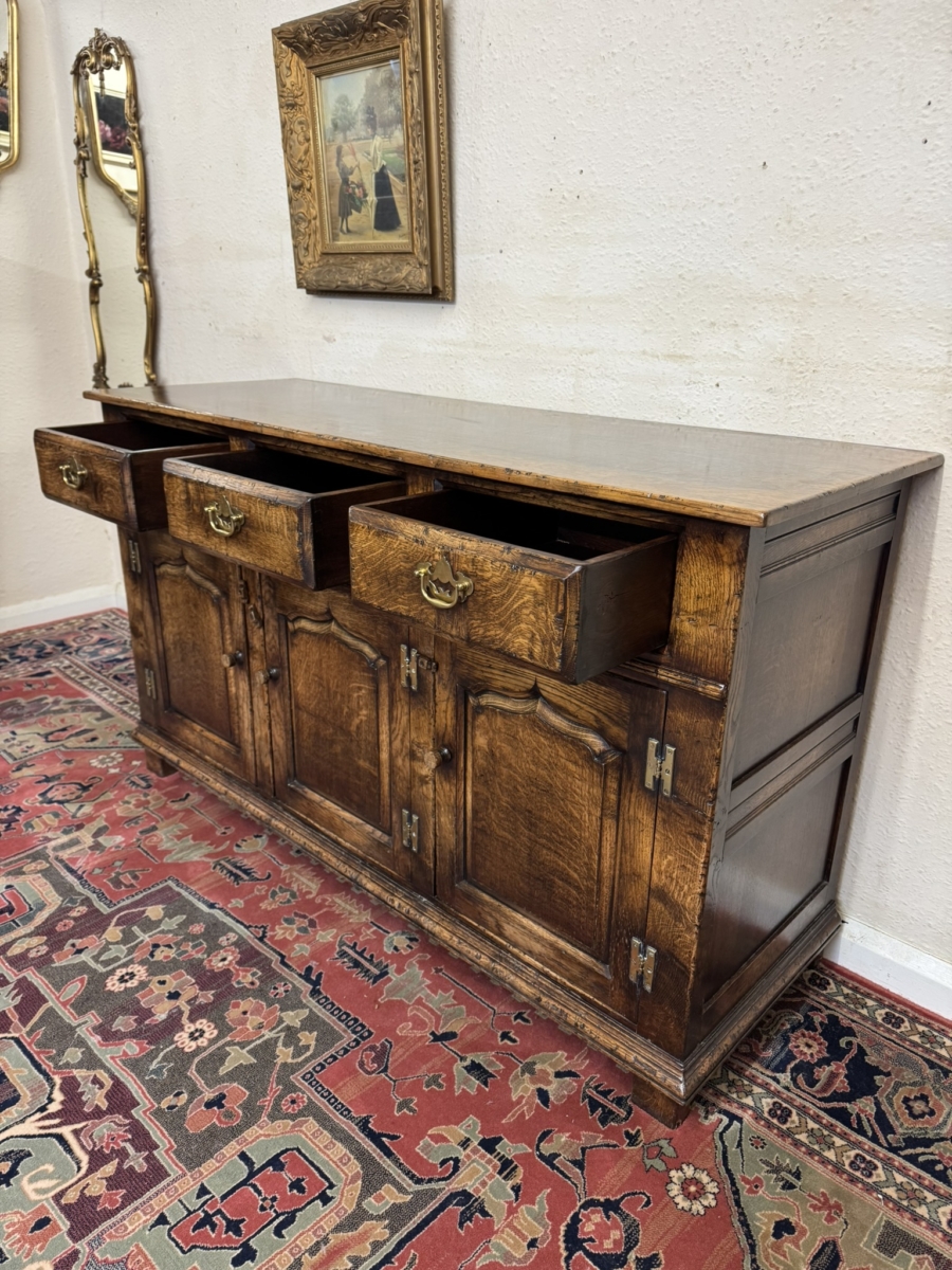 This fabulous sideboard is made entirely in solid oak is in excellent condition. The over sailing top sits above three drawers, each drawer having a brass handle, below are three lockable shaped fielded panelled cupboard doors, each door having brass H hinges, turned wood handle and wood locking latch. The doors open to reveal a boarded back and base and a removable wooden shelf. Recessed panelled sides prominent skirt and standing on four traditional block feet.