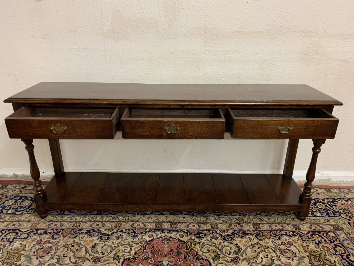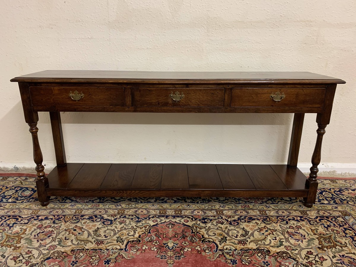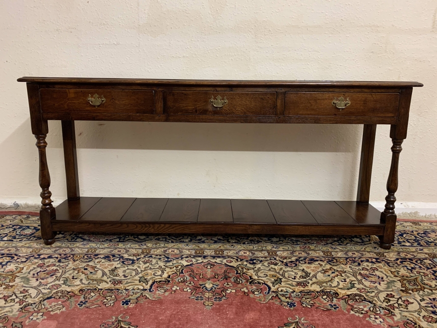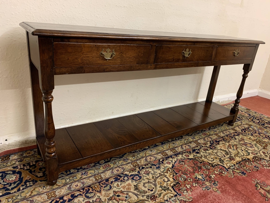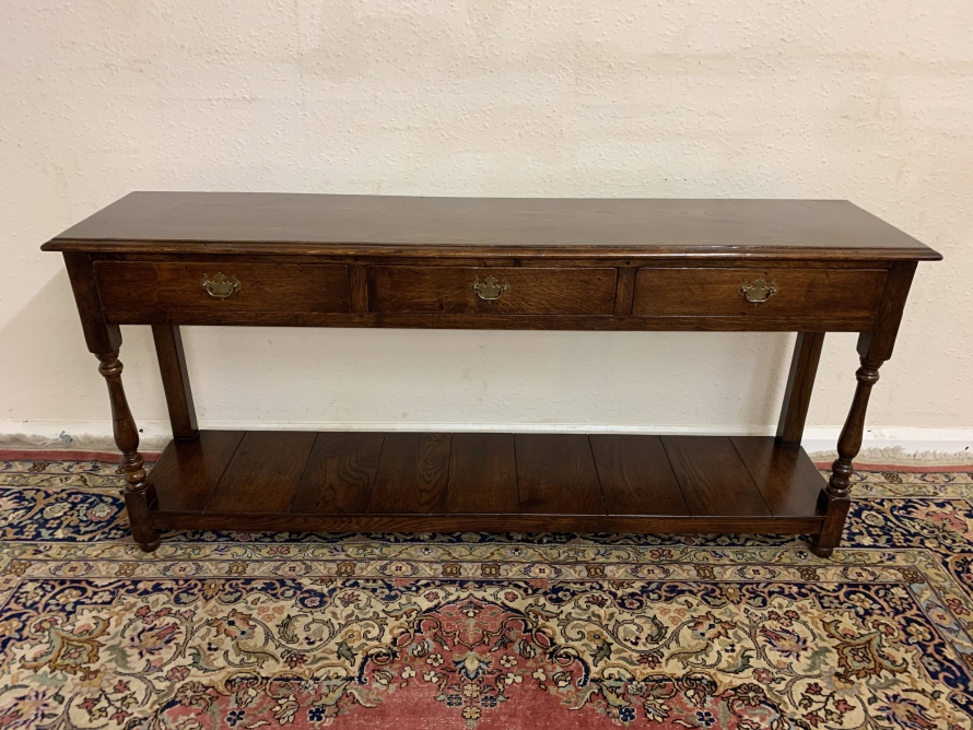 Made entirely of glorious solid oak and in excellent condition. The oversailing top sits above three drawers, each drawer having a brass handle. Having a planked oak potboard base and standing on fine turned legs to the front.