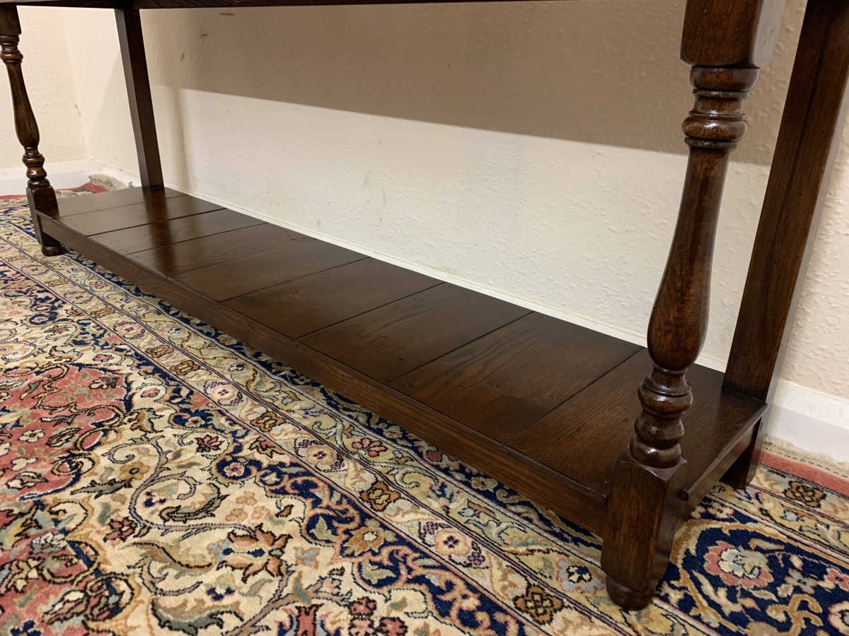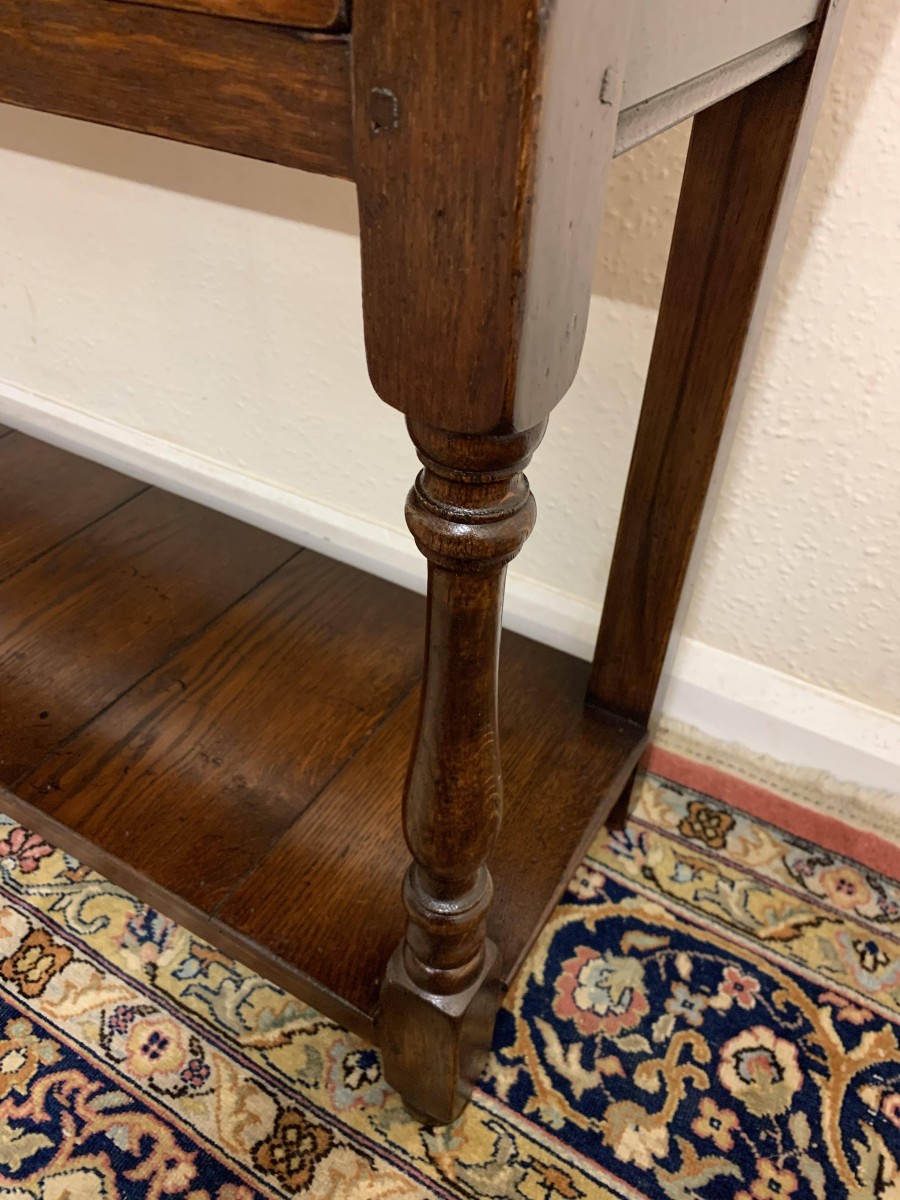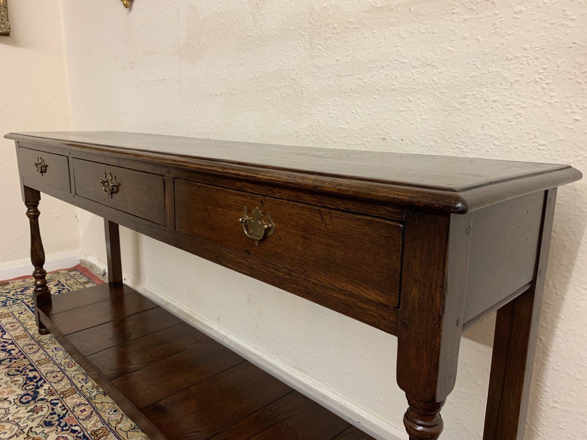 Made entirely of glorious solid oak and in excellent condition. The oversailing top sits above three drawers, each drawer having a brass handle. Having a planked oak potboard base and standing on fine turned legs to the front.