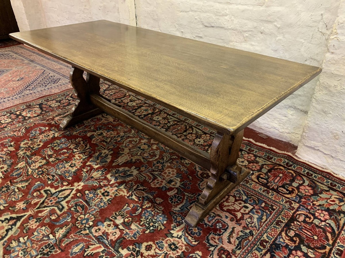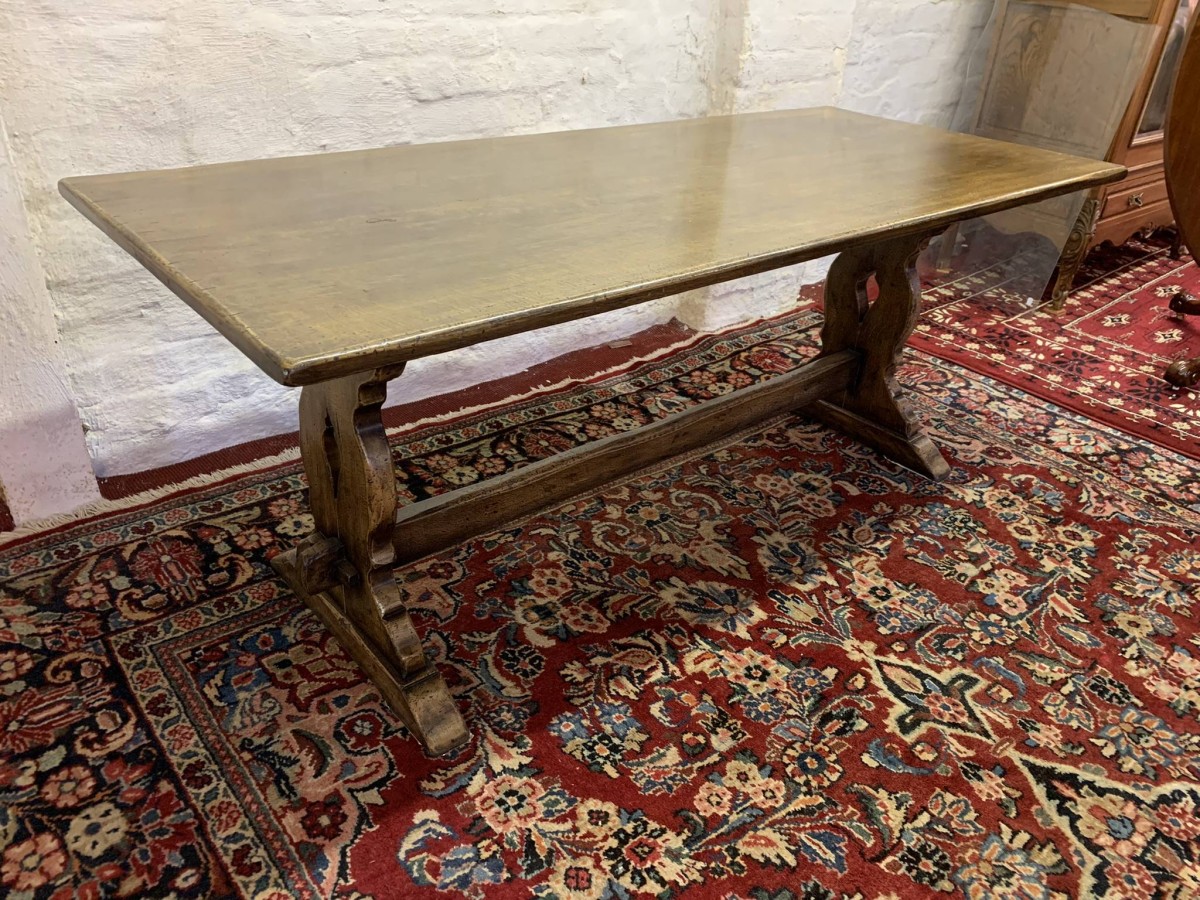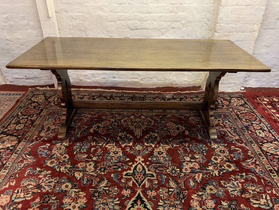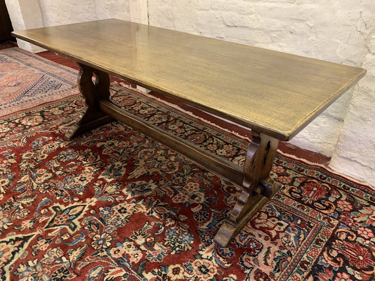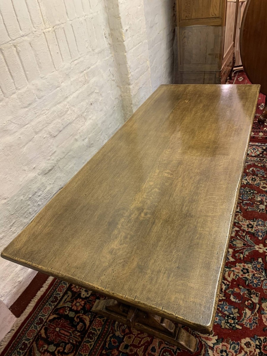 Made entirely in glorious solid oak the table was produced by the renowned Titchmarsh & Goodwin furniture makers and is in excellent condition. The plank top sits on two shaped supports with a fabulous stretcher support.