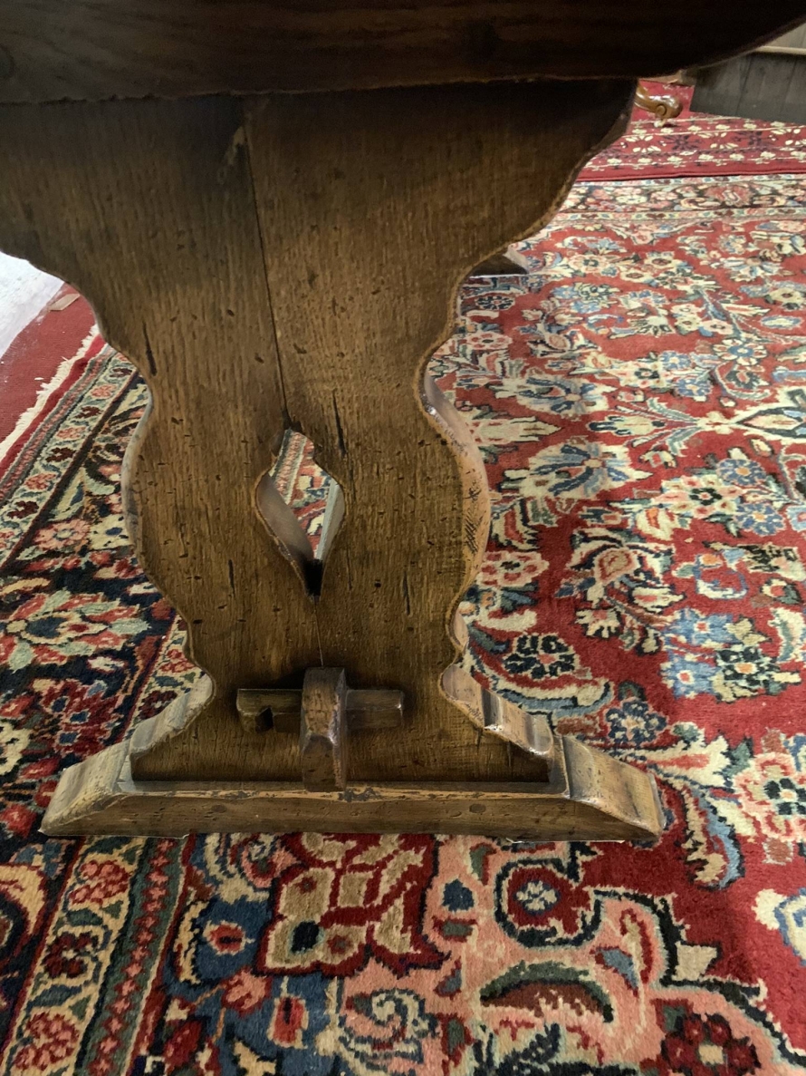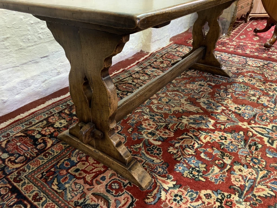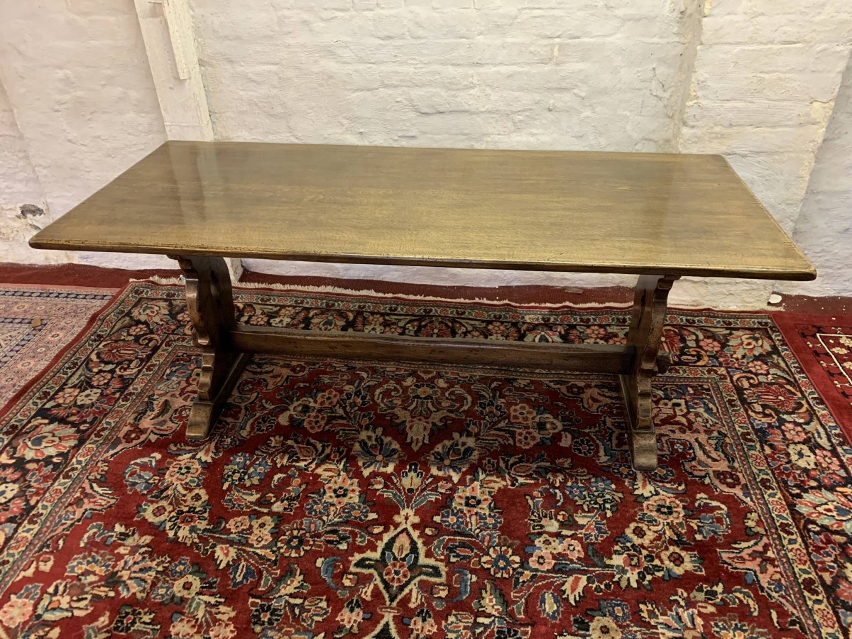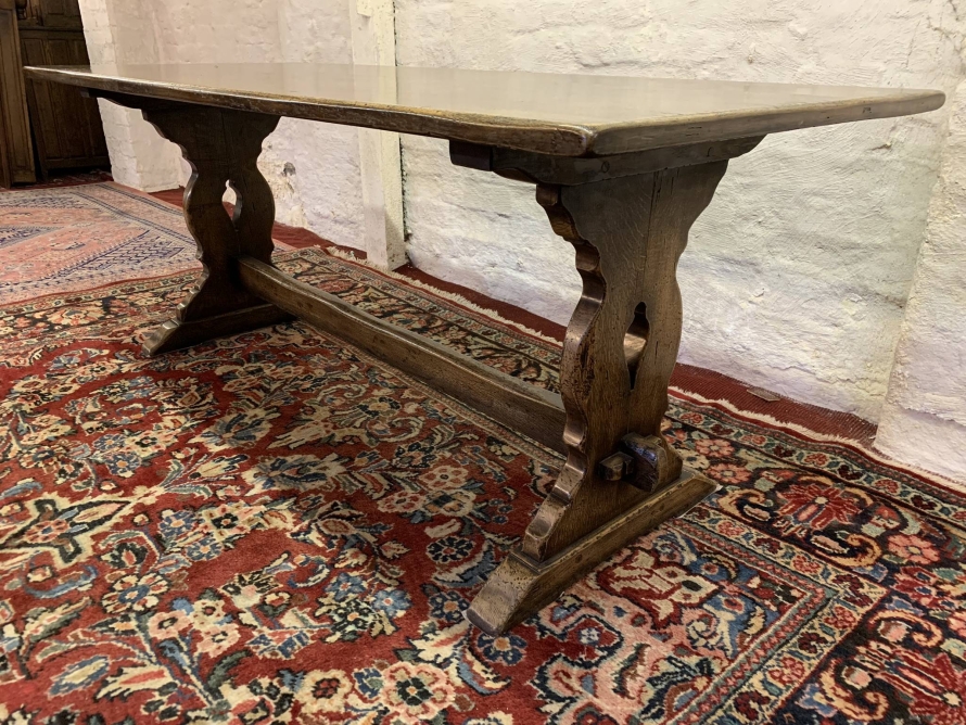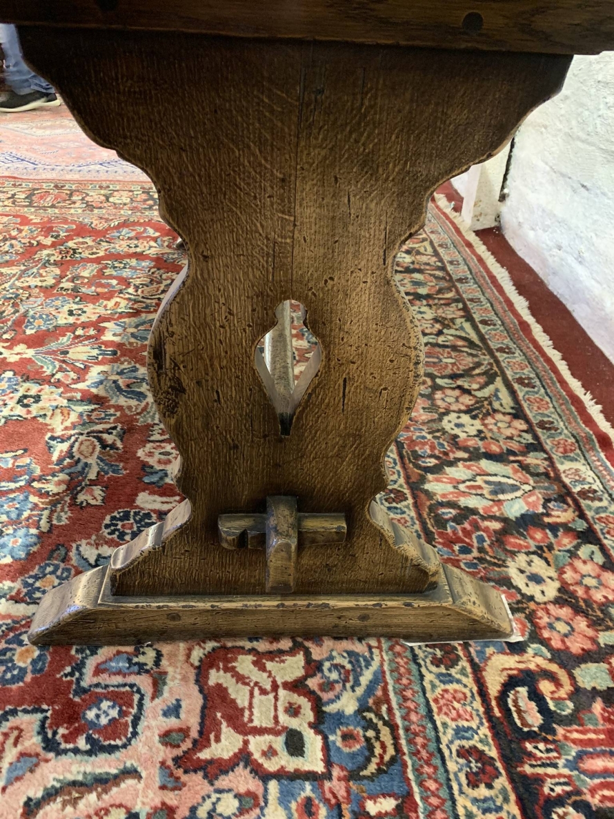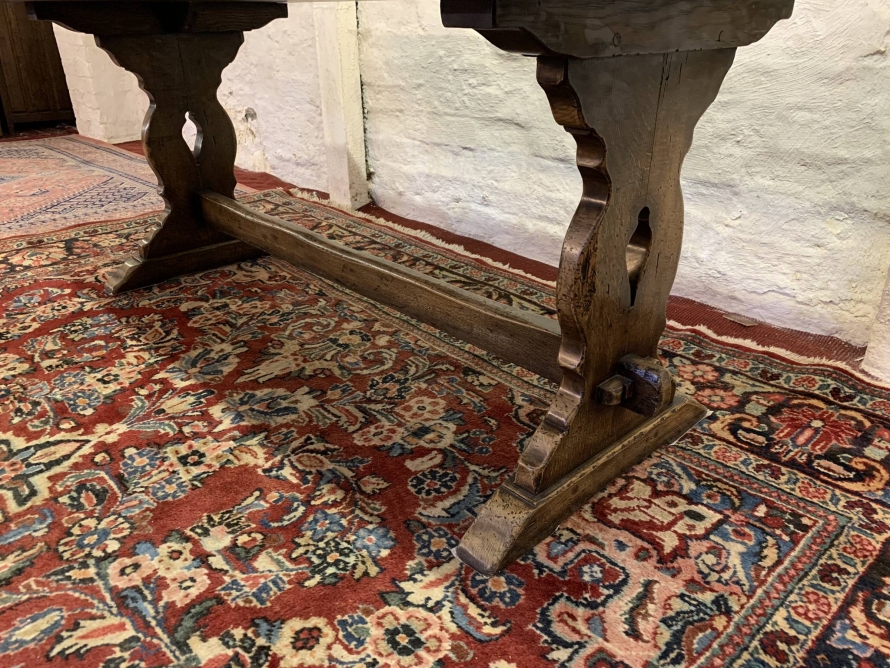 Made entirely in glorious solid oak the table was produced by the renowned Titchmarsh & Goodwin furniture makers and is in excellent condition. The plank top sits on two shaped supports with a fabulous stretcher support.