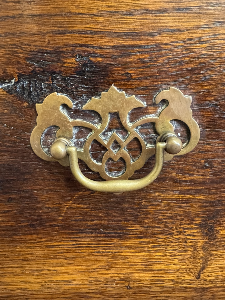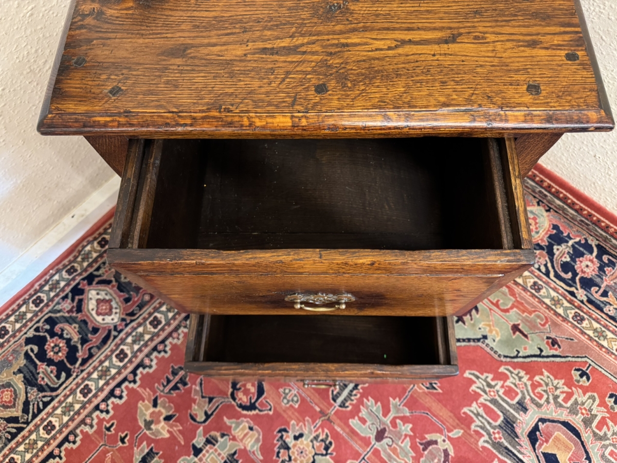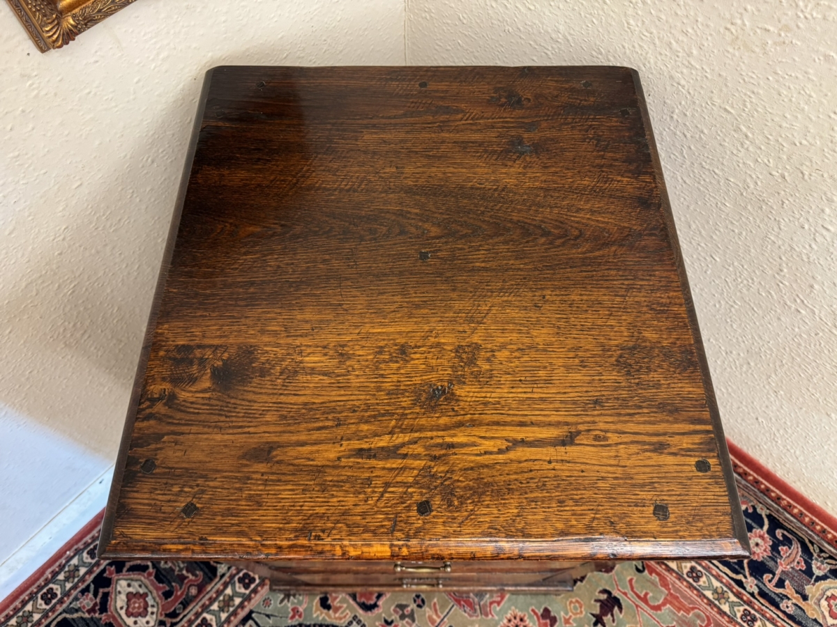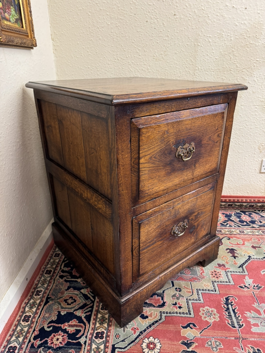 Made in striking oak and peg jointed throughout, the drawers are in excellent condition. Over sailing top sits above a pair of deep filing drawers, each drawer having a brass handle. Panelled sides and standing on bracket feet.