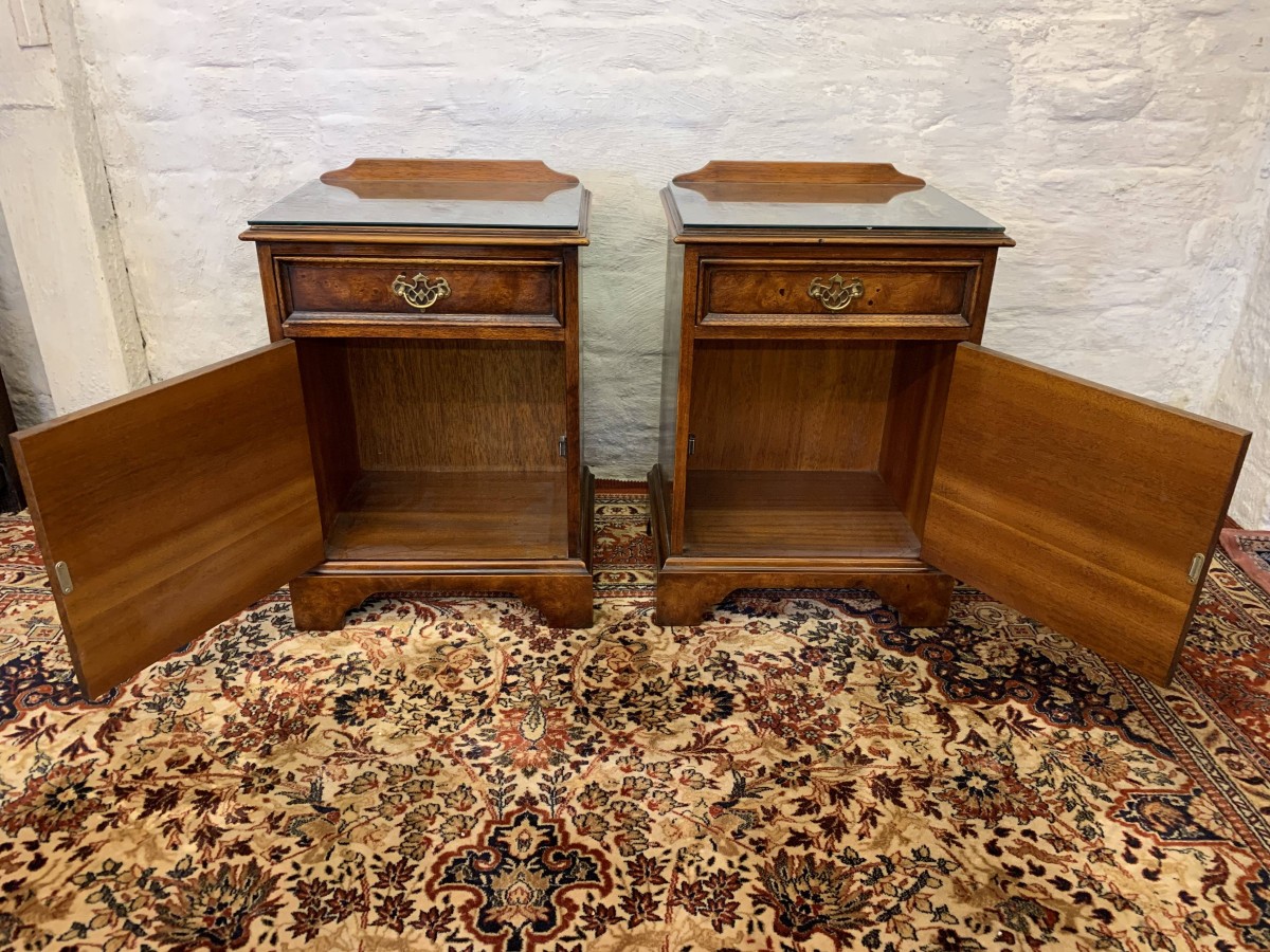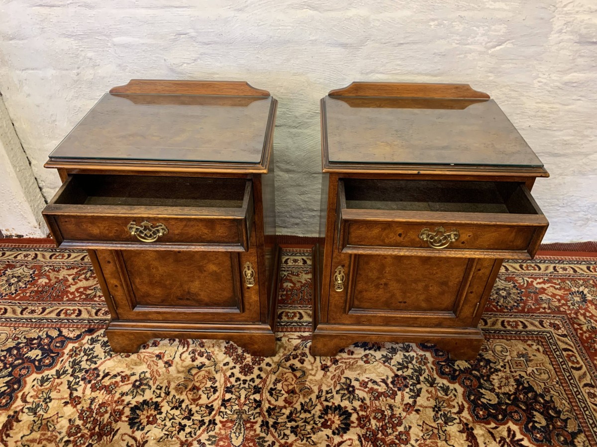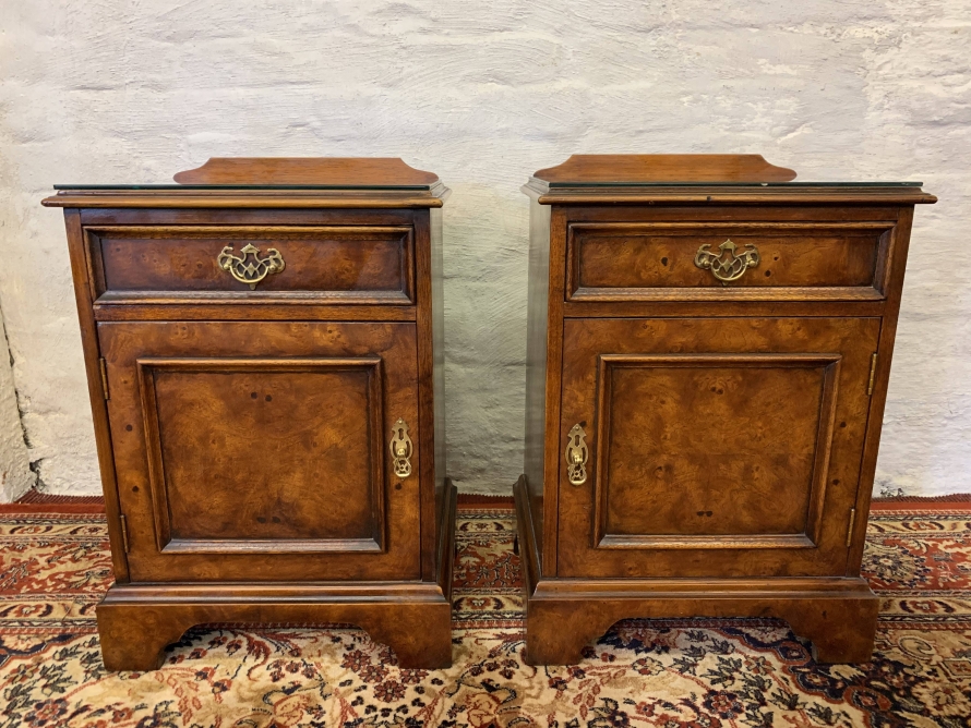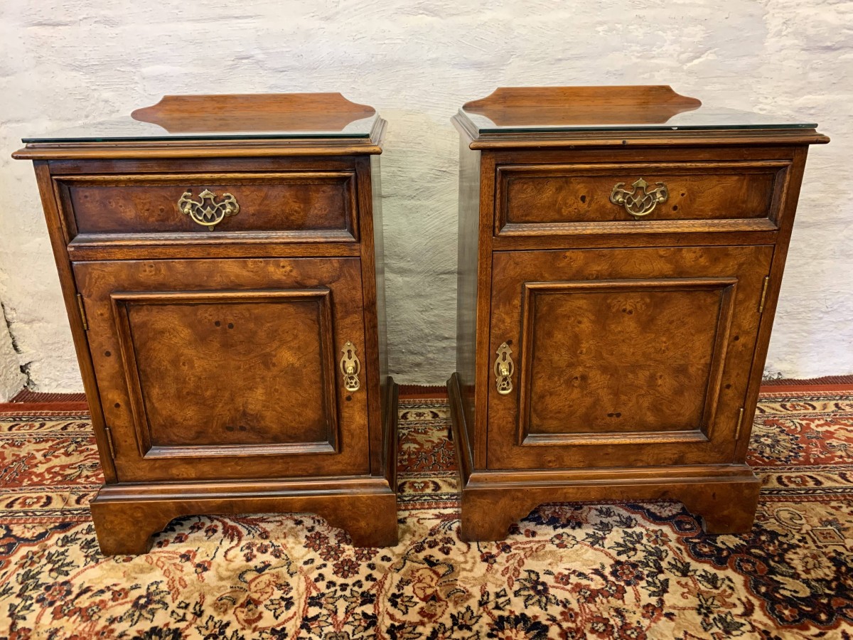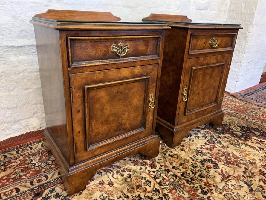 This fabulous pair of burr walnut bedside cabinets are in excellent condition. Upstand to the back, string inlay decoration to the top each with removable glass protectors. Below is a drawer with a decorative brass handle, below is a cupboard door, the door having a brass drop handle. This fabulous pair of cabinets stand on four bracket feet.