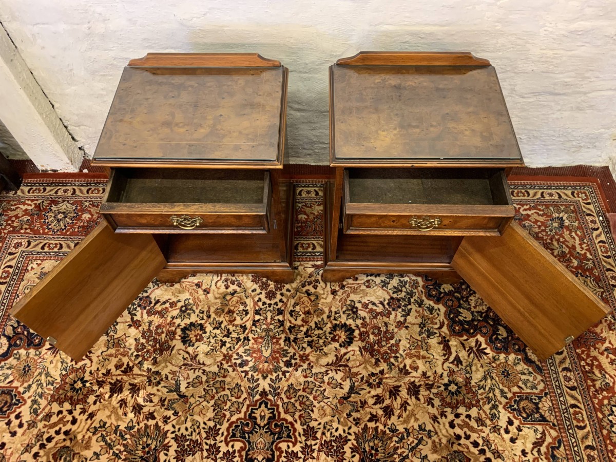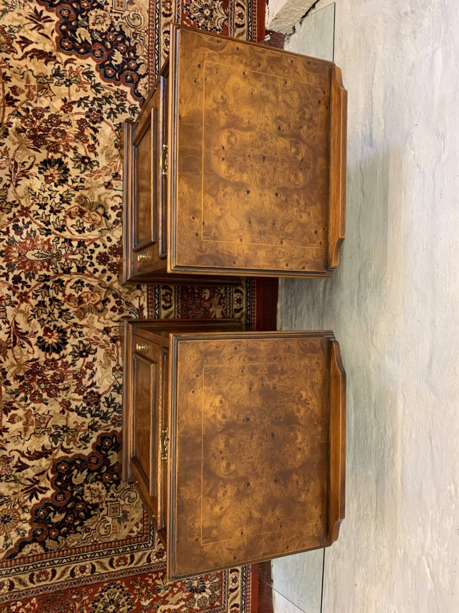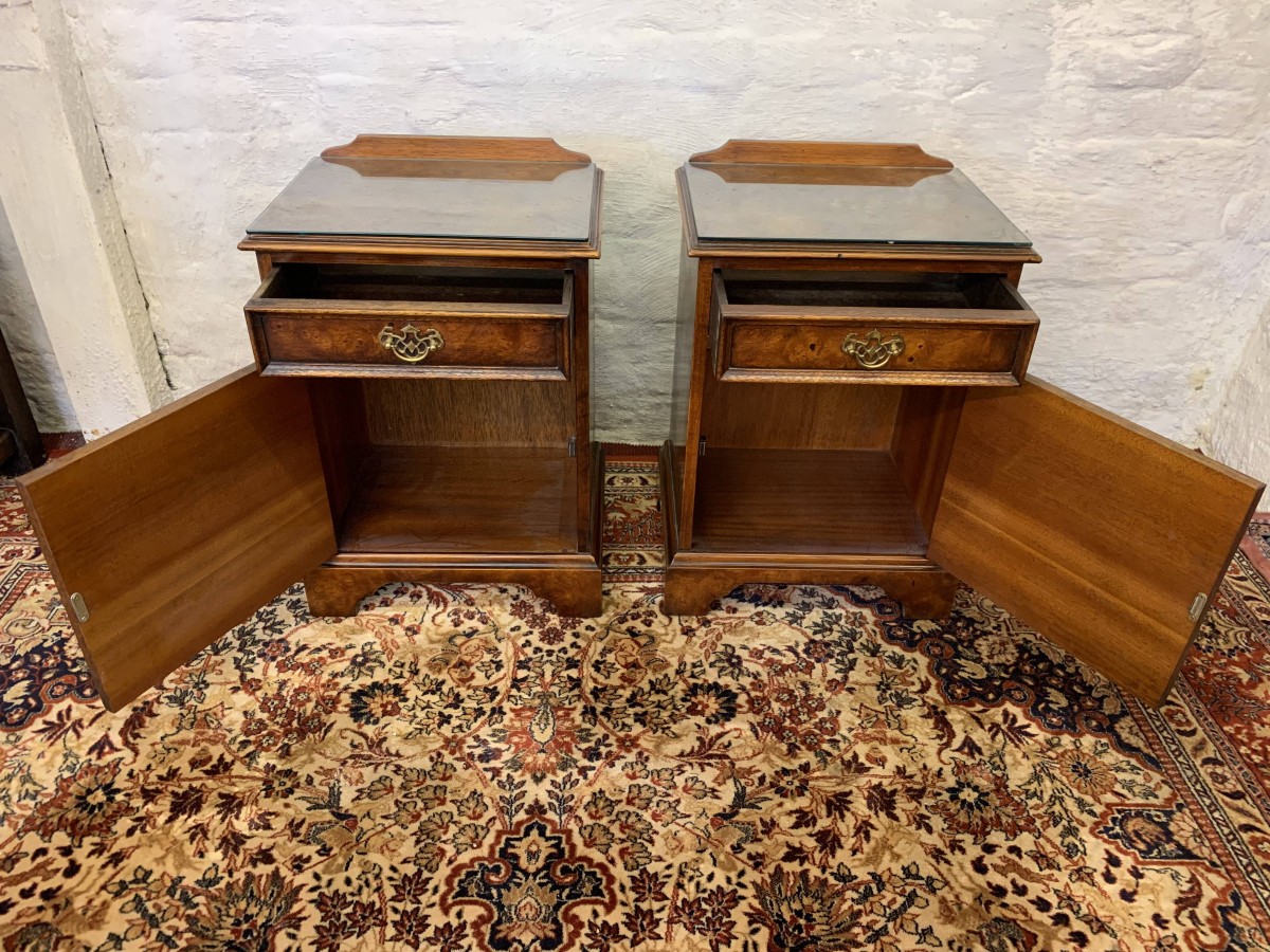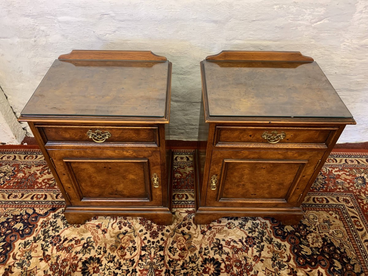 This fabulous pair of burr walnut bedside cabinets are in excellent condition. Upstand to the back, string inlay decoration to the top each with removable glass protectors. Below is a drawer with a decorative brass handle, below is a cupboard door, the door having a brass drop handle. This fabulous pair of cabinets stand on four bracket feet.